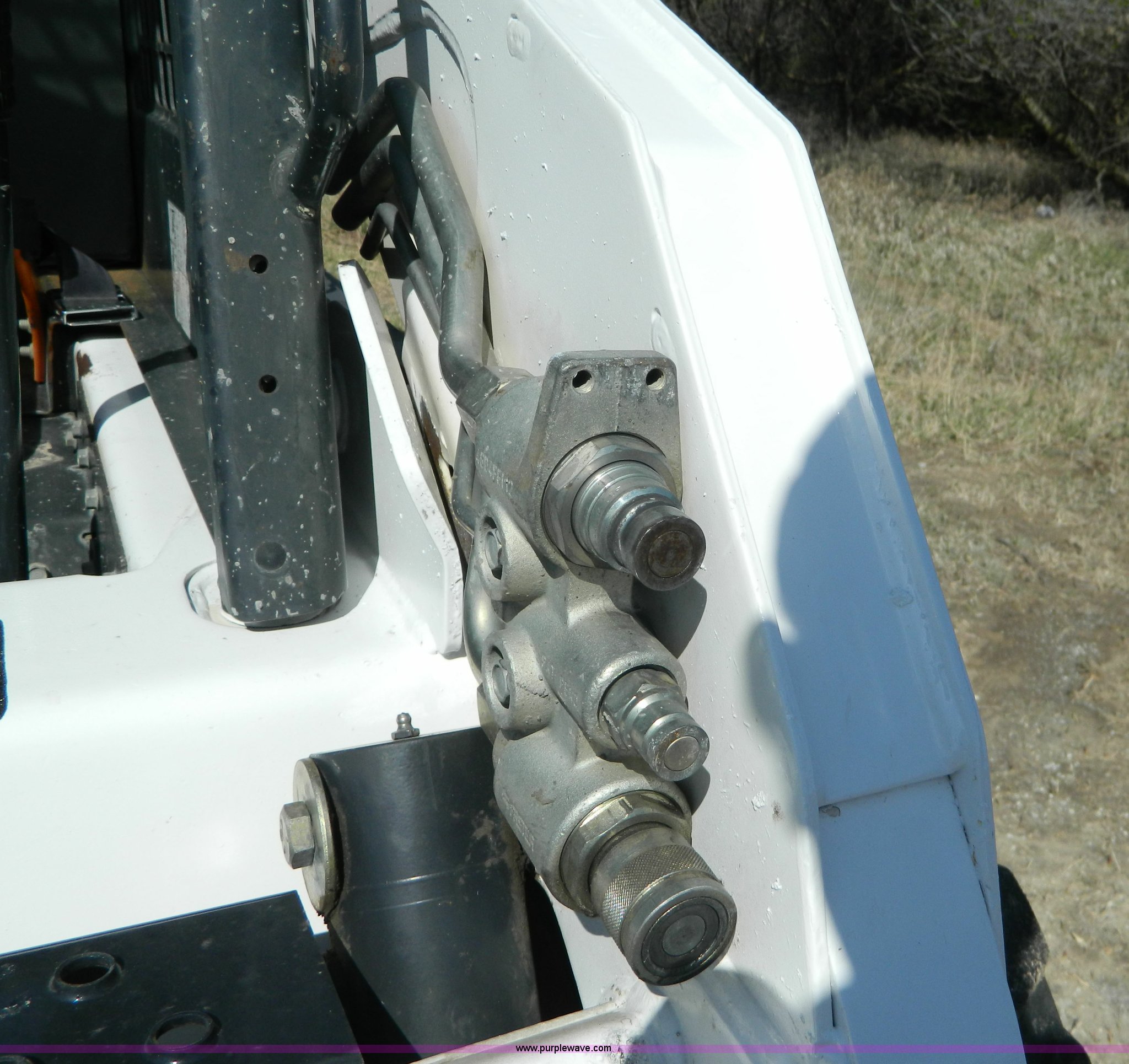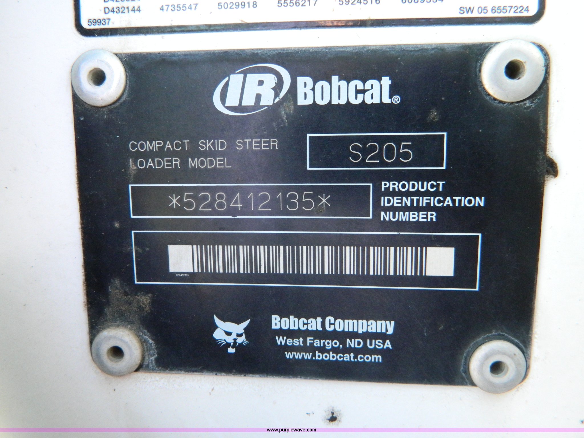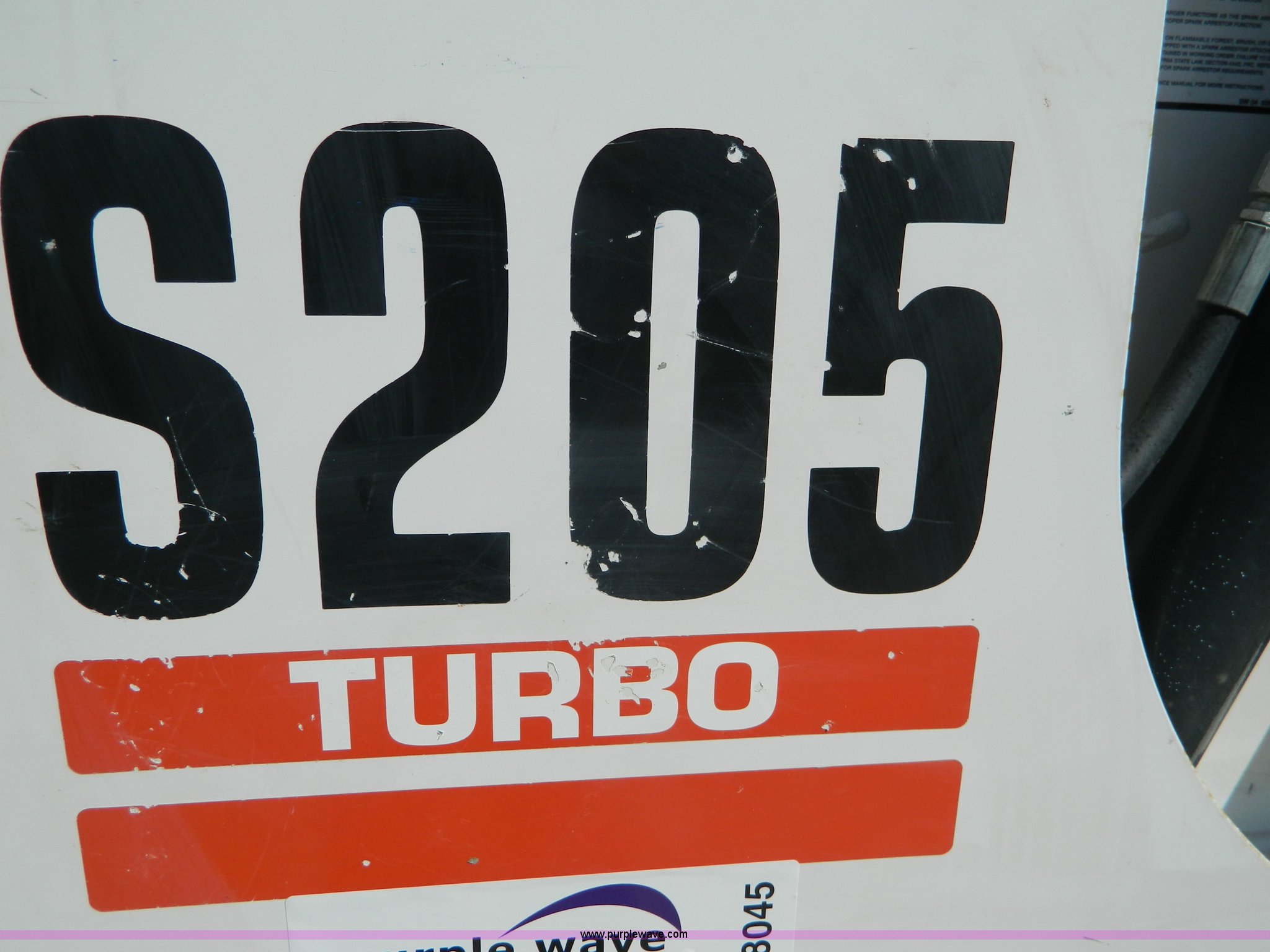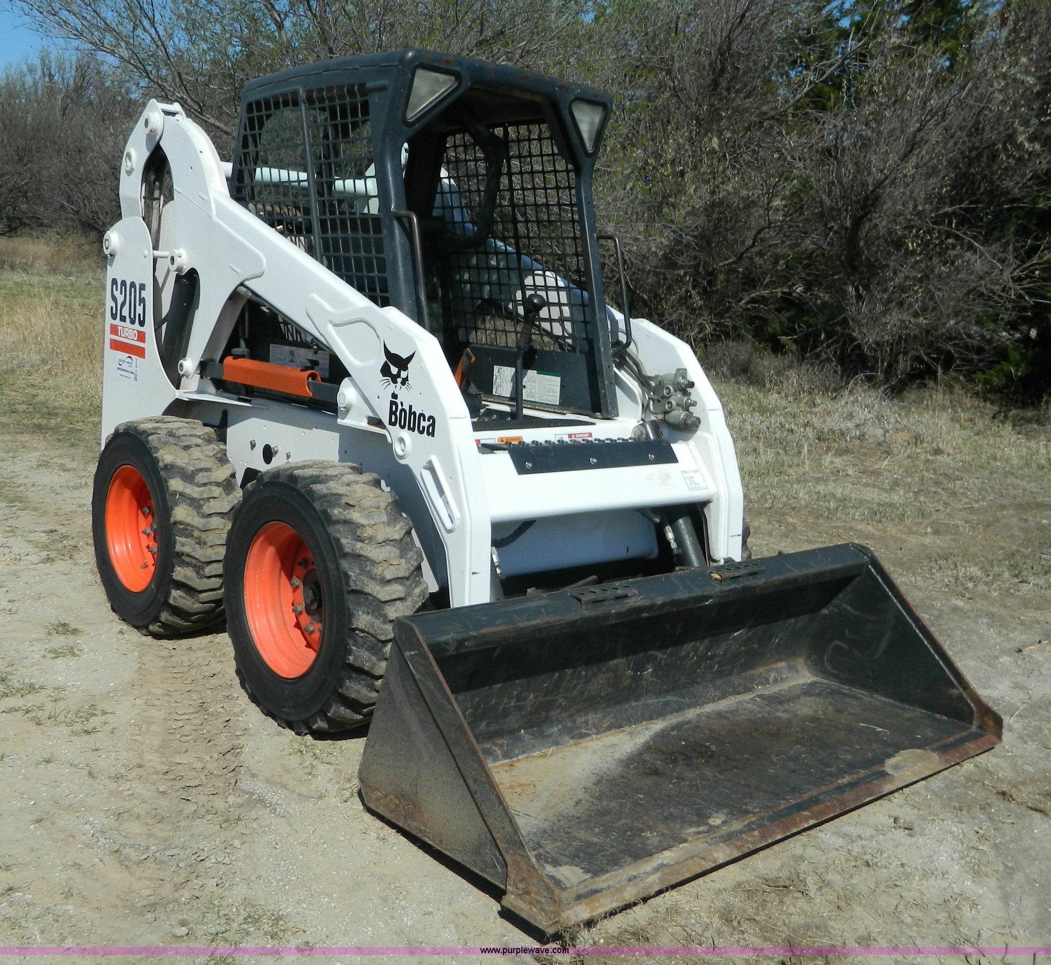 Purple Wave is selling a used Skid Steer Loader in Kansas. This item is a 2005 Bobcat S205 skid steer with the following: 1,624 hours on meter, Kubota V2403 four cylinder turbo diesel engine, Serial 0440088, Hydrostatic transmission, Hand and foot controls, 6'W bucket, Weld-on cutting edge, High flow auxiliary hydraulics, Manual quick coupler, Bobcat 10-16.5 tires, 6,655 lbs. base operating weight, Unit serviced at 1,614 hours, Serial 528412135