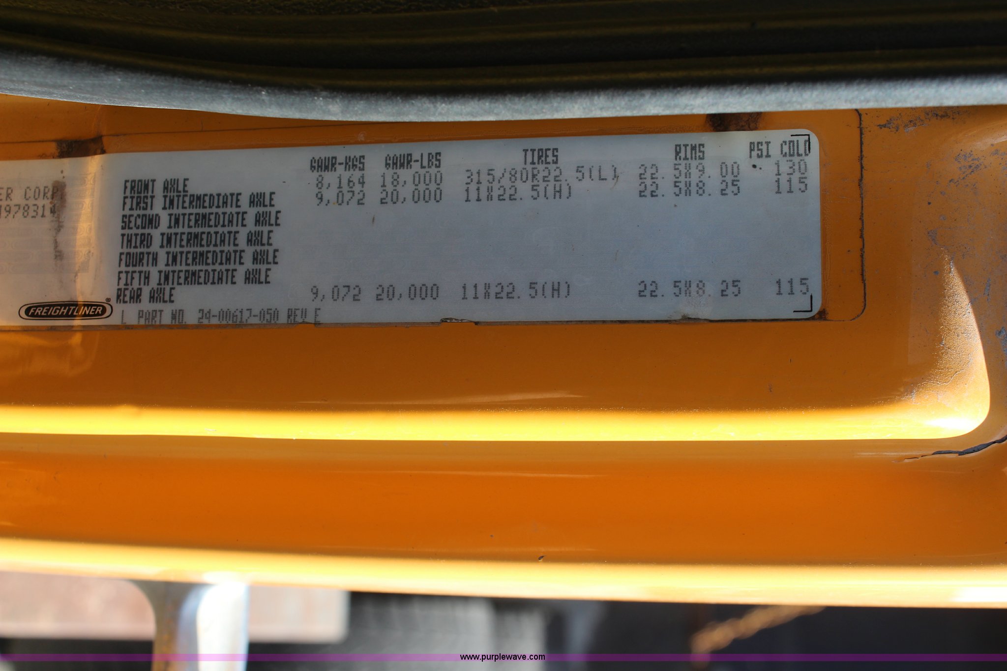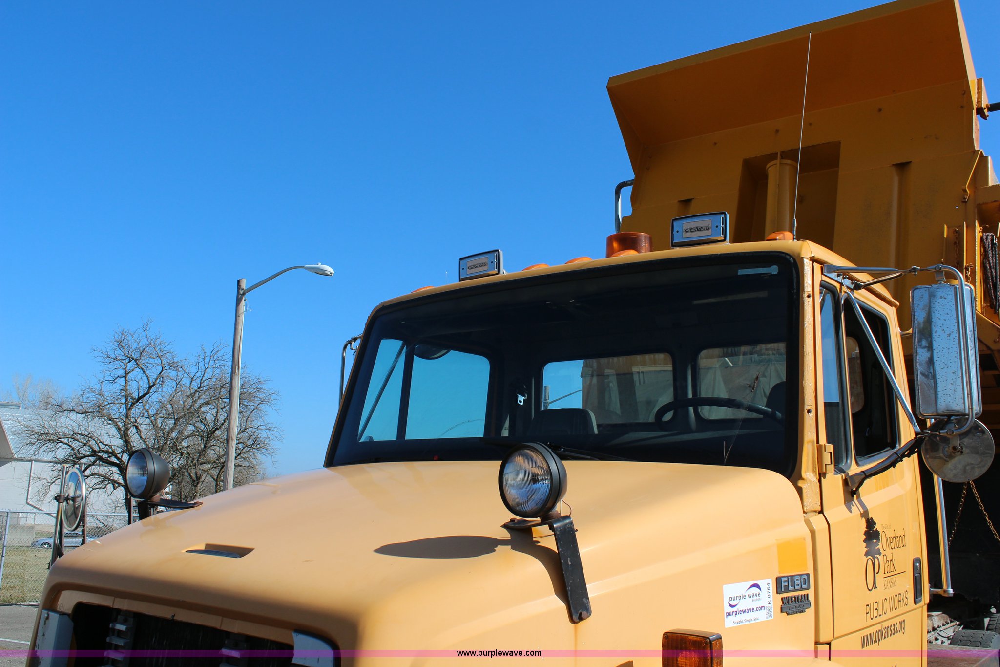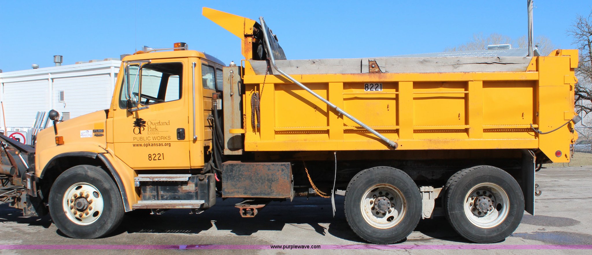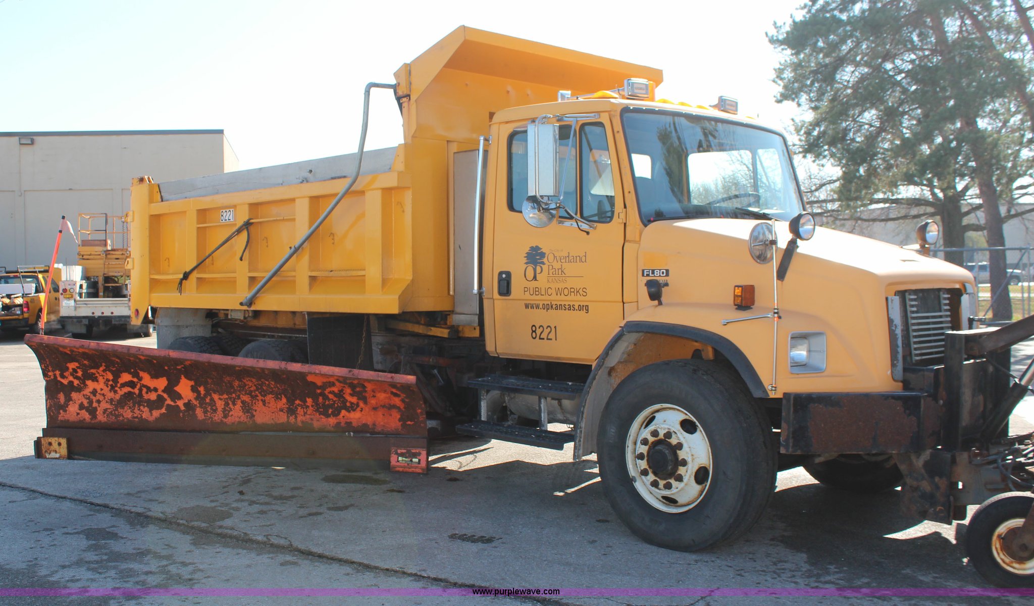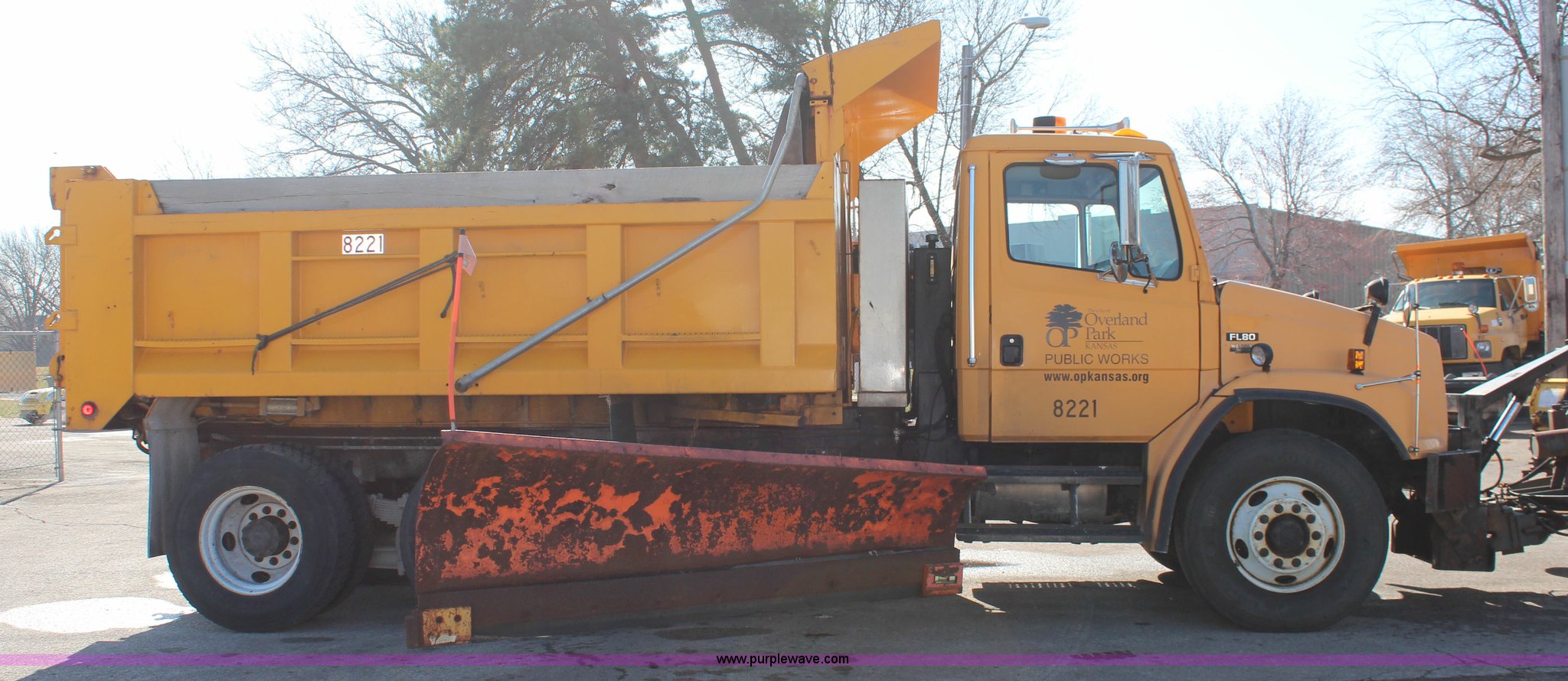 1999 Freightliner FL80 dump truck. 86,775 miles on odometer, 6,097 hours on meter. Caterpillar 3126 7.2L L6 diesel engine 250 HP, Allison automatic transmission, AC and heat, Tilt, Cruise, AM/FM, Telescoping steering wheel, Air suspension seat, 14'L spreader dump bed Dickey John spreader monitor, Air end gate, Tarp, Single ram hoist, Henke 11' plow, Coats 9' wing plow, Stainless steel calcium tank, 45 gallon fuel tank, PTO, Spring suspension, Air brakes, 315/80R22.5 front tires, 11R22.5 rear tires, GVWR 58,000 lbs, FAWR 18,000 lbs, IAWR 20,000 lbs, RAWR 20,000 lbs. Seller is a government entity who will be assigning and distributing the title. Please contact the seller for distribution questions. 1FVXJJBB1XH978314. City of Overland Park. 11300 W 91st St. Overland Park, KS 66212