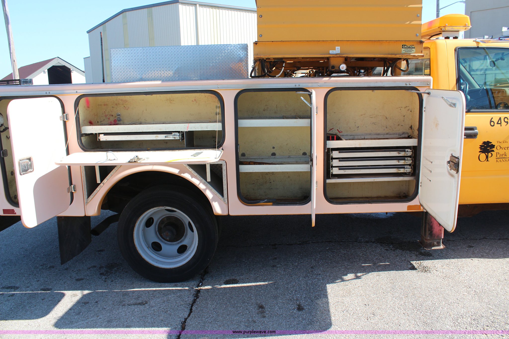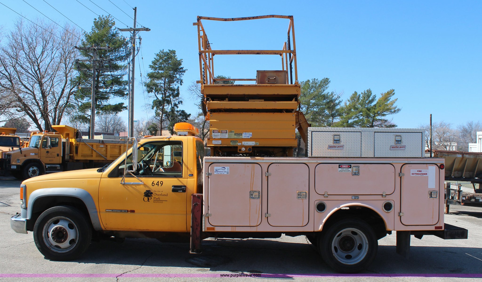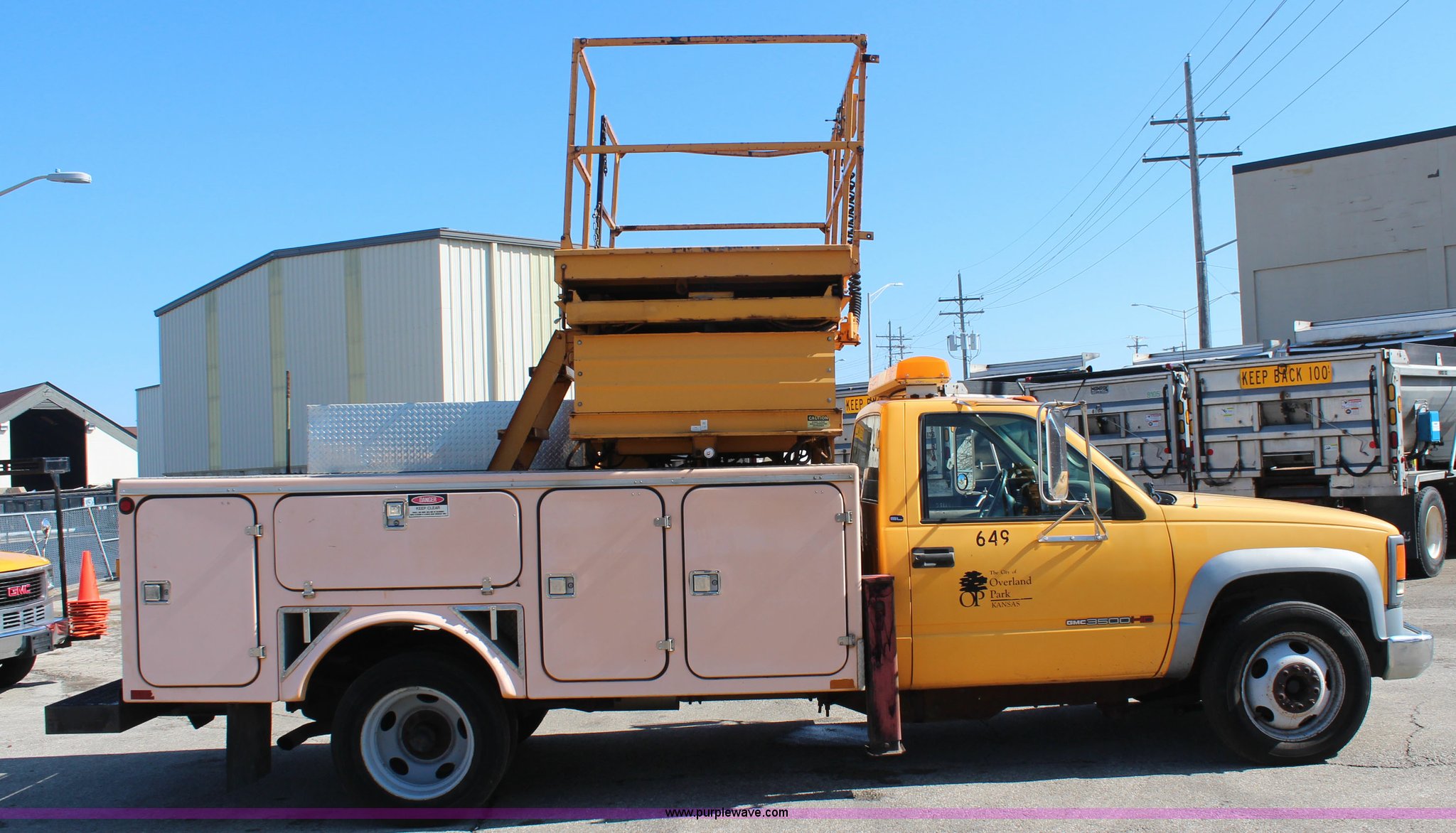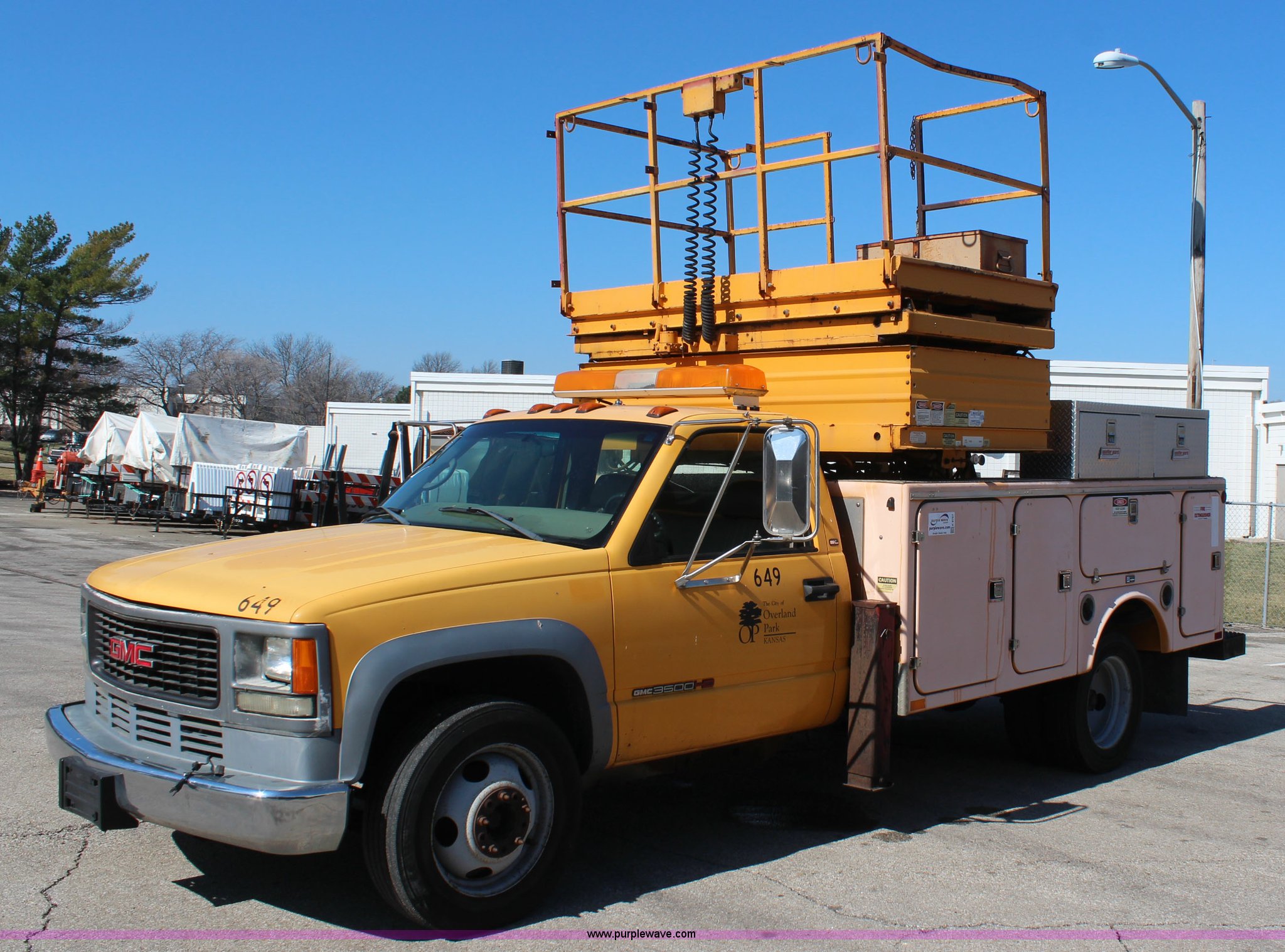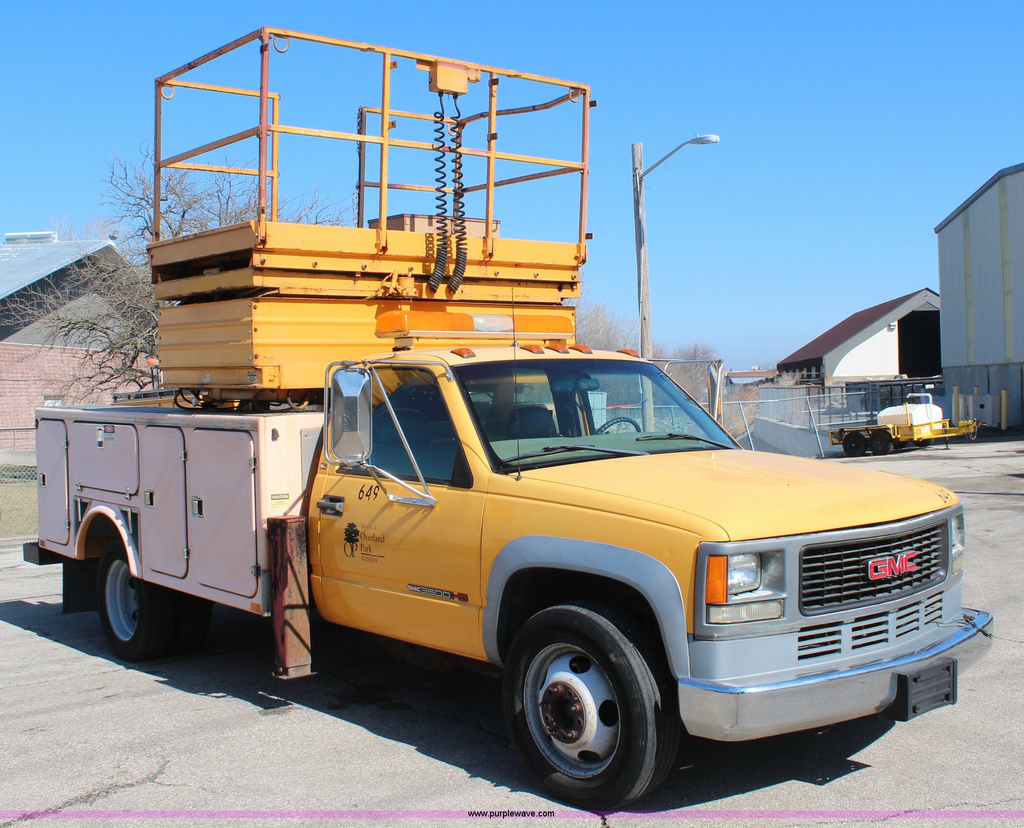 1998 GMC Sierra 3500HD utility truck with scissor lift. 92,748 miles on odometer, 6,419 hours on meter, 6.5L V8 OHV 16V diesel engine, Automatic transmission, AC and heat, Tilt, AM/FM, Manual windows and locks, Vinyl interior, Fibre utility bed 11'L, Tesco Hi-Lift scissor lift, Model AL-28T, 550 lbs capacity, Serial 97-10-6506-K-01, Outriggers, Pintle hitch, Engine mounted hydraulic pump, 225/70R19.5 tires, Unit# 649. Seller is a government entity who will be assigning and distributing the title. Please contact the seller for distribution questions. 1GDKC34F0WJ504904. City of Overland Park. 11300 W 91st St. Overland Park, KS 66212