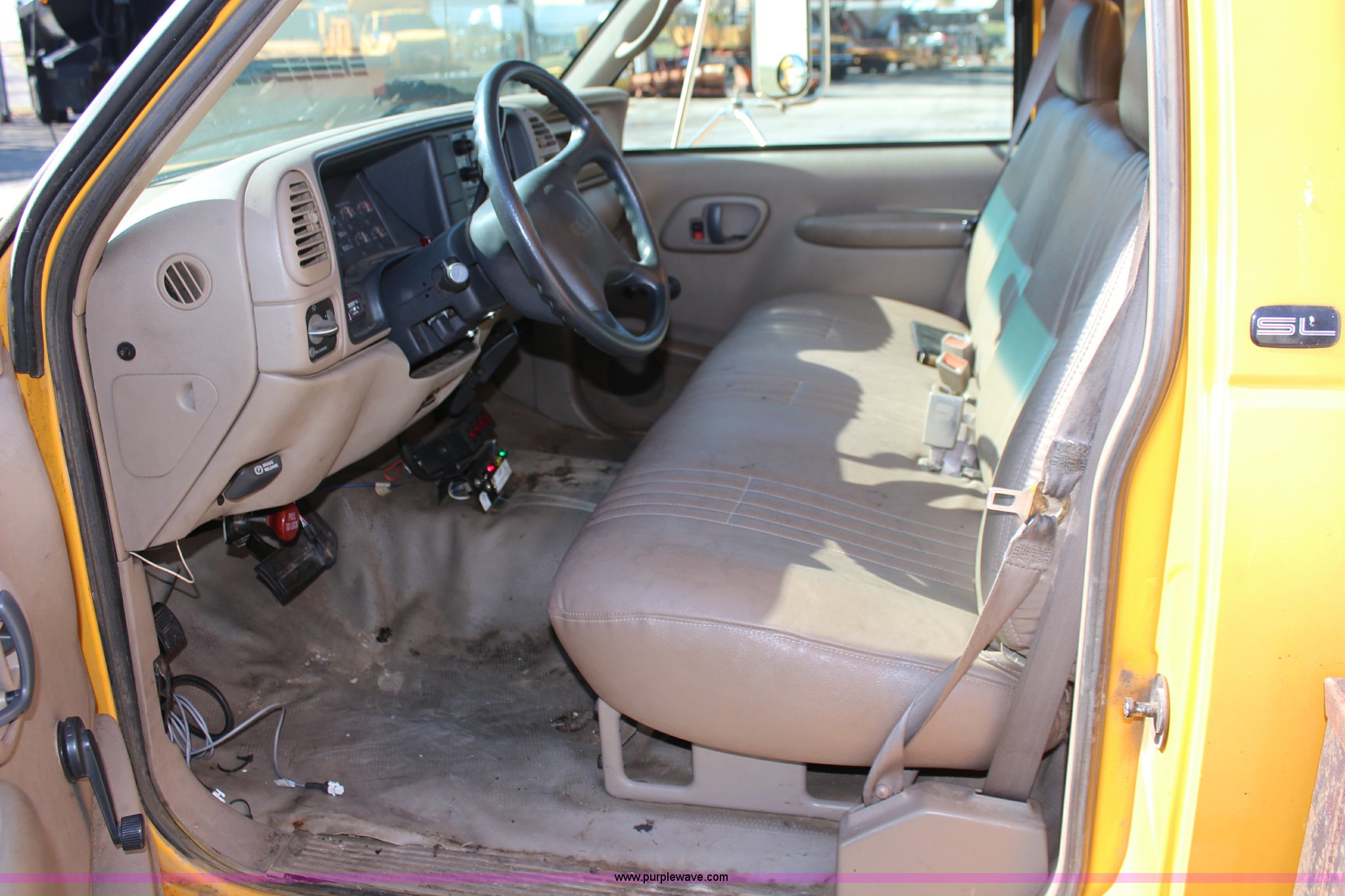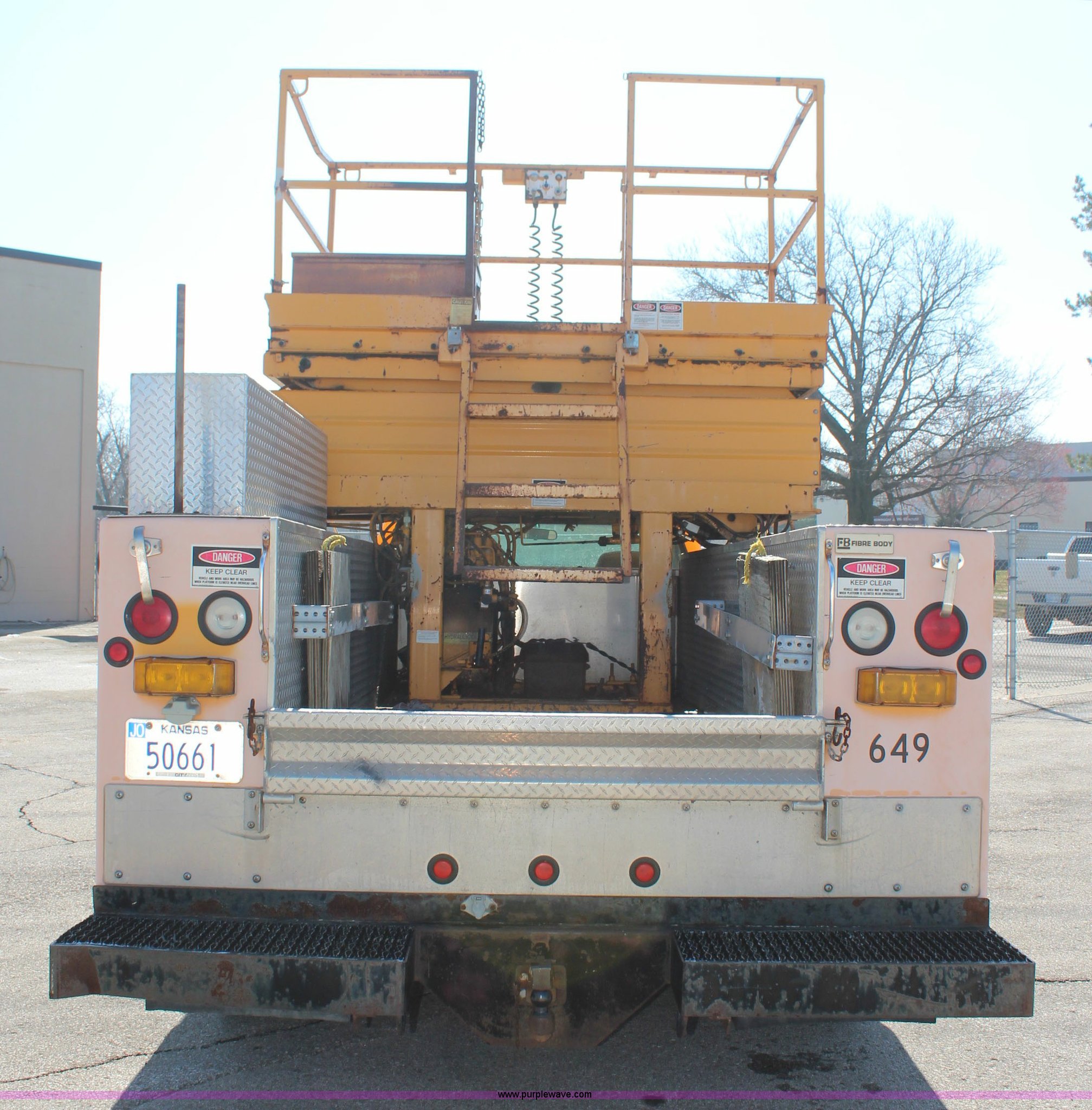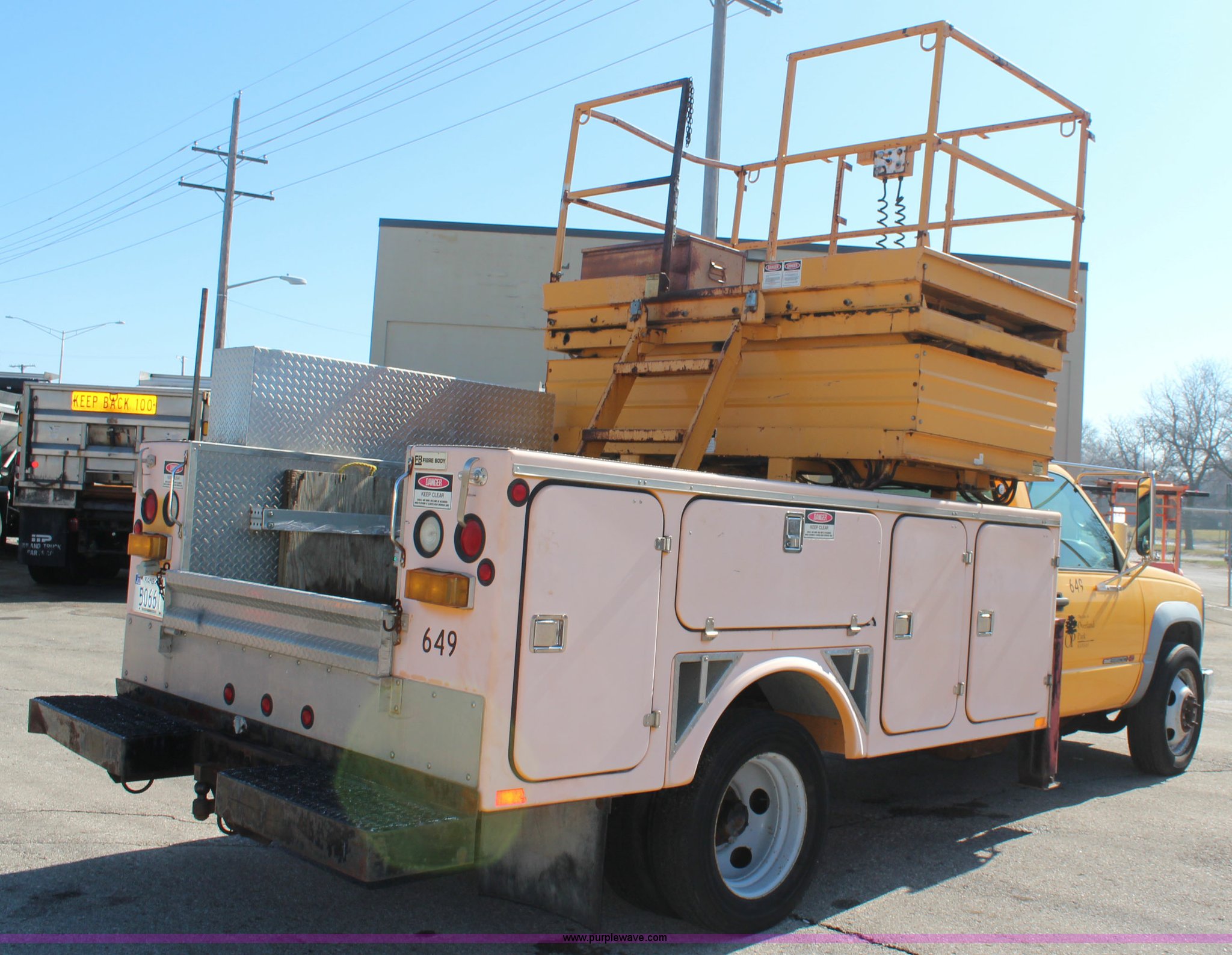 Purple Wave is selling a used Service Truck in Kansas. This item is a 1998 GMC Sierra 3500HD utility truck with scissor lift with the following: 92,748 miles on odometer, 6,419 hours on meter, 6.5L V8 OHV 16V diesel engine, Automatic transmission, AC and heat, Tilt, AM/FM, Manual windows and locks, Vinyl interior, Fibre utility bed, 11'L, Tesco Hi-Lift scissor lift, Model AL-28T, 550 lbs capacity, Serial 97-10-6506-K-01, Outriggers, Pintle hitch, Engine mounted hydraulic pump, 225/70R19.5 tires, Unit# 649