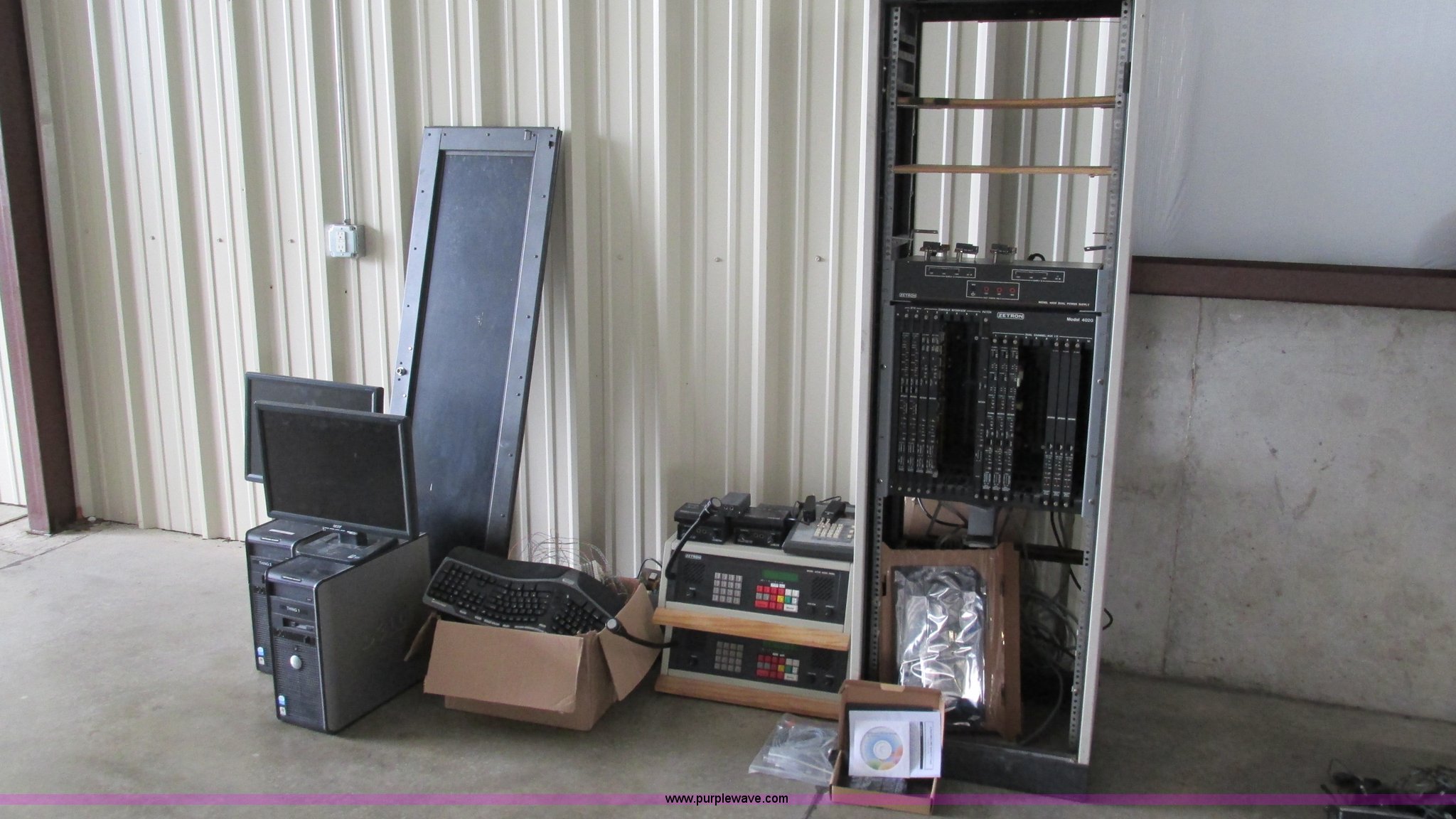 Purple Wave is selling a used Electronics in Missouri. This item is a Zetron radio control system with the following: (2) monitors, Model AL2016WB, (2) operator stations, Model 4217B, Series 4000 common controller, Rack mount console with door, Additional parts, Model 4020 dual power supply, (2) keyboards