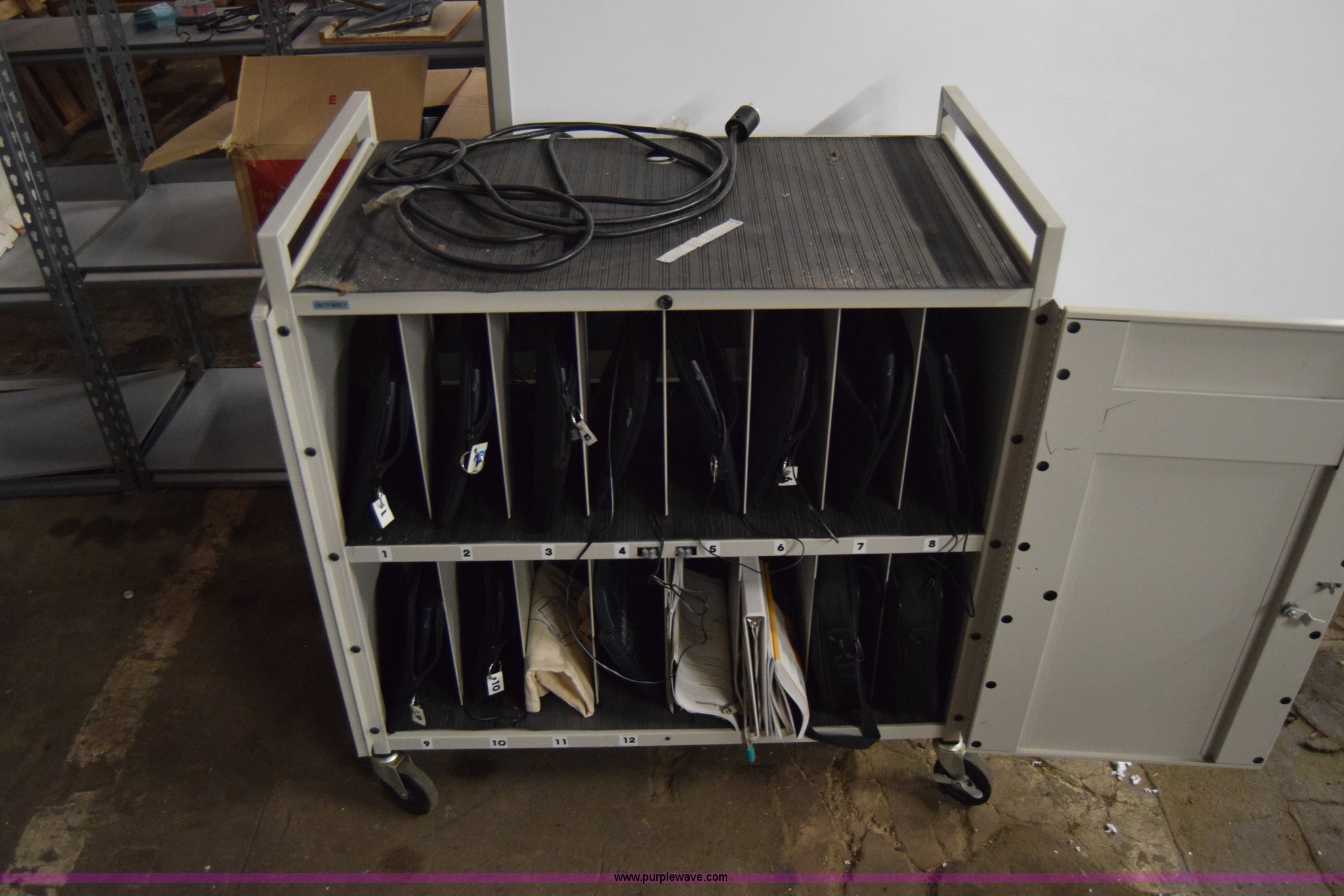 Purple Wave is selling a used Office Supplies and Equip. in Kansas. This item is a Alpha Smart lab with the following: (12) Alphas Smart Dana, Cases, Media cart, Outlets, Wheels, 36"W x 36"H x 22"D