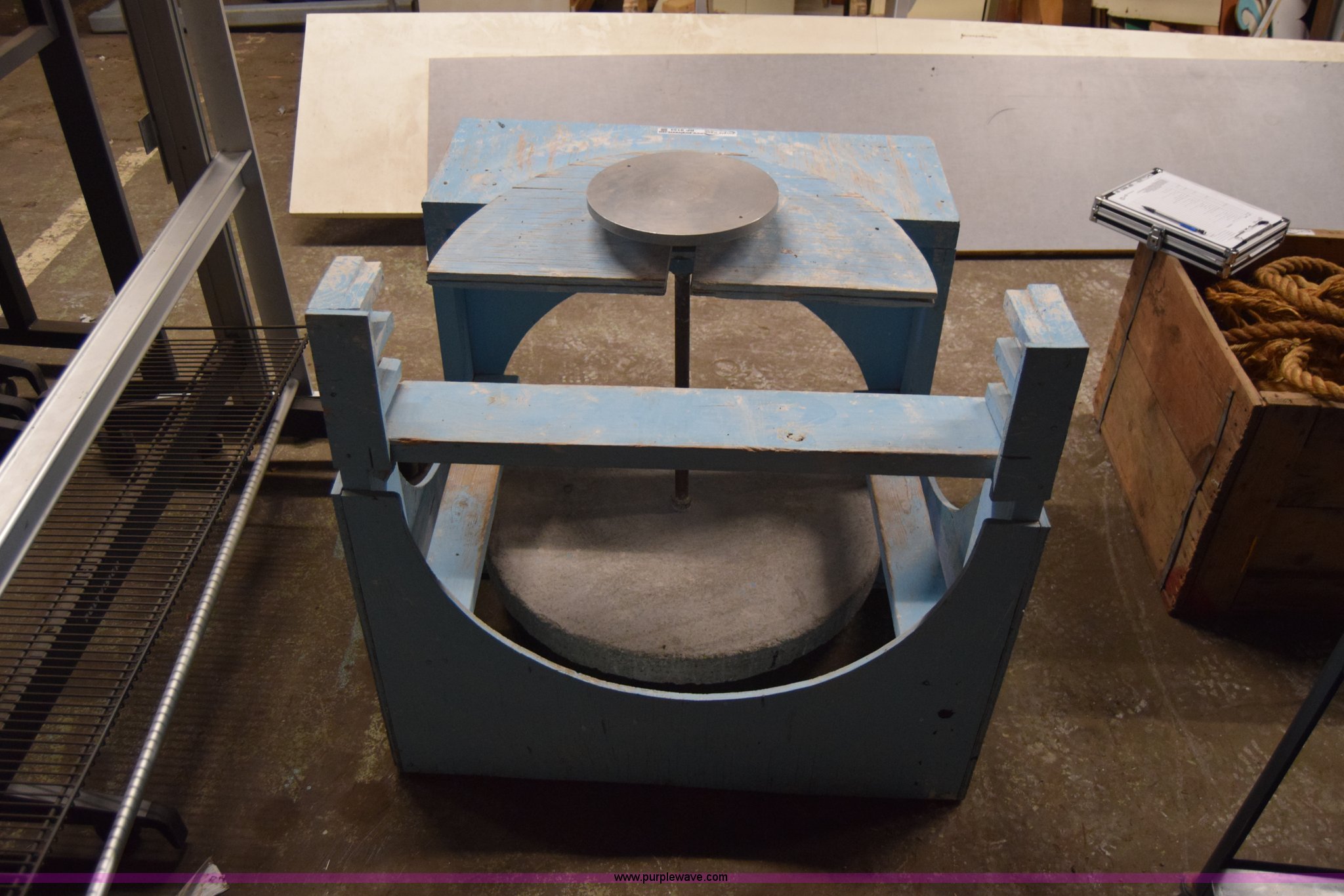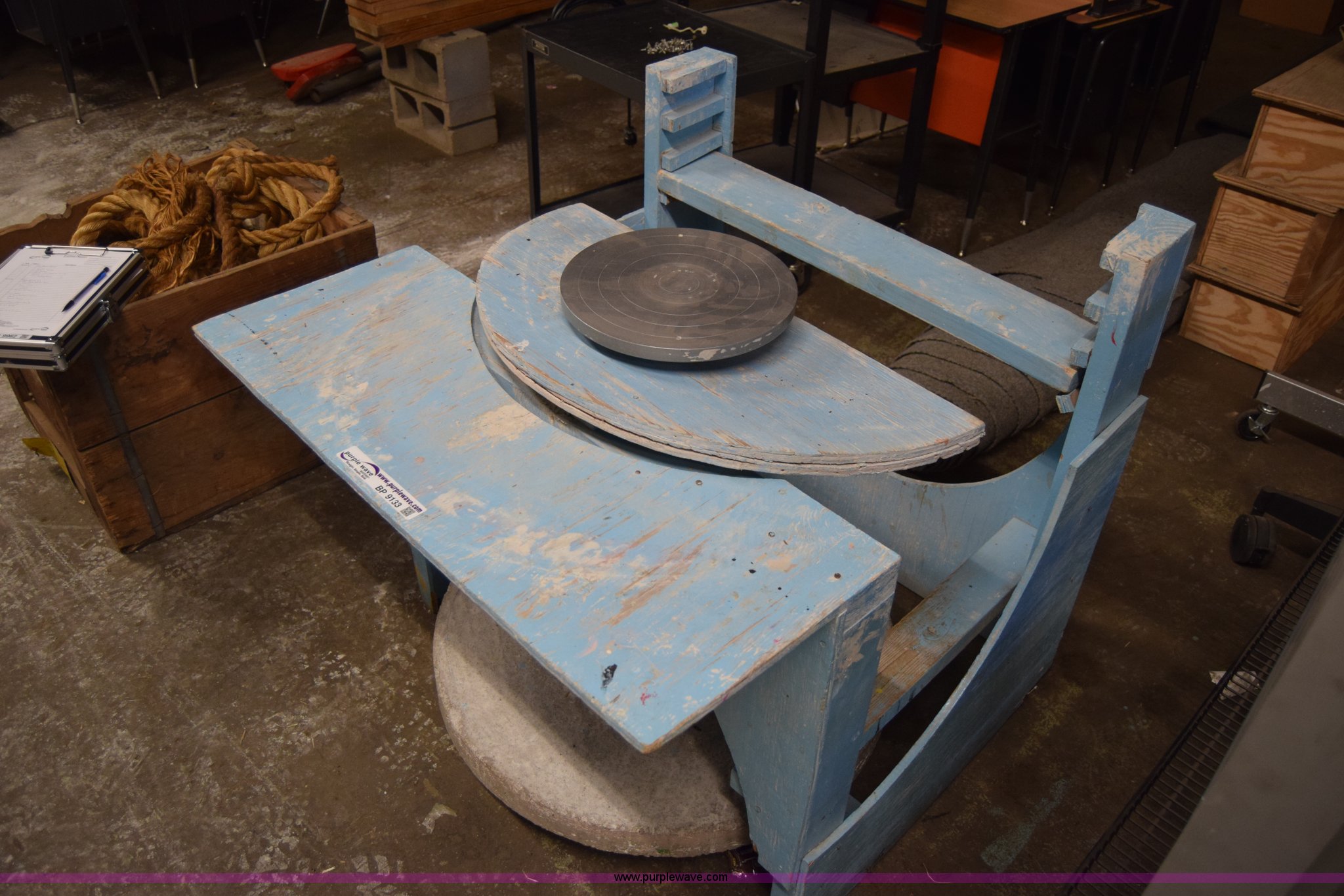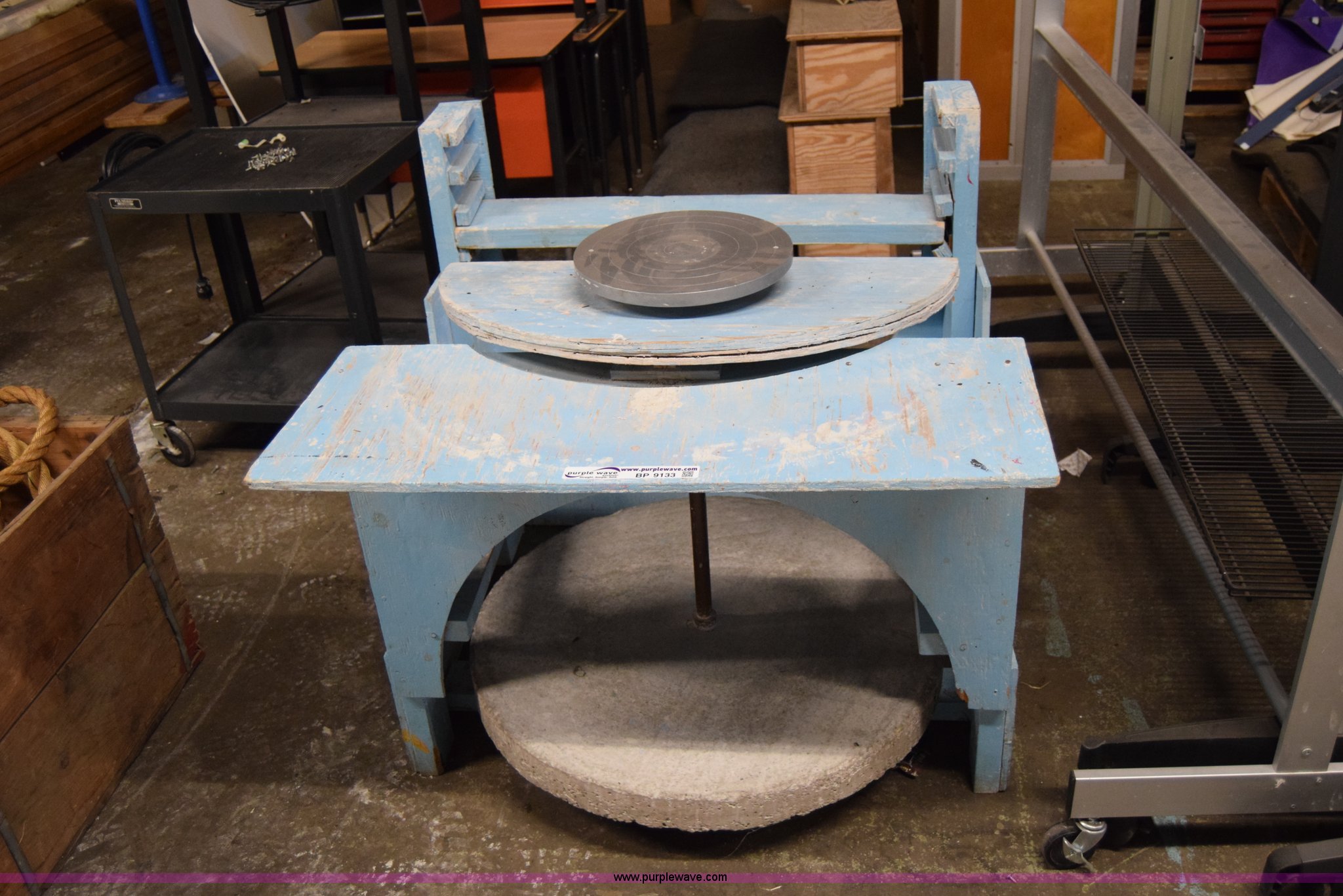 Purple Wave is selling a used Tools in Kansas. This item is a Pottery wheel with the following: 30" diameter bottom wheel, 12" diameter top wheel, 42"L x 42"W x 36"H
