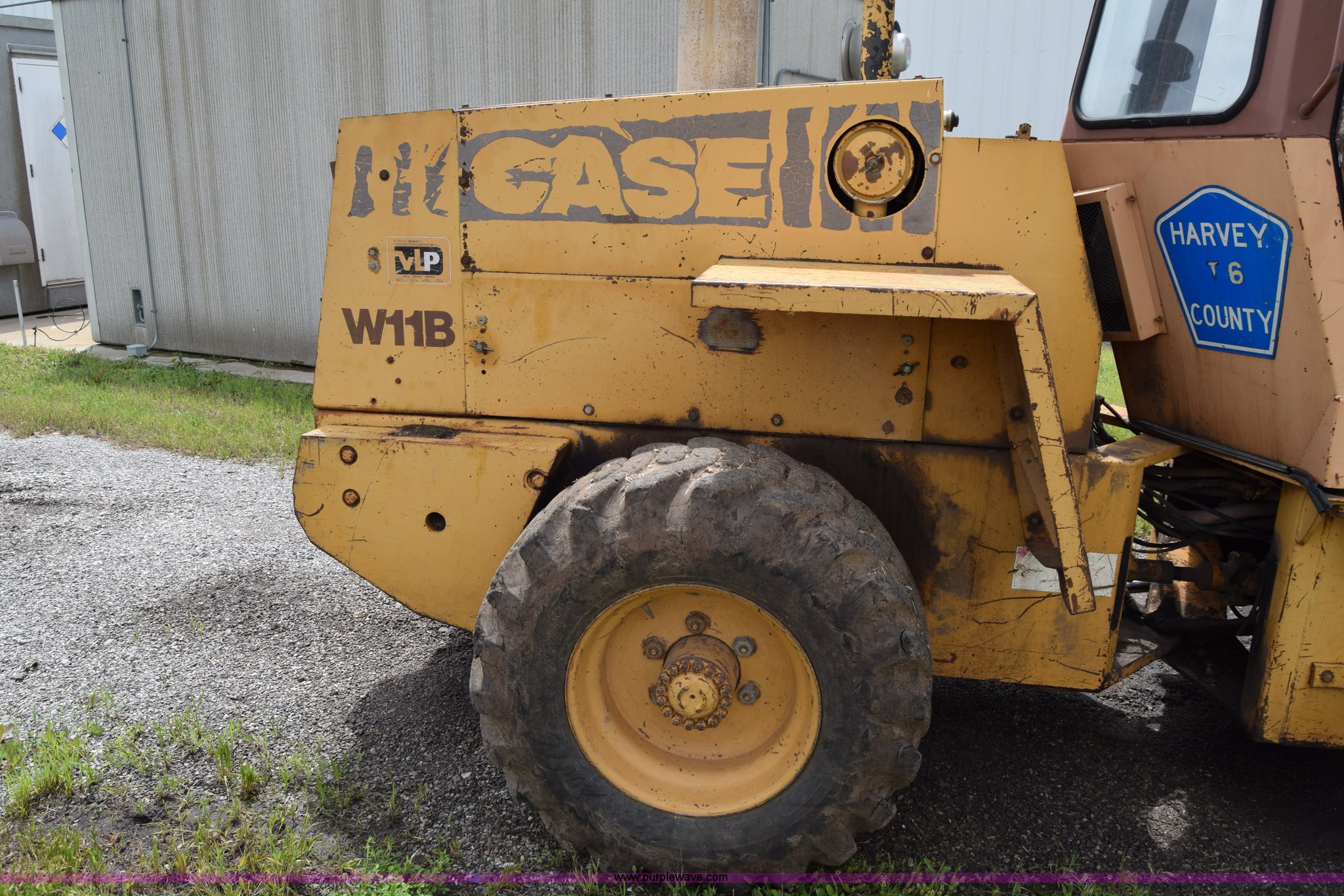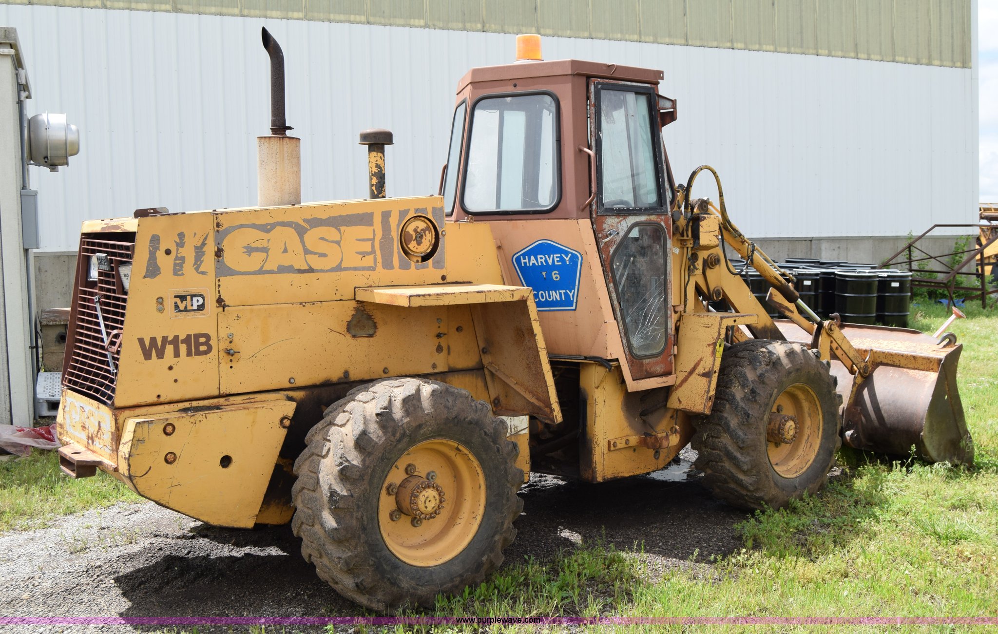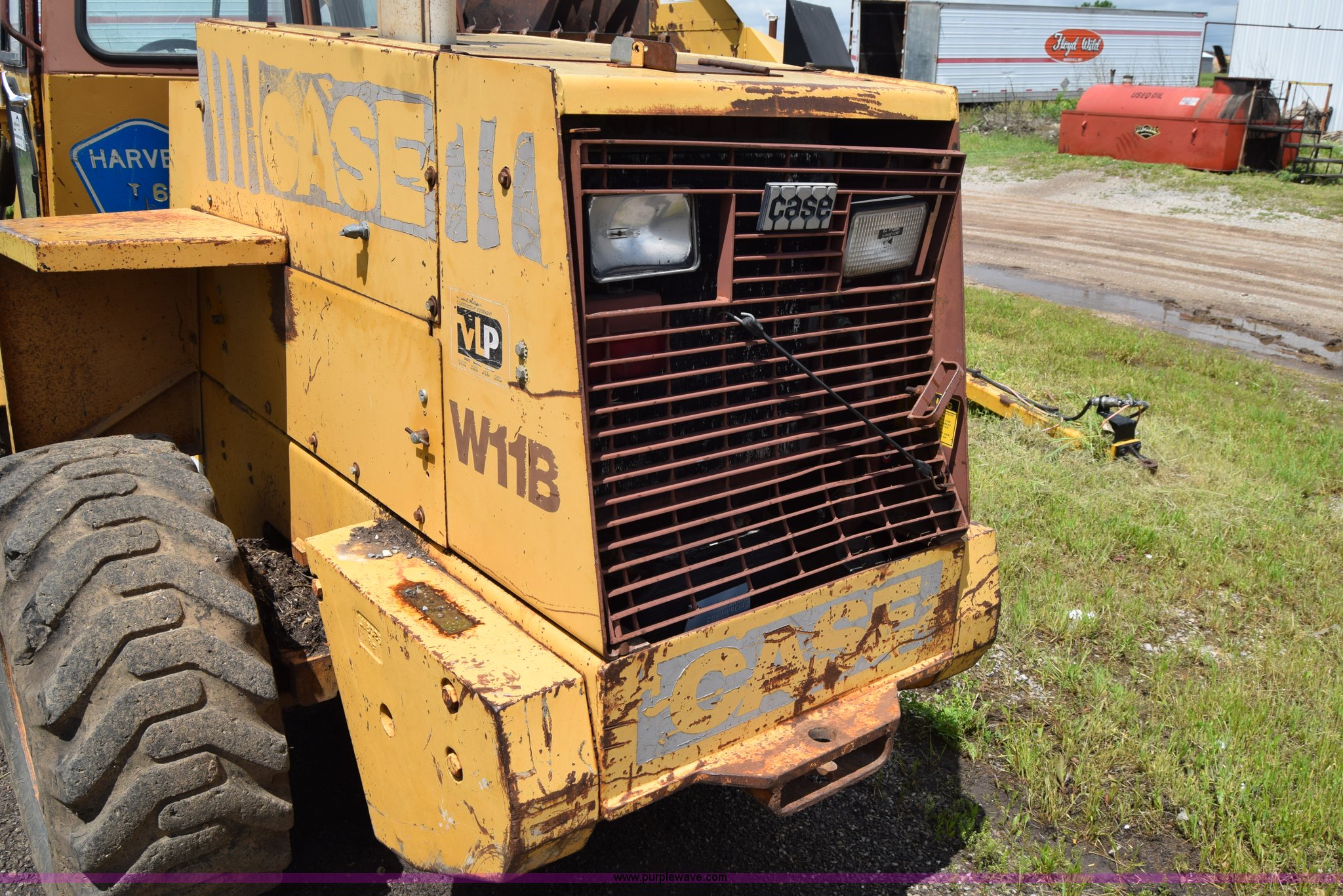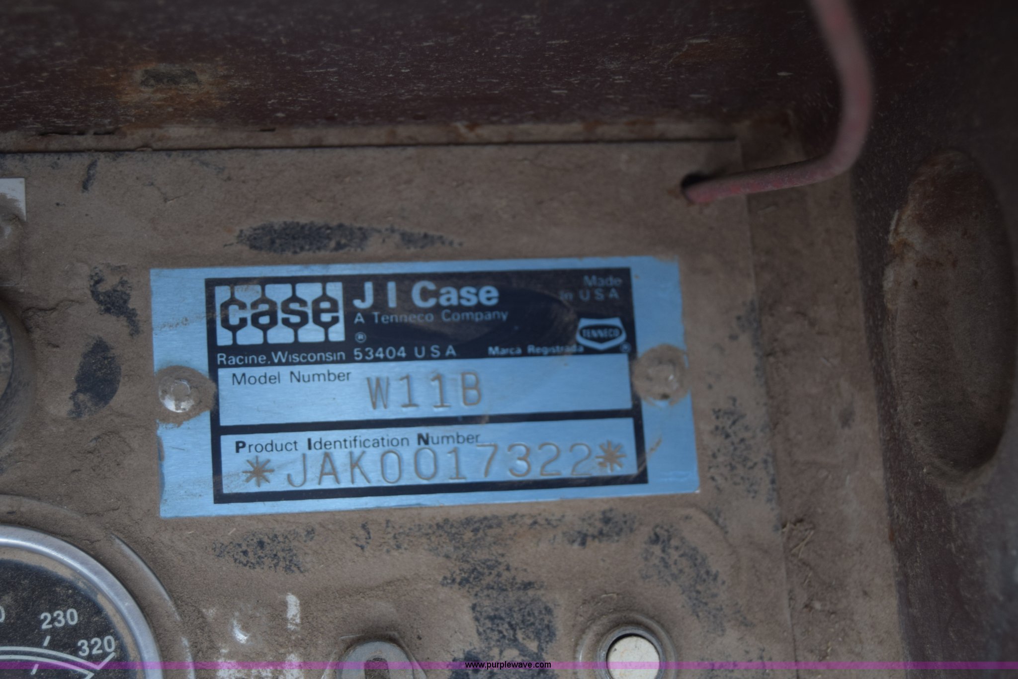 Purple Wave is selling a used Wheel Loader in Kansas. This item is a 1989 Case W11B wheel loader with the following: 825 hours on meter, Four cylinder diesel engine, Shuttle shift transmission, 3F-3R gears, Cab, Suspension seat, Two stick loader control, Front work lights, 77"W loader bucket, 15-19.5 foam-filled tires, 10,849 lbs. base operating weight, Windows cracked, Wires loose in cab, Brakes weak, Dents and scratches, Serial JAK0017322