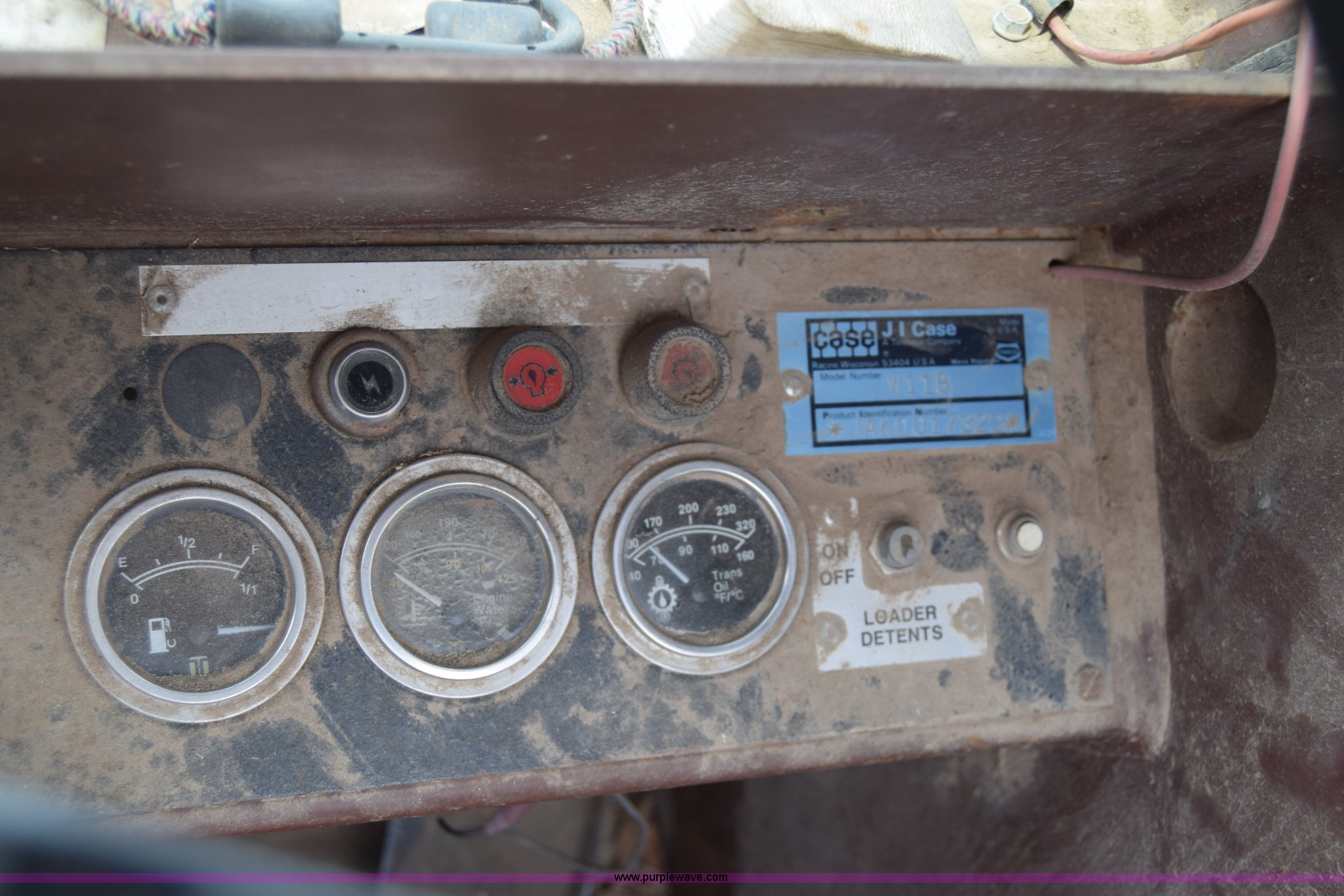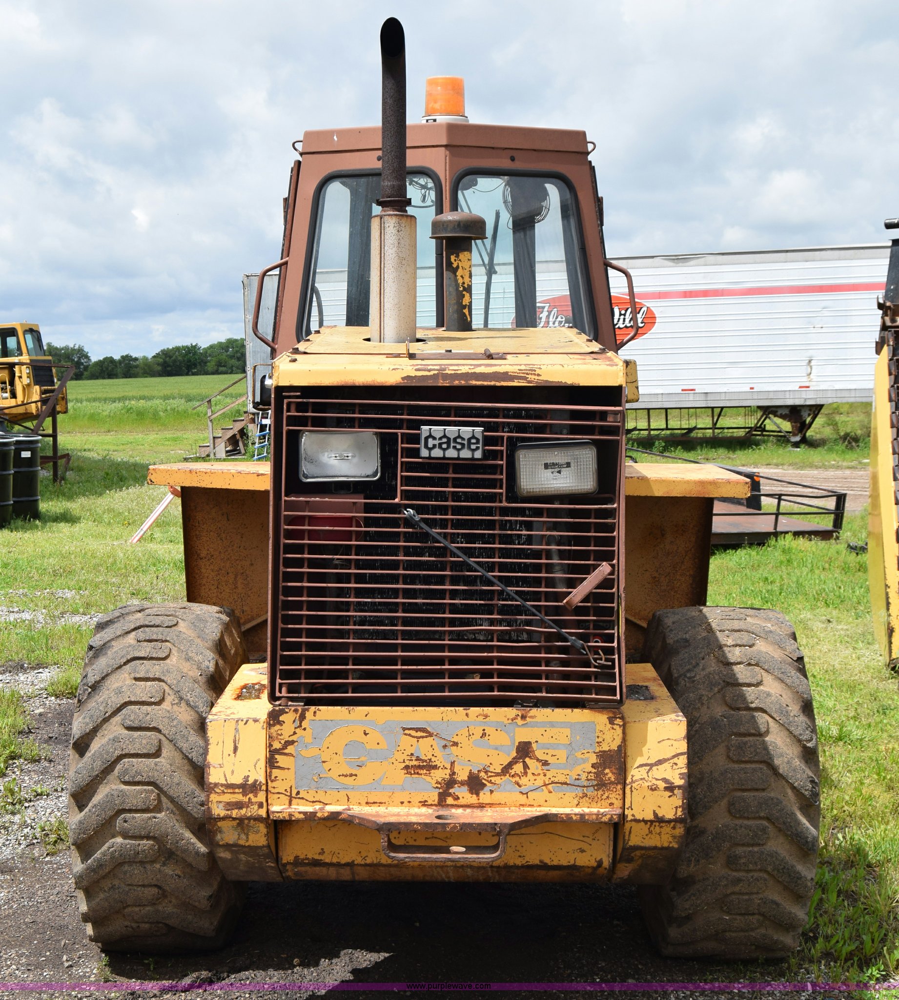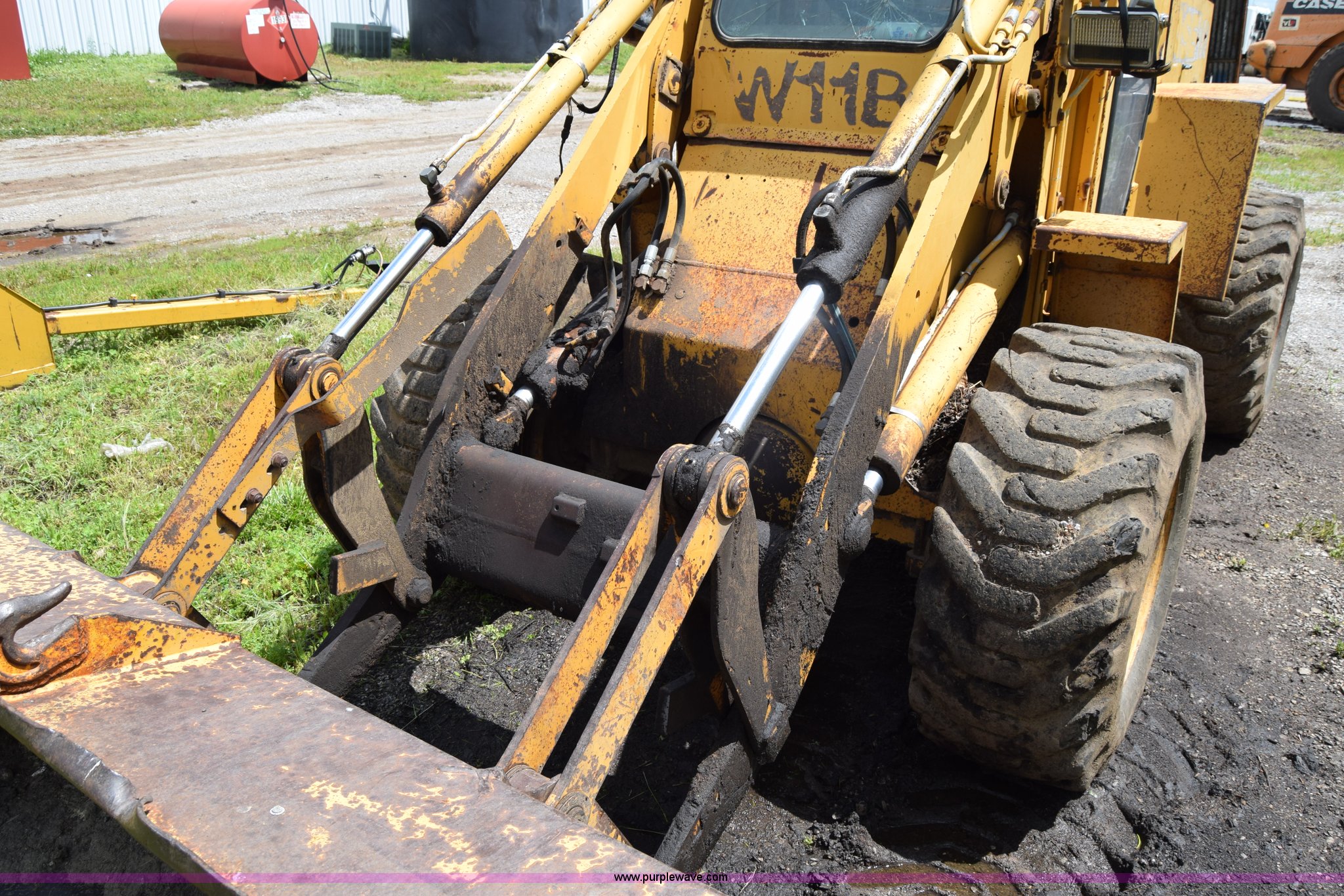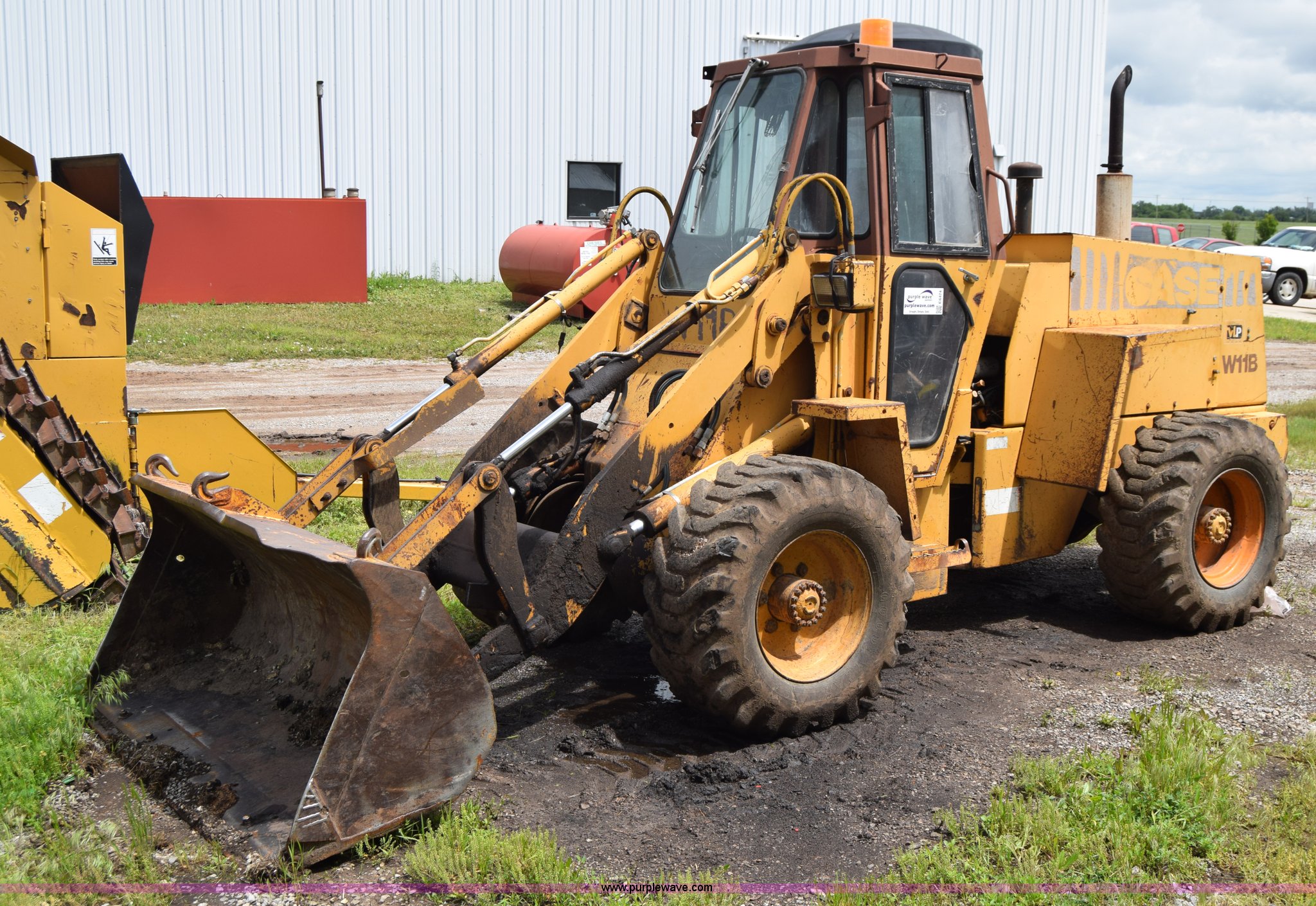 Purple Wave is selling a used Wheel Loader in Kansas. This item is a 1989 Case W11B wheel loader with the following: 825 hours on meter, Four cylinder diesel engine, Shuttle shift transmission, 3F-3R gears, Cab, Suspension seat, Two stick loader control, Front work lights, 77"W loader bucket, 15-19.5 foam-filled tires, 10,849 lbs. base operating weight, Windows cracked, Wires loose in cab, Brakes weak, Dents and scratches, Serial JAK0017322