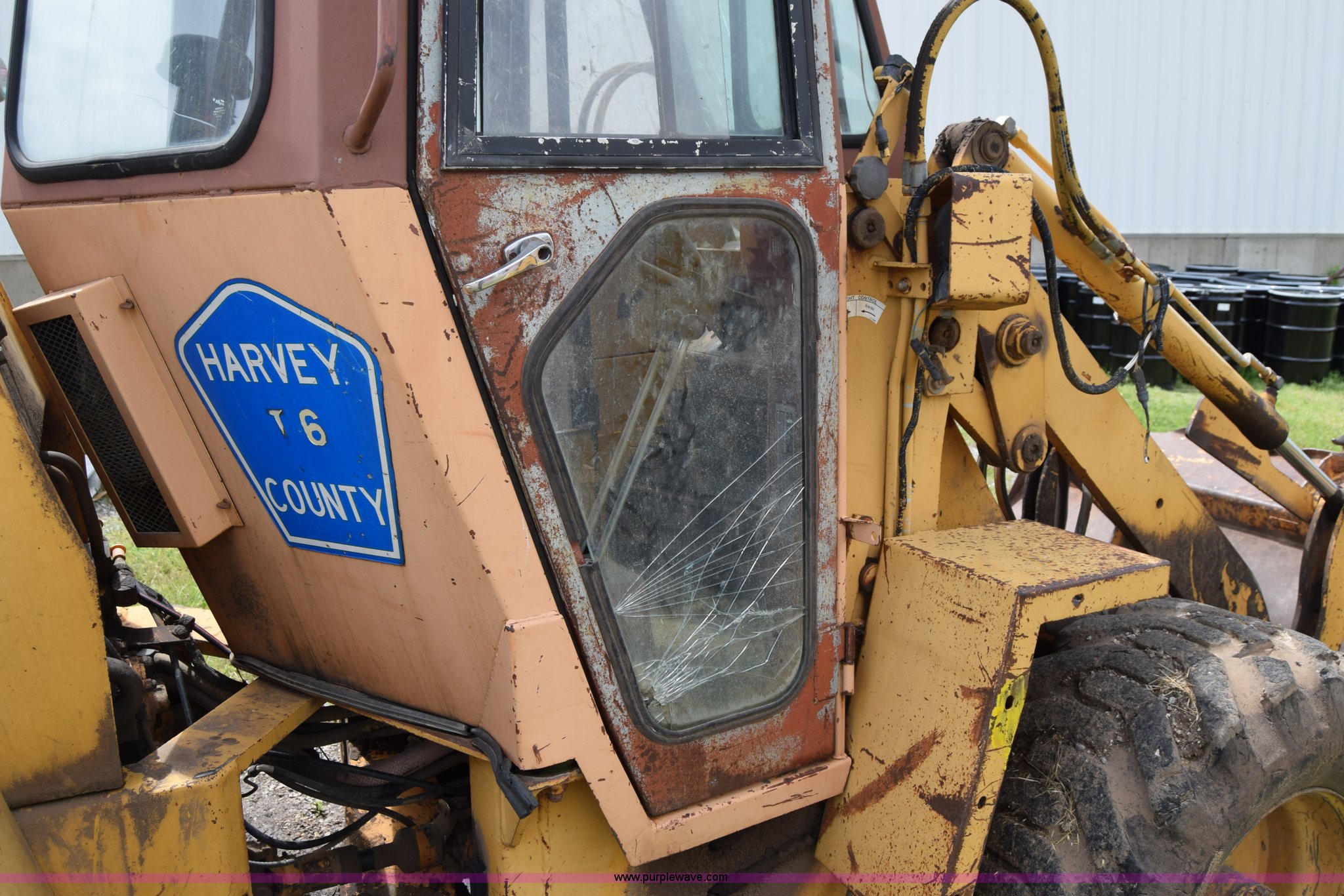 1989 Case W11B wheel loader. 825 hours on meter, Four cylinder diesel engine, Shuttle shift transmission 3F-3R gears, Cab, Suspension seat, Two stick loader control, Front work lights, 77"W loader bucket, 15-19.5 foam-filled tires, 10,849 lbs. base operating weight, Windows cracked, Wires loose in cab, Brakes weak, Dents and scratches, Serial JAK0017322. 3205 SW 24th. Newton, KS 67114