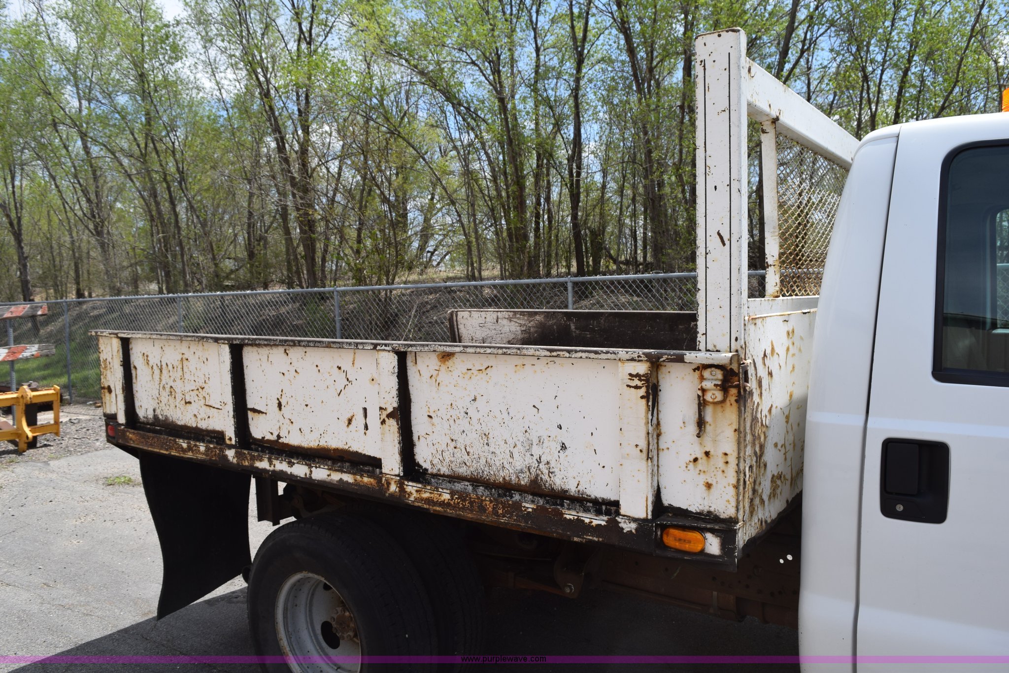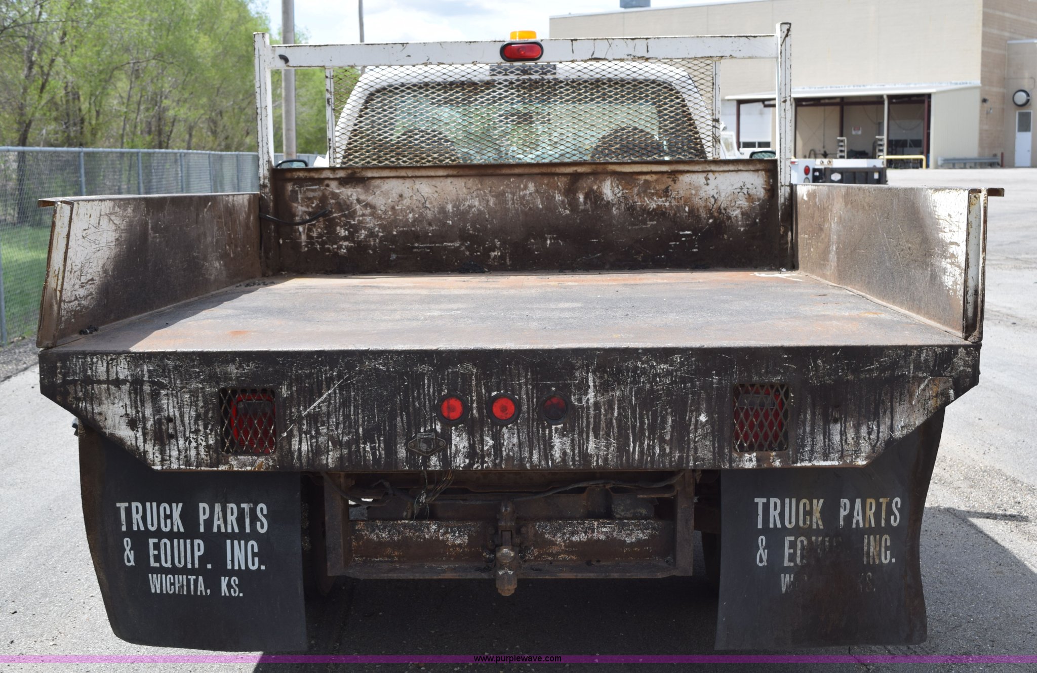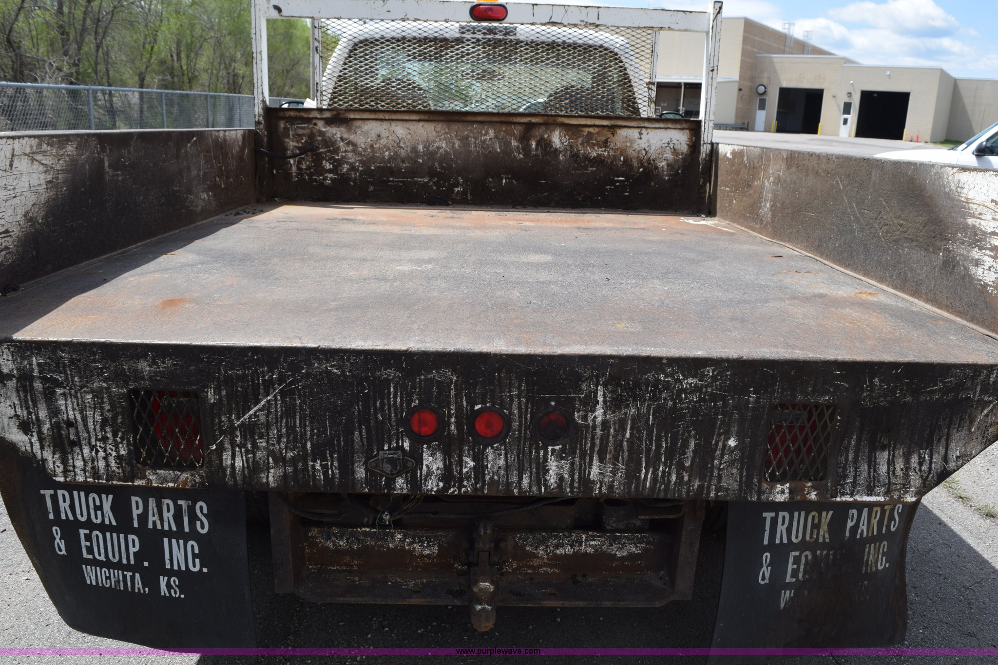 2000 Ford F350 Super Duty flatbed pickup truck. 133,493 actual miles, 5.4L V8 SOHC 16V gas engine, Automatic transmission, AC and heat, AM/FM, Manual windows and locks, Vinyl interior, 9'L x 8'W flatbed 12"H stake sides, Ball hitch, Pintle hitch, Trailer wiring, 235/85R16 tires. 1FDWF36L5YEE27163. View equipment video. City of Hutchinson. 1500 S Plum. Hutchinson, KS 67501