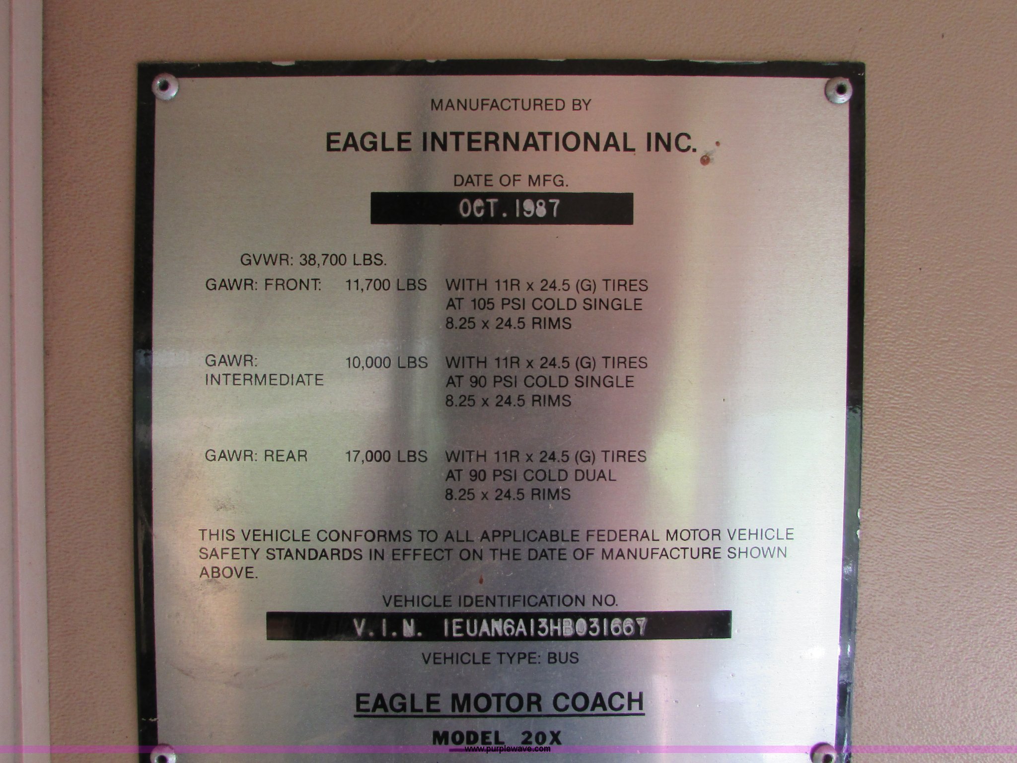 Purple Wave is selling a used Bus in South Dakota. This item is a 1987 Eagle 20X bus with the following: 104,601 miles on odometer, Detroit Diesel diesel engine, Automatic transmission, AC and heat, Non-operational AC, Passenger AC and heat controls, (22) double seats, Rear bench seat, (6) under body storage units, Receiver hitch, Trailer wiring, Goodyear 11R24.5 tires, GVWR 38,700 lbs, FAWR 11,700 lbs, IAWR 10,000 lbs, RAWR 17,000 lbs