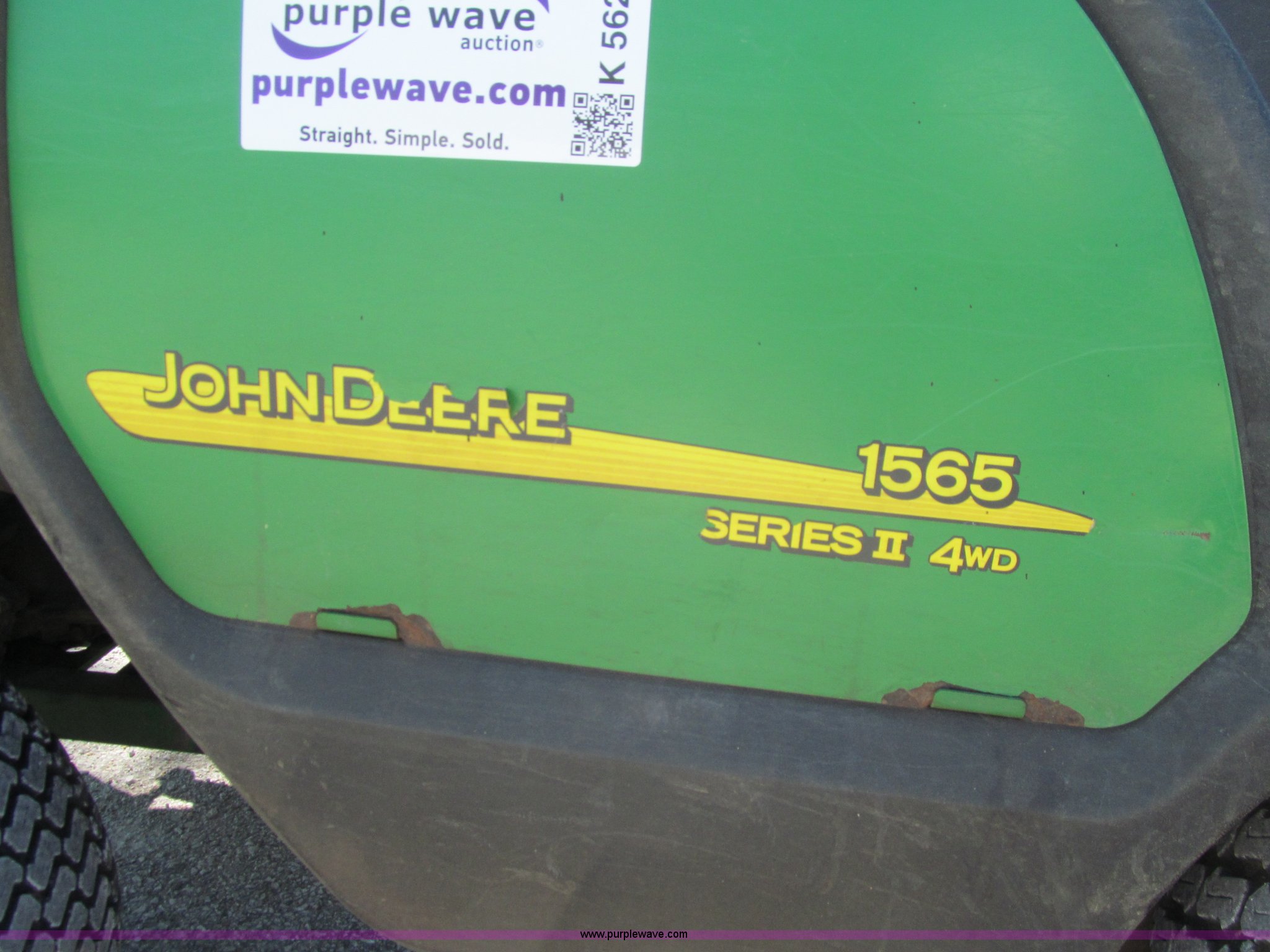 Purple Wave is selling a used Commercial Turf Mower in Iowa. This item is a 2005 John Deere 1565 Series II lawn mower with the following: 2,469 hours on meter, 72" cut, Yanmar three cylinder diesel engine, 31 HP, Hydrostatic transmission, Dual speed, Four wheel drive, Differential lock, Spring suspension seat, Rear discharge deck, 26x12-12 drive tires, 20x10-10 steering tires, Serial ASTC1565D040191