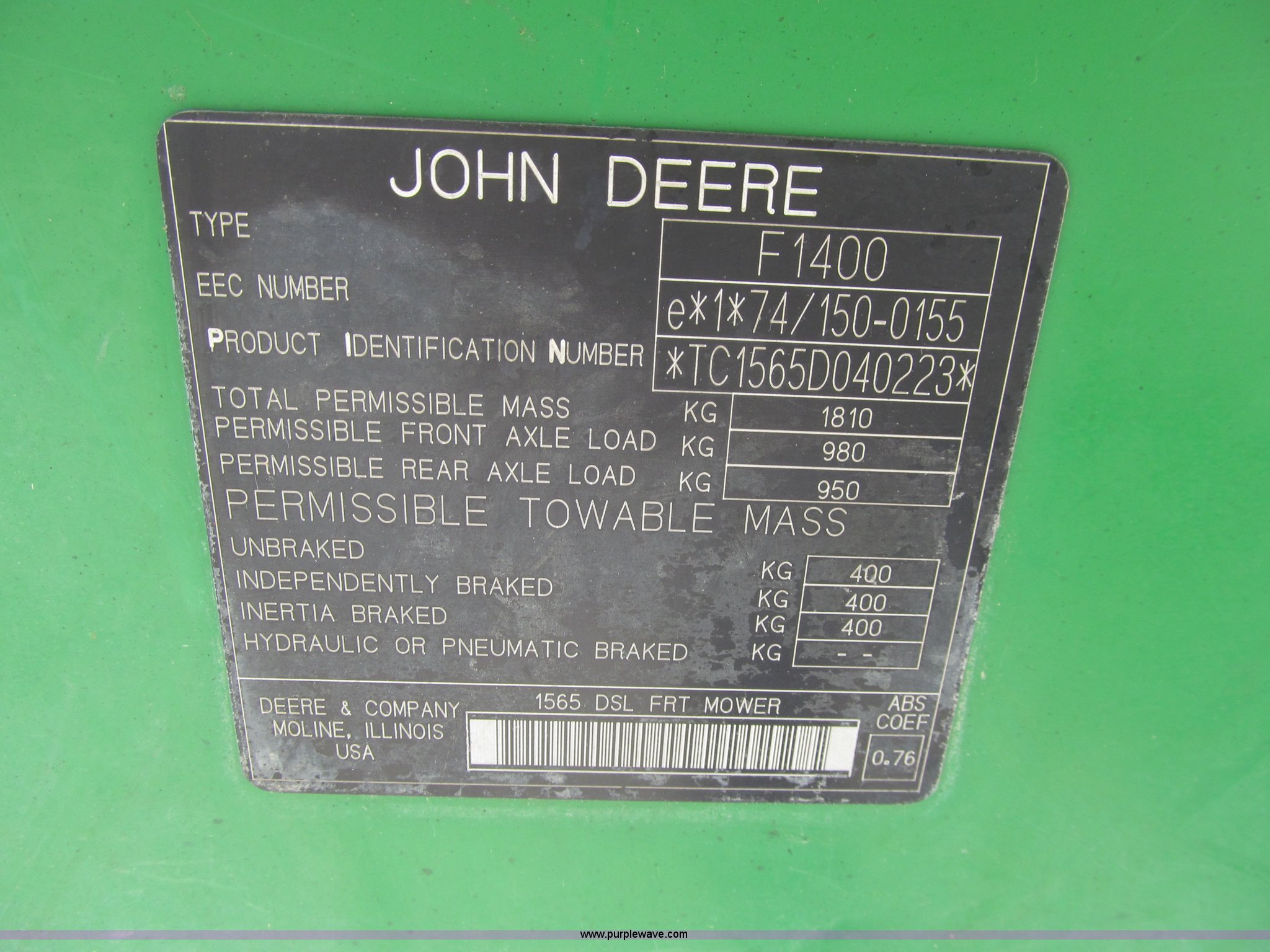 Purple Wave is selling a used Commercial Turf Mower in Iowa. This item is a 2005 John Deere 1565 Series II lawn mower with the following: 2,417 hours on meter, 72" cut, Yanmar three cylinder diesel engine, 31 HP, Hydrostatic transmission, Dual speed, Four wheel drive, Differential lock, Spring suspension seat, Rear discharge deck, 26x12-12 drive tires, 20x10-10 steering tires, Serial TC1565D040223