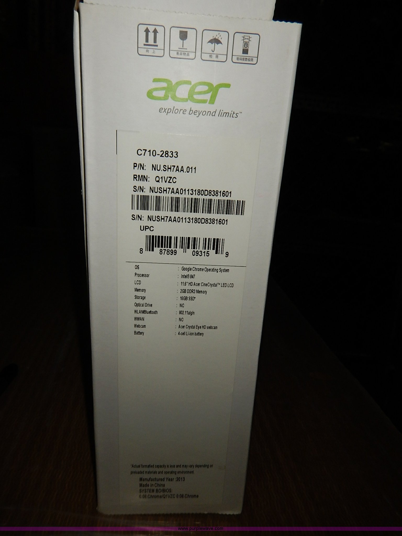 Acer Chromebook laptop. New in box, Power cord, Manuals, Powers on, Serial NUSH7AA0113180D8381601. Junction City Police Department. 210 E 9th St. Junction City, KS 66441