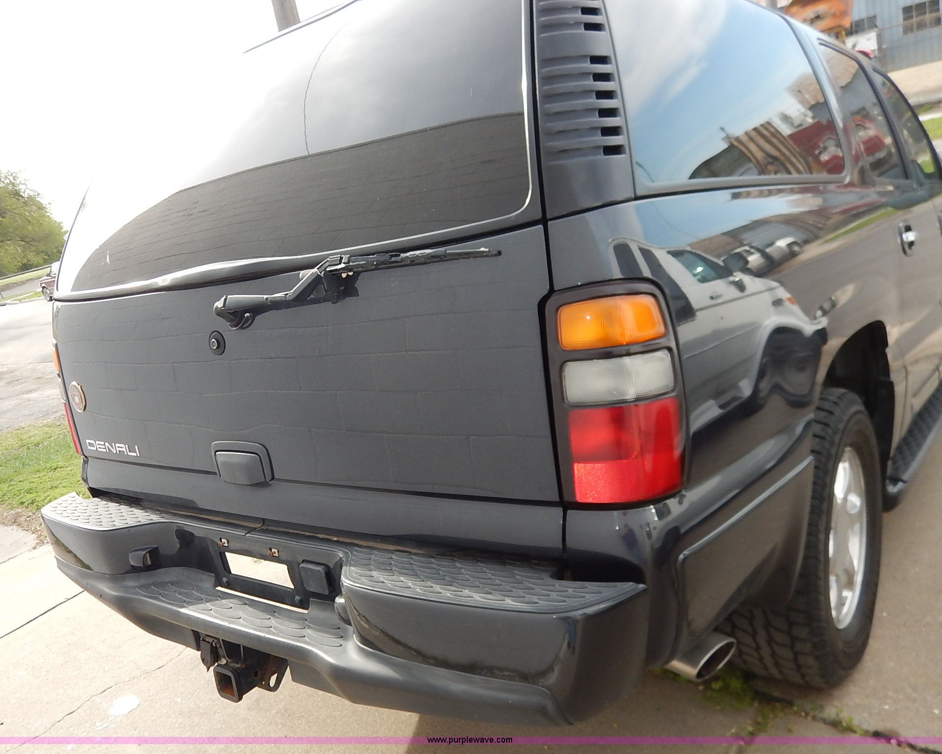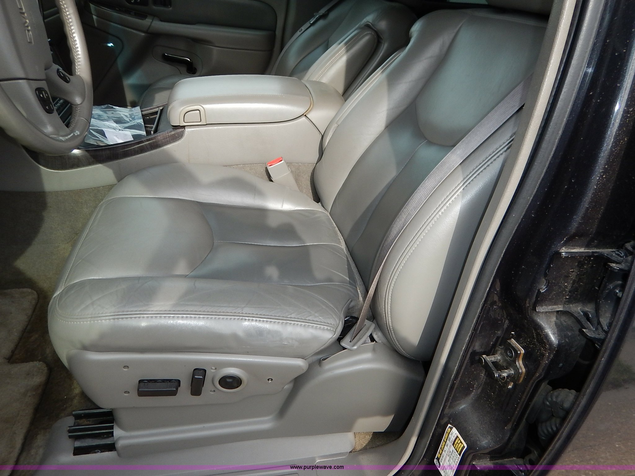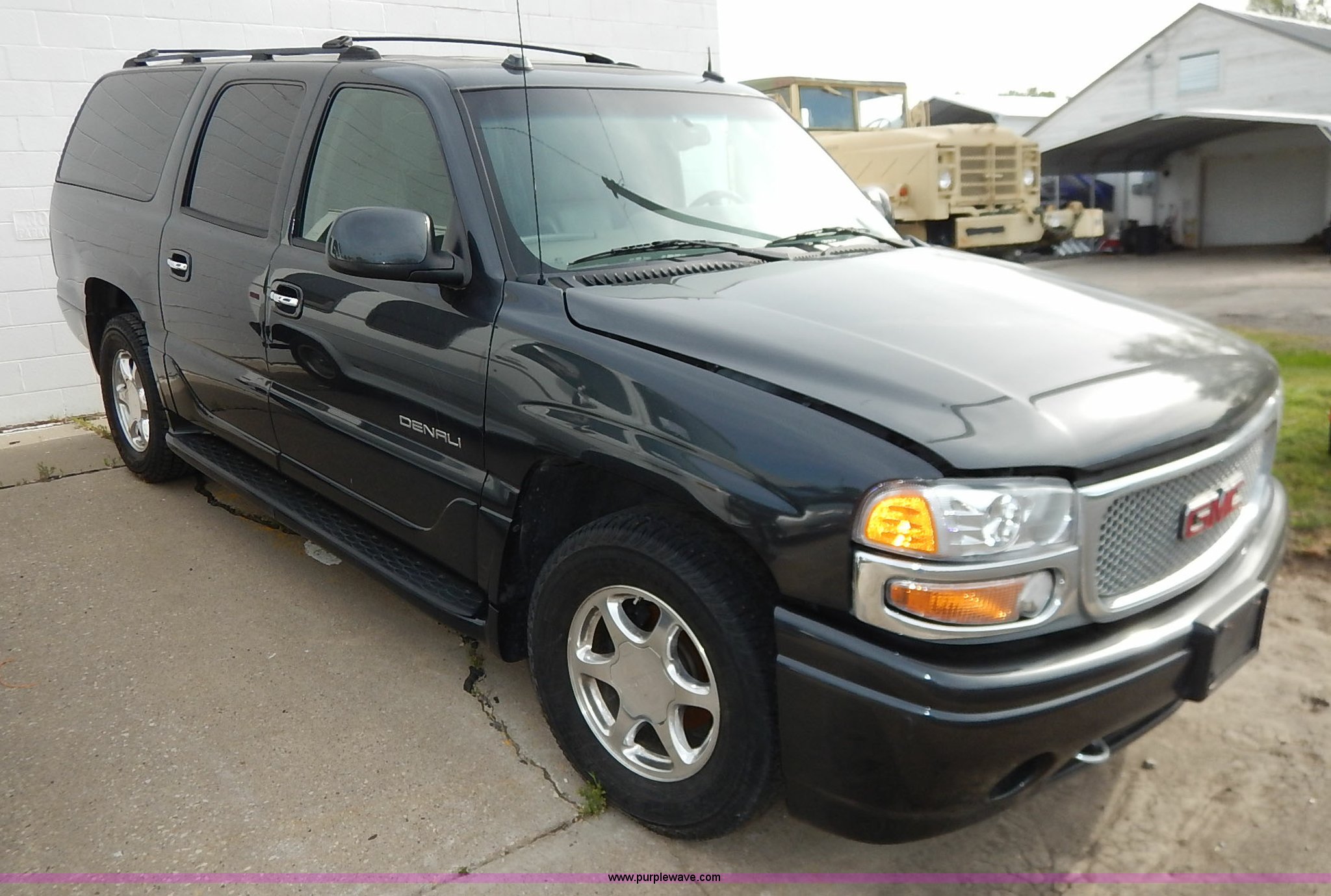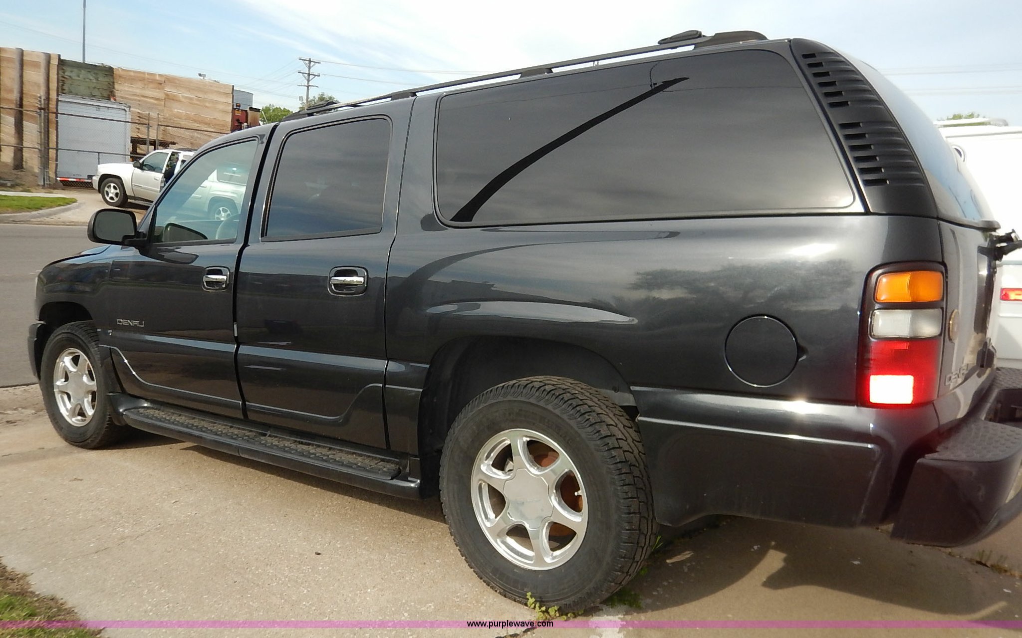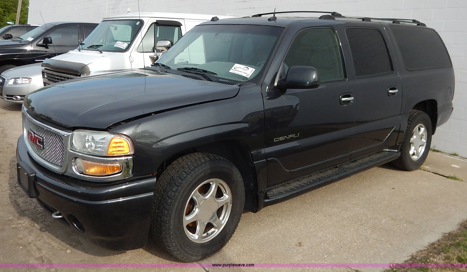 Purple Wave is selling a used Passenger Vehicle in Kansas. This item is a 2004 GMC Yukon Denali XL SUV with the following: 112,356 miles on odometer, 6.0L V8 OHV 16V gas engine, Automatic transmission, AC and heat, Tilt, Cruise, AM/FM/CD, Power windows, locks, mirrors, and seats, Heated seats, Leather interior, Moonroof, Rear climate controls, Tow hooks, Running boards, Luggage rack, Receiver hitch, Trailer wiring, 265/70R17 tires, Dead battery, Scratches