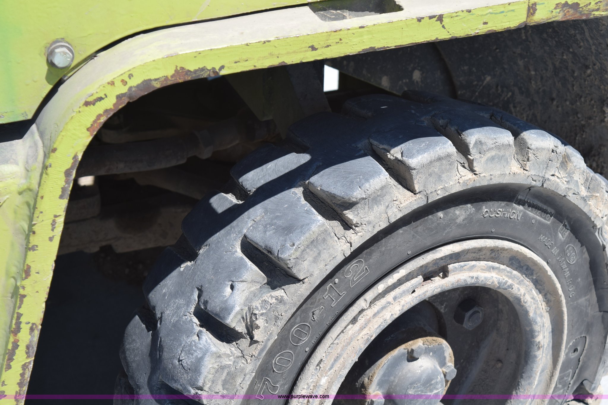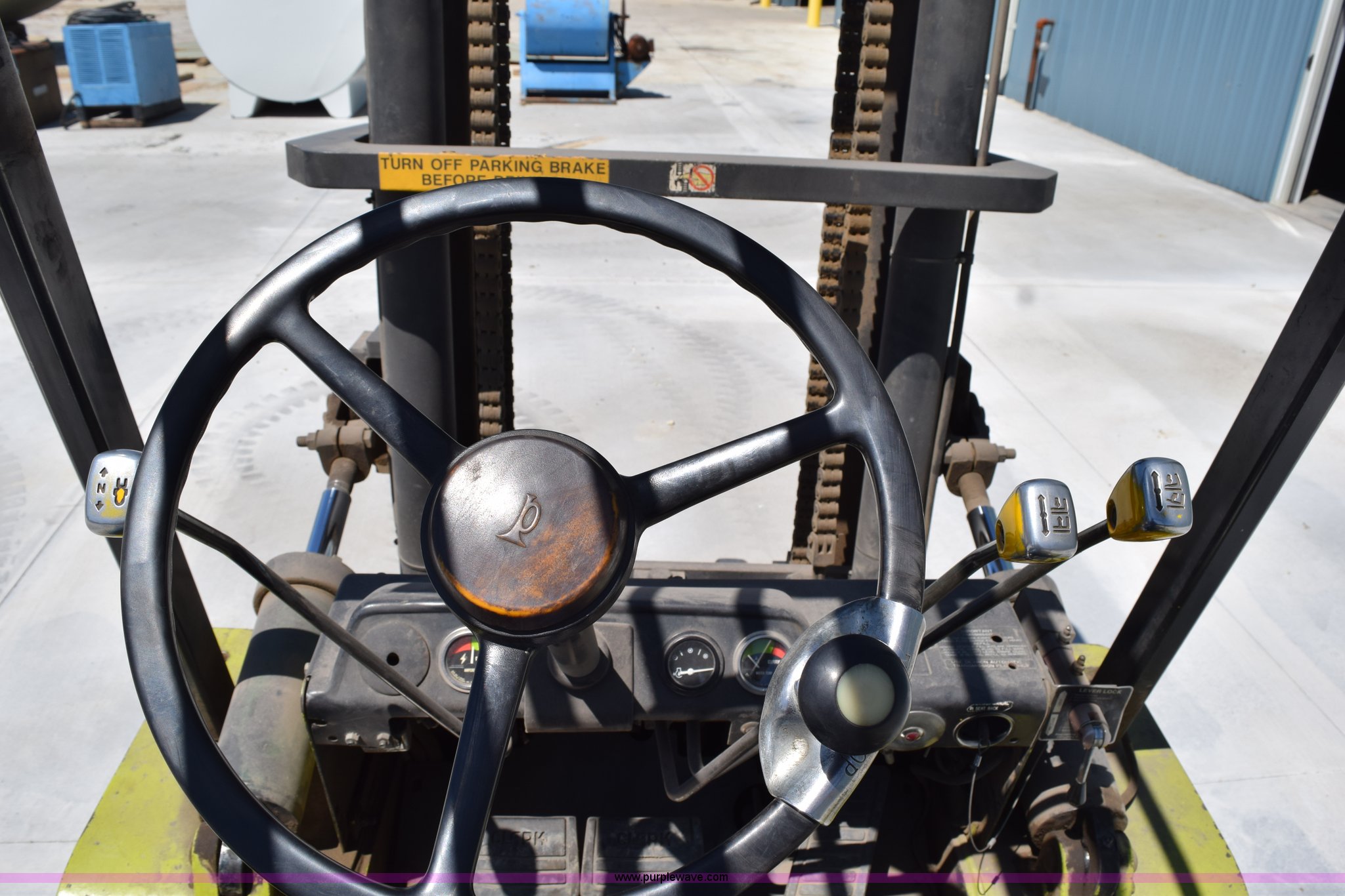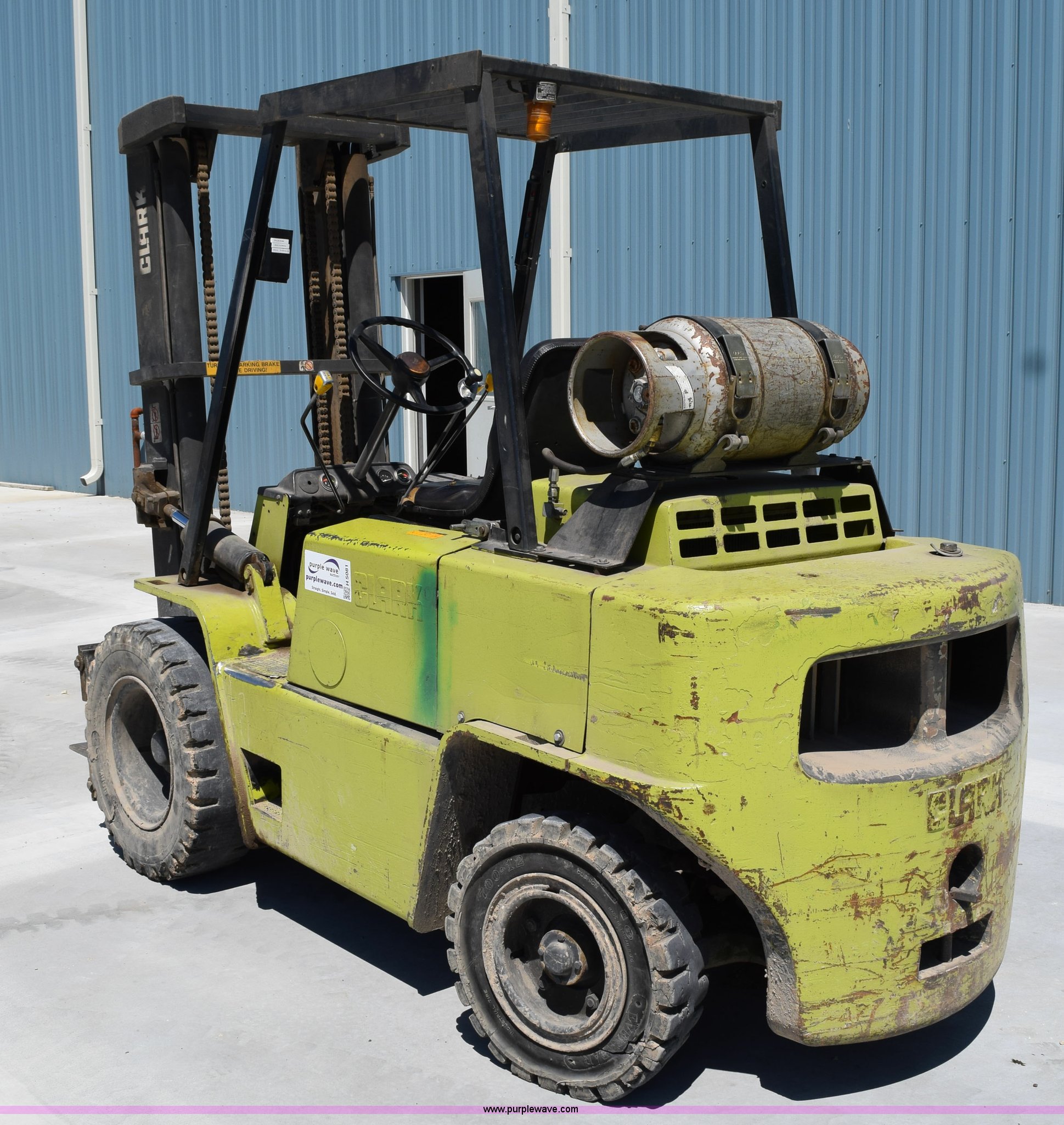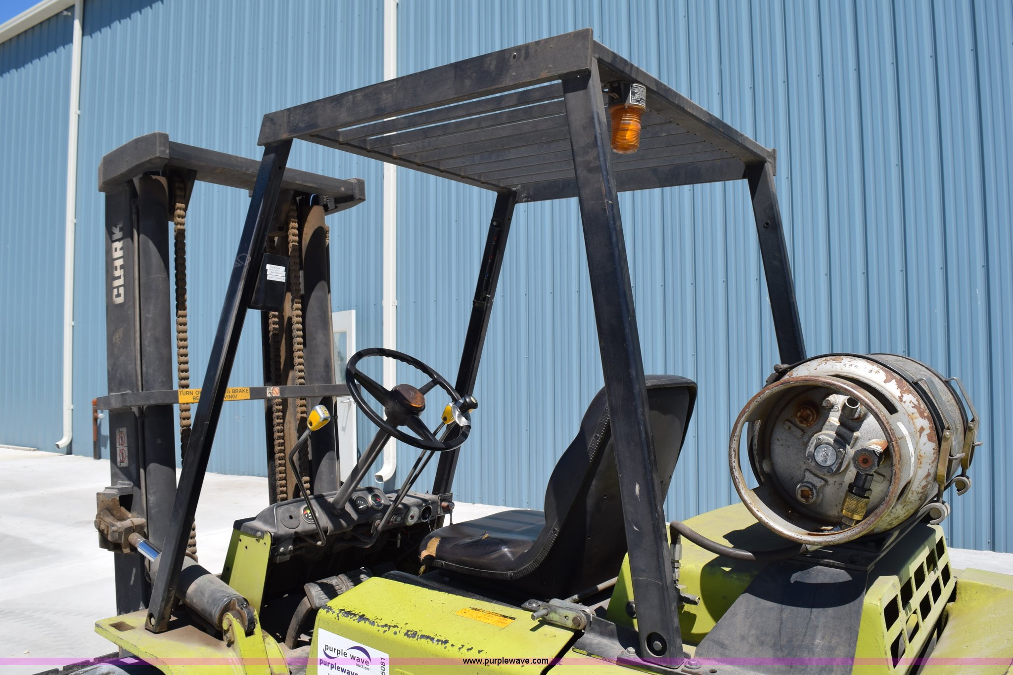 Purple Wave is selling a used Cushion Tire or Pneumatic Forklift in Kansas. This item is a Clark C500-YS80 forklift with the following: 7,373 hours on meter, Four cylinder propane engine, Shuttle shift transmission, 8,000 lbs maximum lift capacity, 3.5'L forks, 7.50 x 15 solid front tires, 7.00-12 solid rear tires, Serial Y685-0215-9215K0F