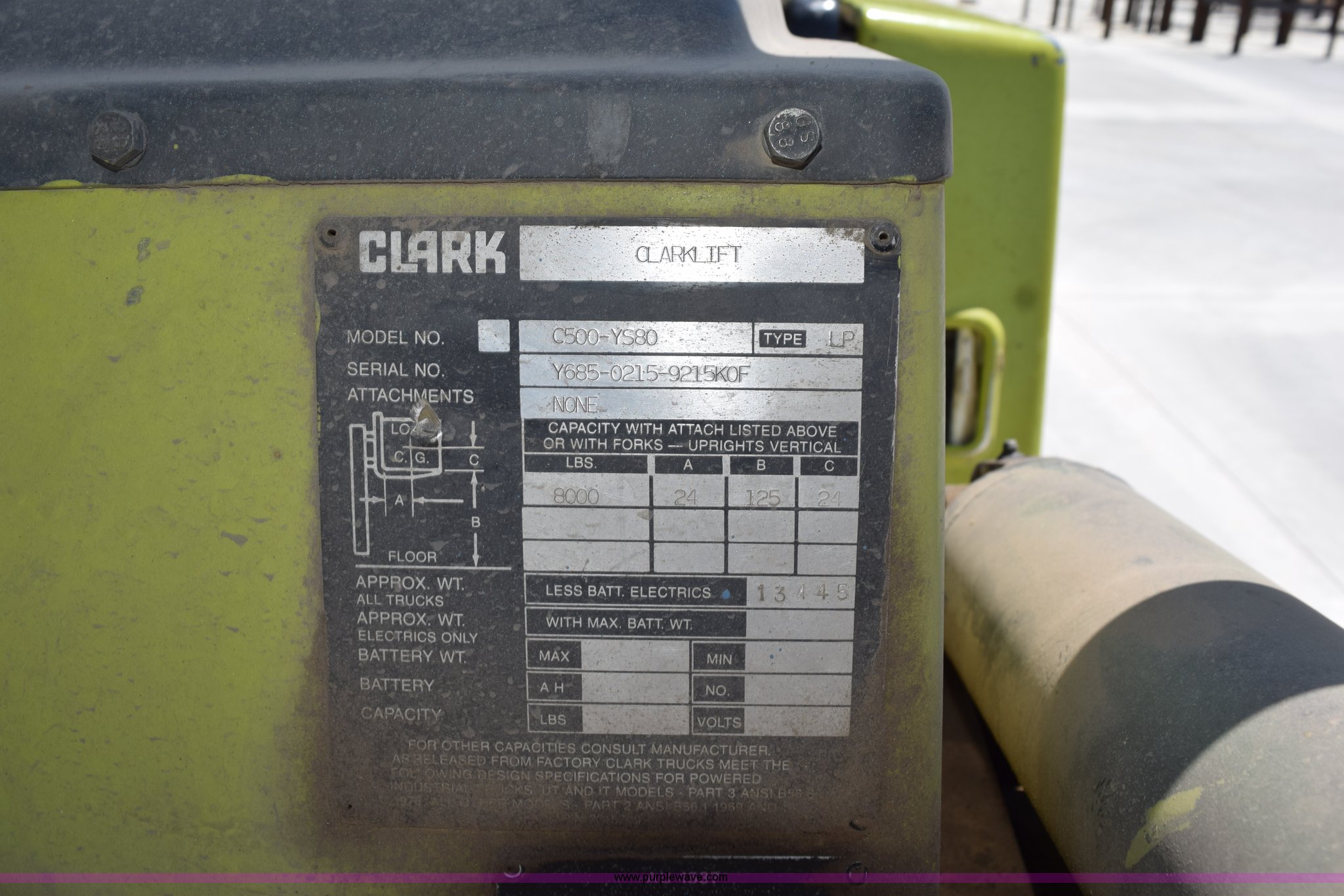 Clark C500-YS80 forklift. 7,373 hours on meter, Four cylinder propane engine, Shuttle shift transmission, 8,000 lbs maximum lift capacity, 3.5'L forks, 7.50 x 15 solid front tires, 7.00-12 solid rear tires, Serial Y685-0215-9215K0F. View equipment video. Gerard Tank & Steel Inc.. 1140 E 11th Street. Concordia, KS 66901