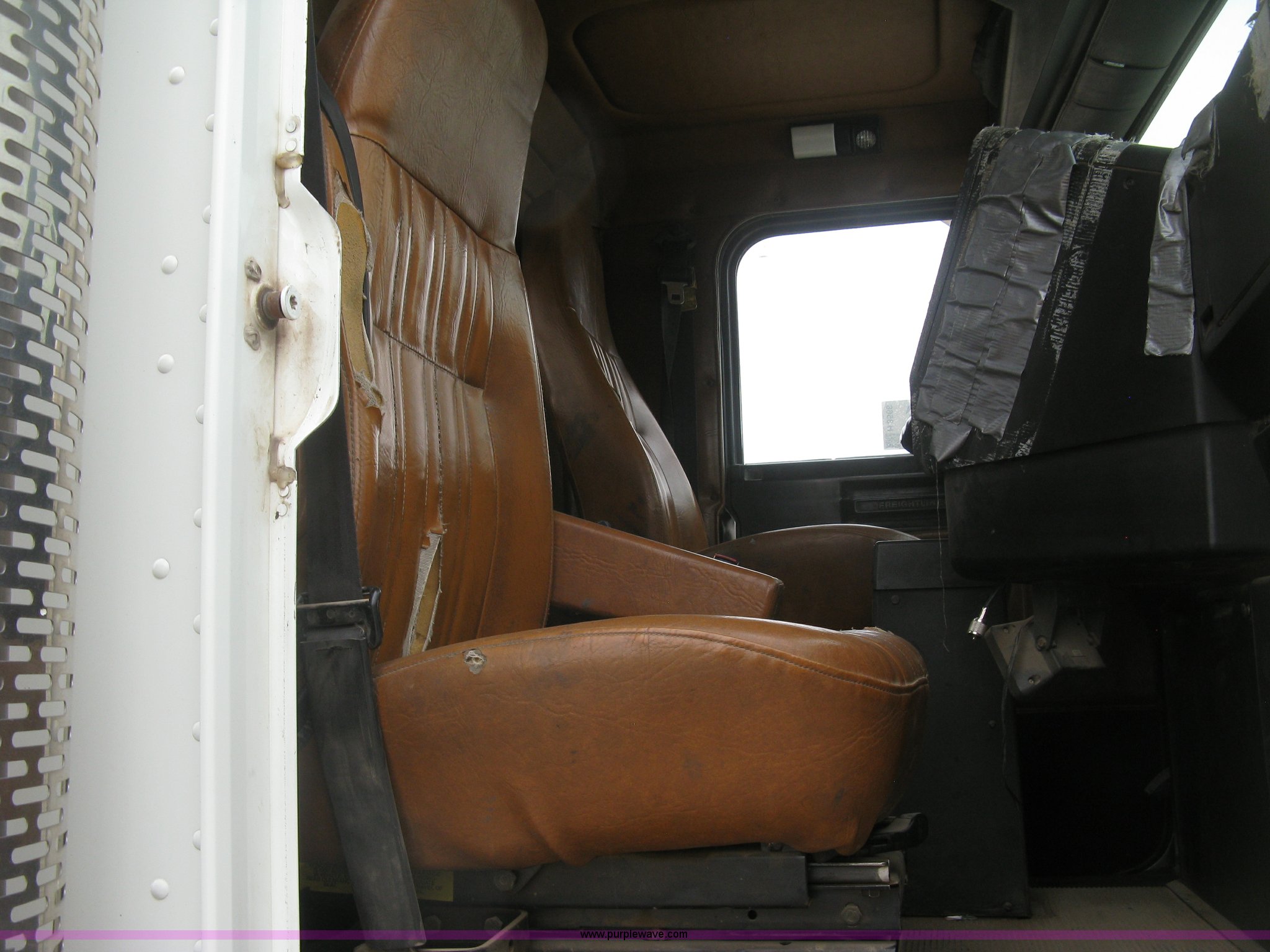 1999 Freightliner FLD120SD semi truck. 539,195 miles on odometer, 3,459 hours on meter, Caterpillar 10.3L L6 diesel engine, Automatic transmission, Inter-axle differential lock, AC and heat, AM/FM, Power and heated mirrors, Spring suspension seat, Air ride cab, Beacon light, Block heater, PTO, Wet kit, Aluminum headache rack Chain hanger, Aluminum air operated sliding fifth wheel plate, Single exhaust stack, Single 100 gallon fuel tank, Mud flaps, Air brakes, Engine brake, Half fenders, 180" wheelbase, 11R22.5 tires, GVWR 58,000 lbs, FAWR 12,000 lbs, IAWR 23,000 lbs, RAWR 23,000 lbs, Seat cover damaged, Interior/exterior cosmetic damage, Hood damaged, Unit# 186. 1FUYFEDB0XPB41738. Mies Construction. 1919 Southwest Blvd.. Wichita, KS 67213