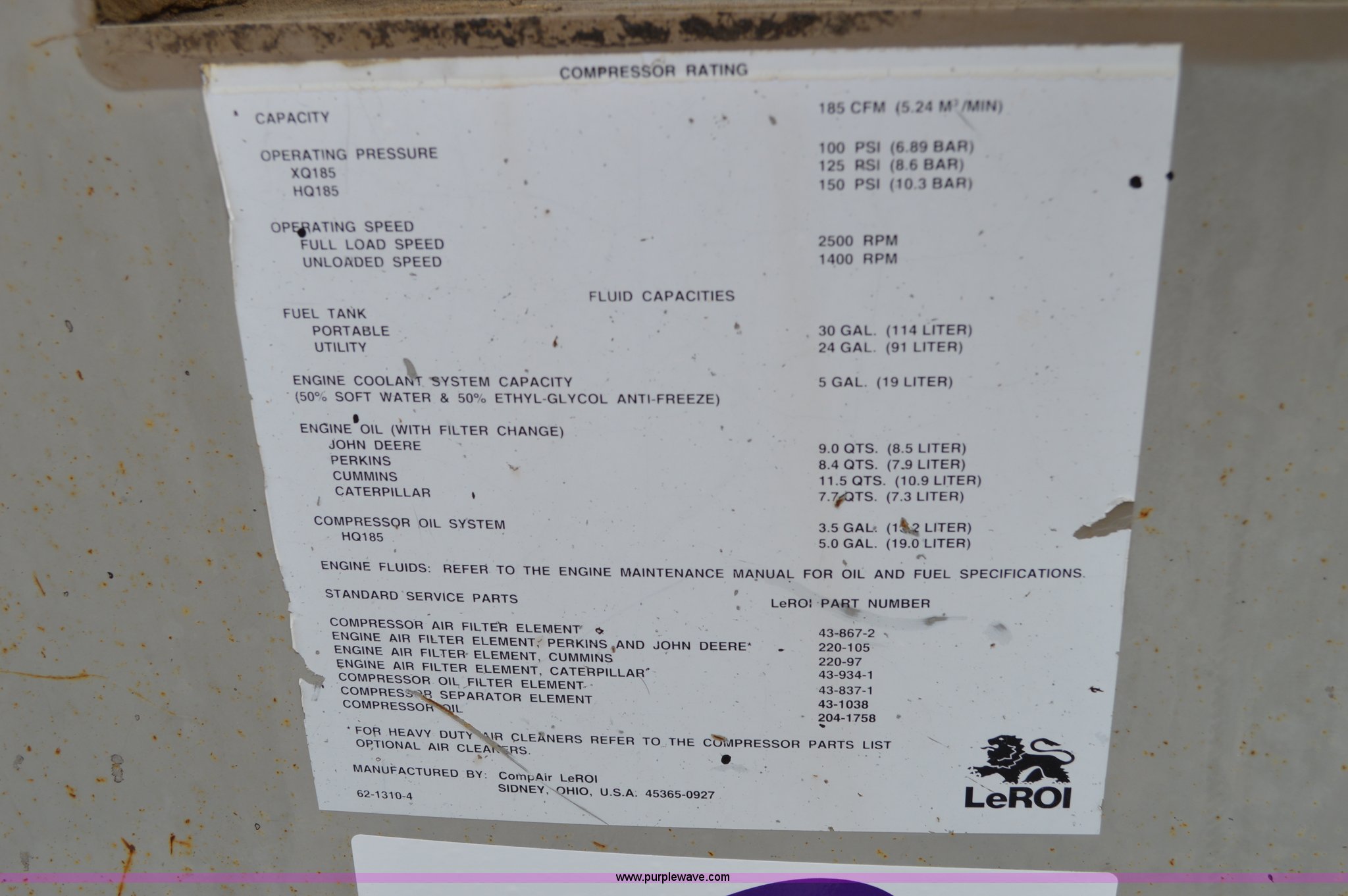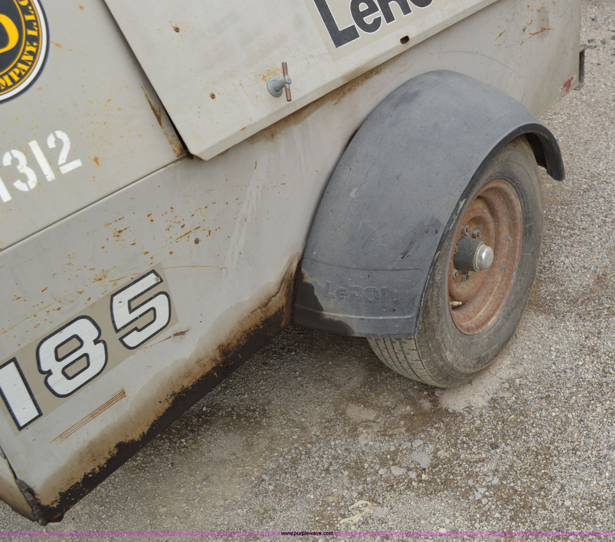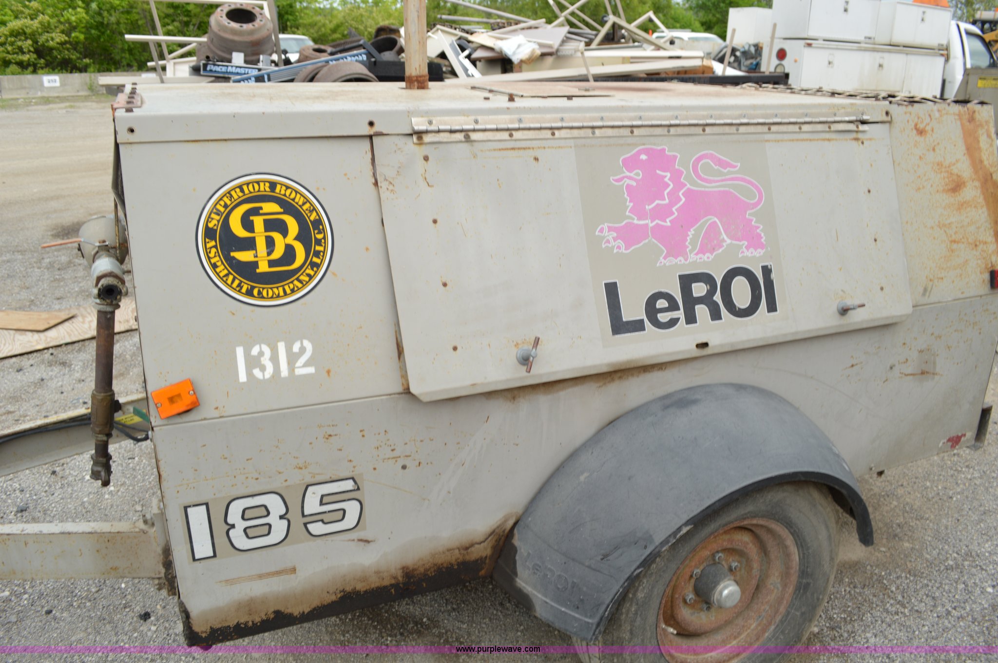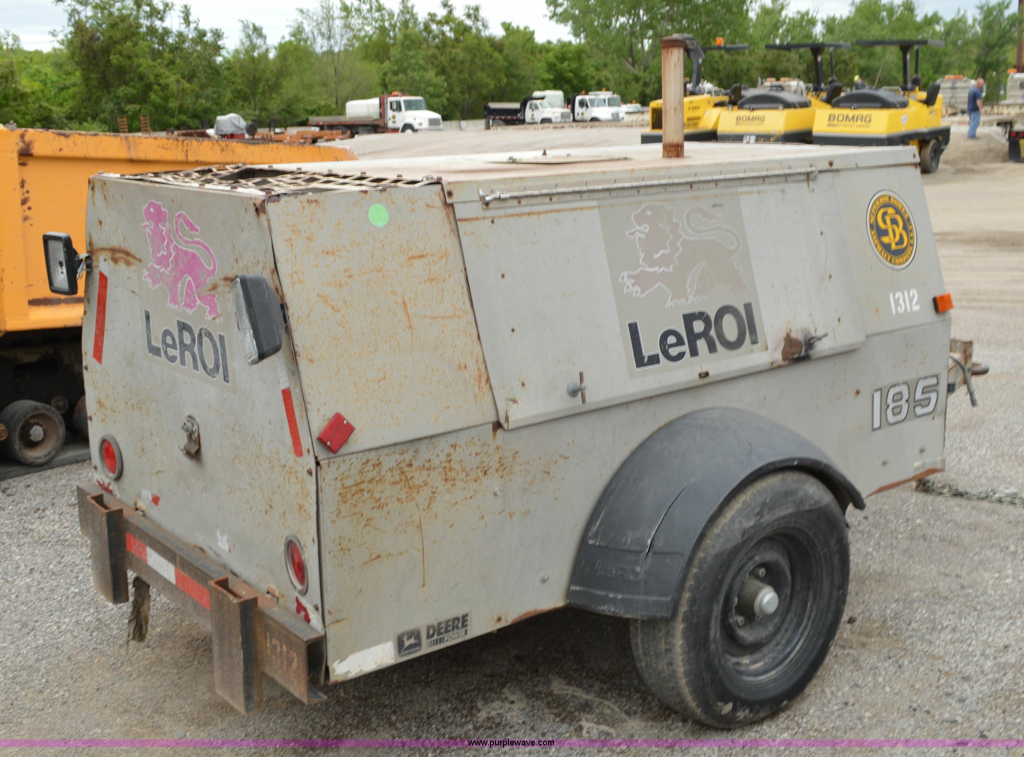 Leroi 185 air compressor. 4,723 hours on meter, John Deere four cylinder diesel engine, Jack stand, Pintle hitch, 225/75R15 tires, Unit# 1312. Superior Bowen Asphalt Company. 2501 Manchester Trafficway. Kansas City, MO 64129