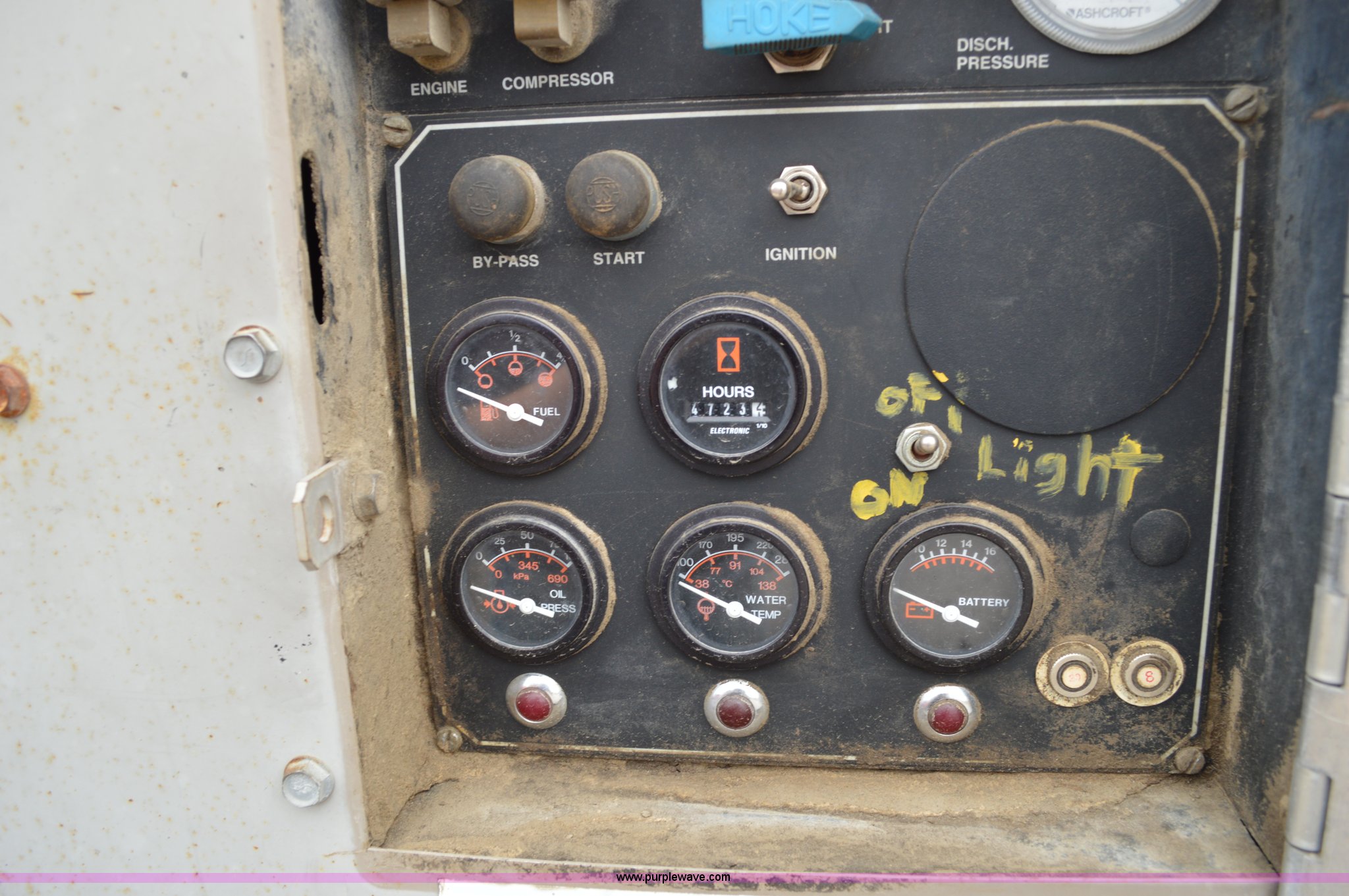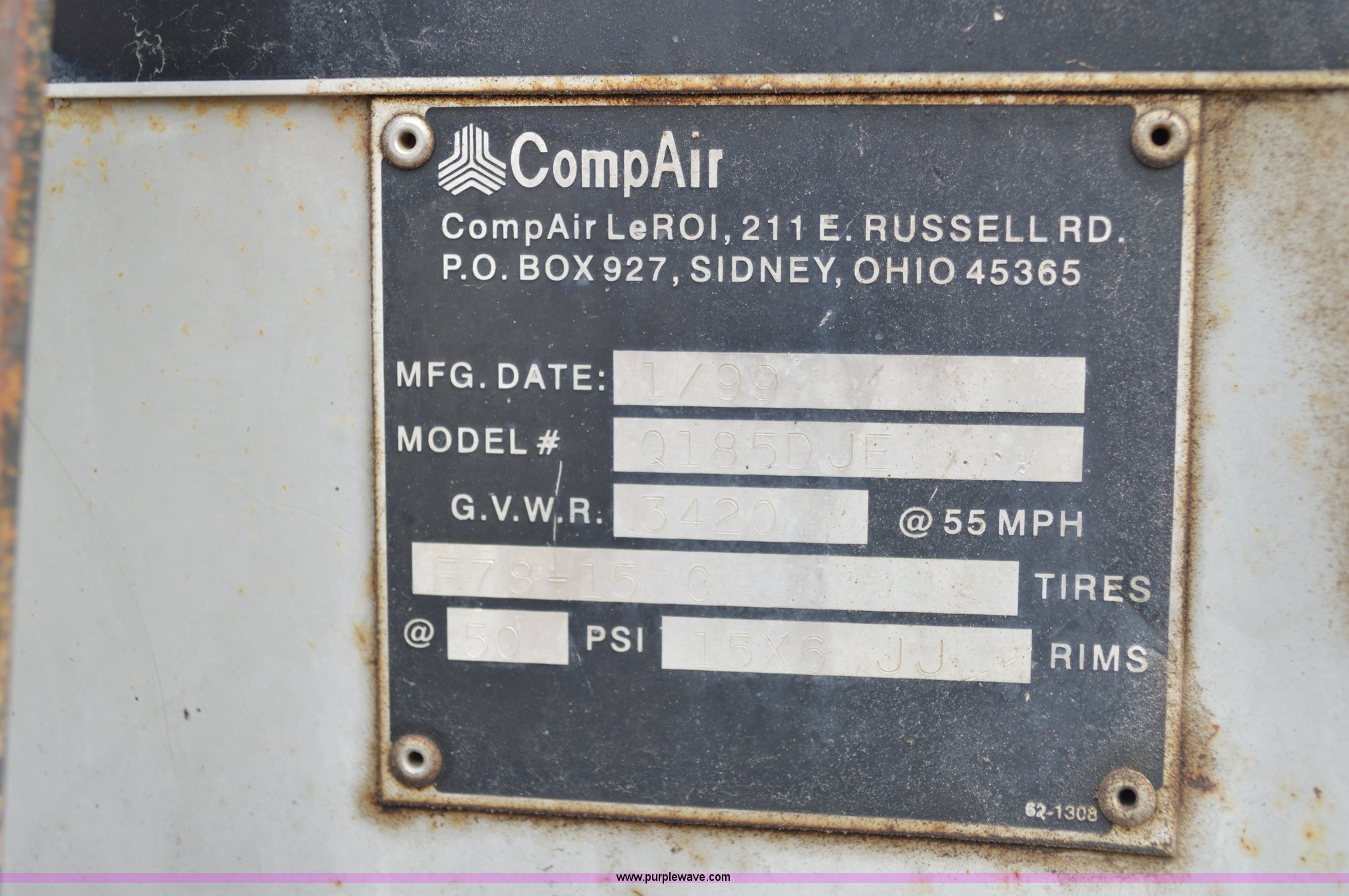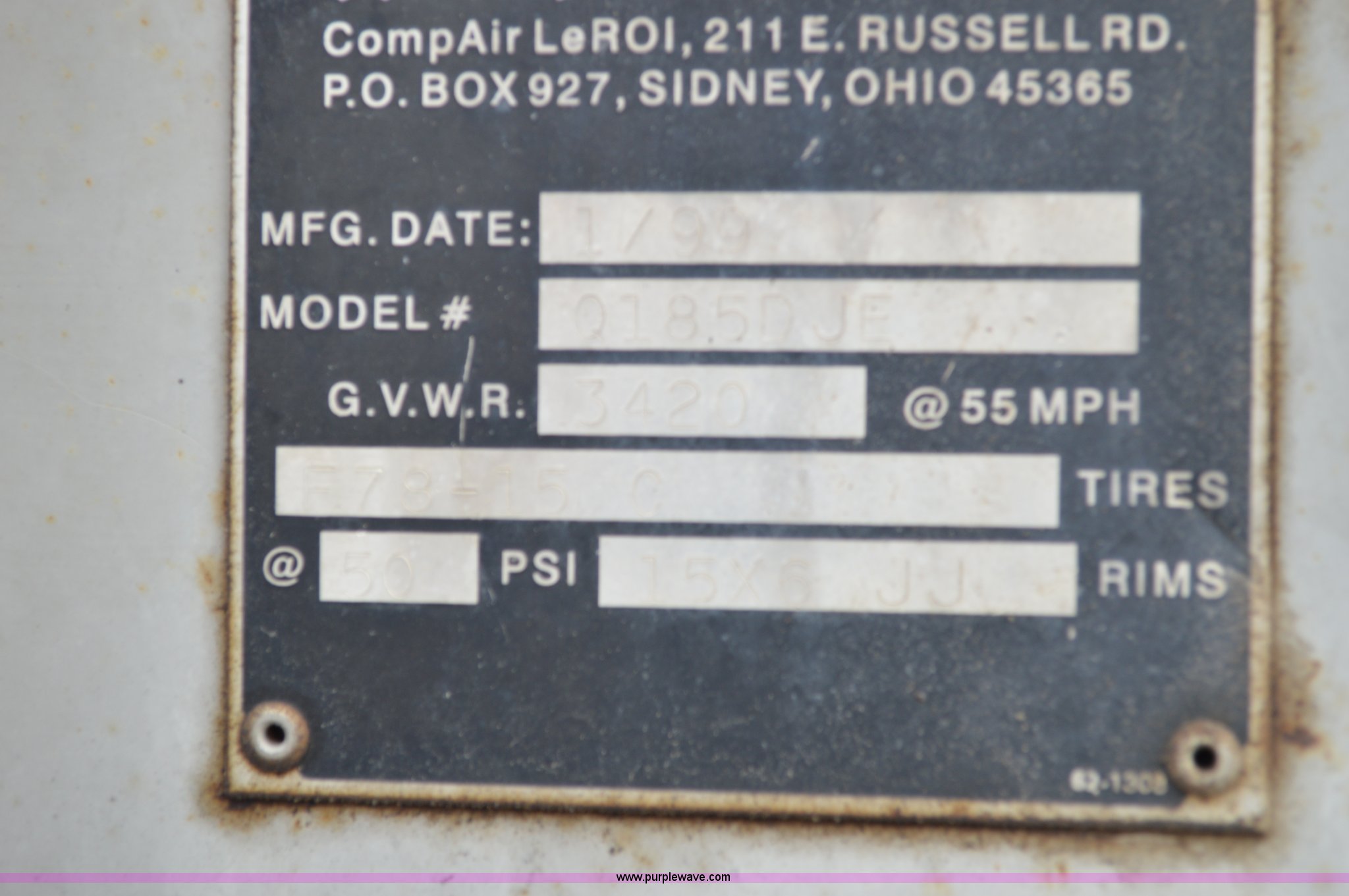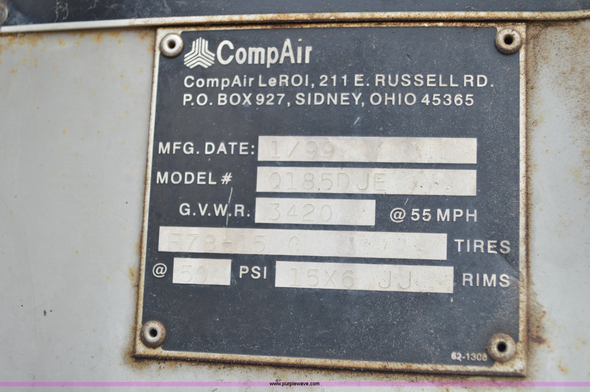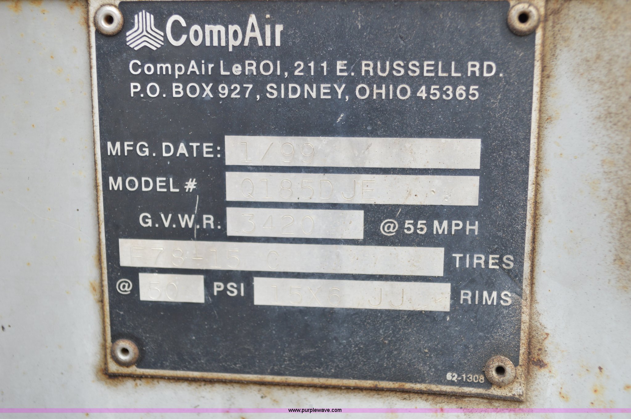 Leroi 185 air compressor. 4,723 hours on meter, John Deere four cylinder diesel engine, Jack stand, Pintle hitch, 225/75R15 tires, Unit# 1312. Superior Bowen Asphalt Company. 2501 Manchester Trafficway. Kansas City, MO 64129