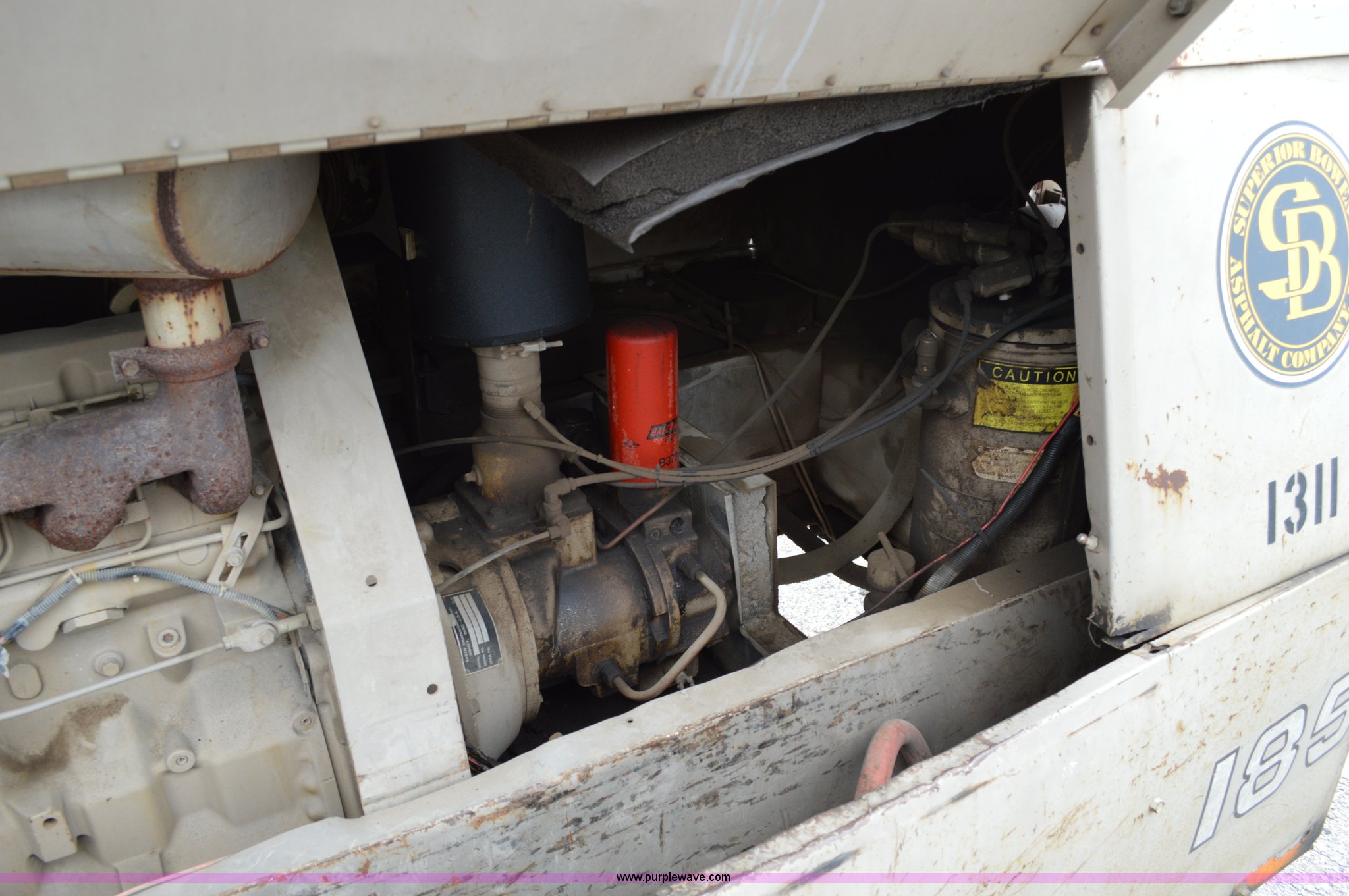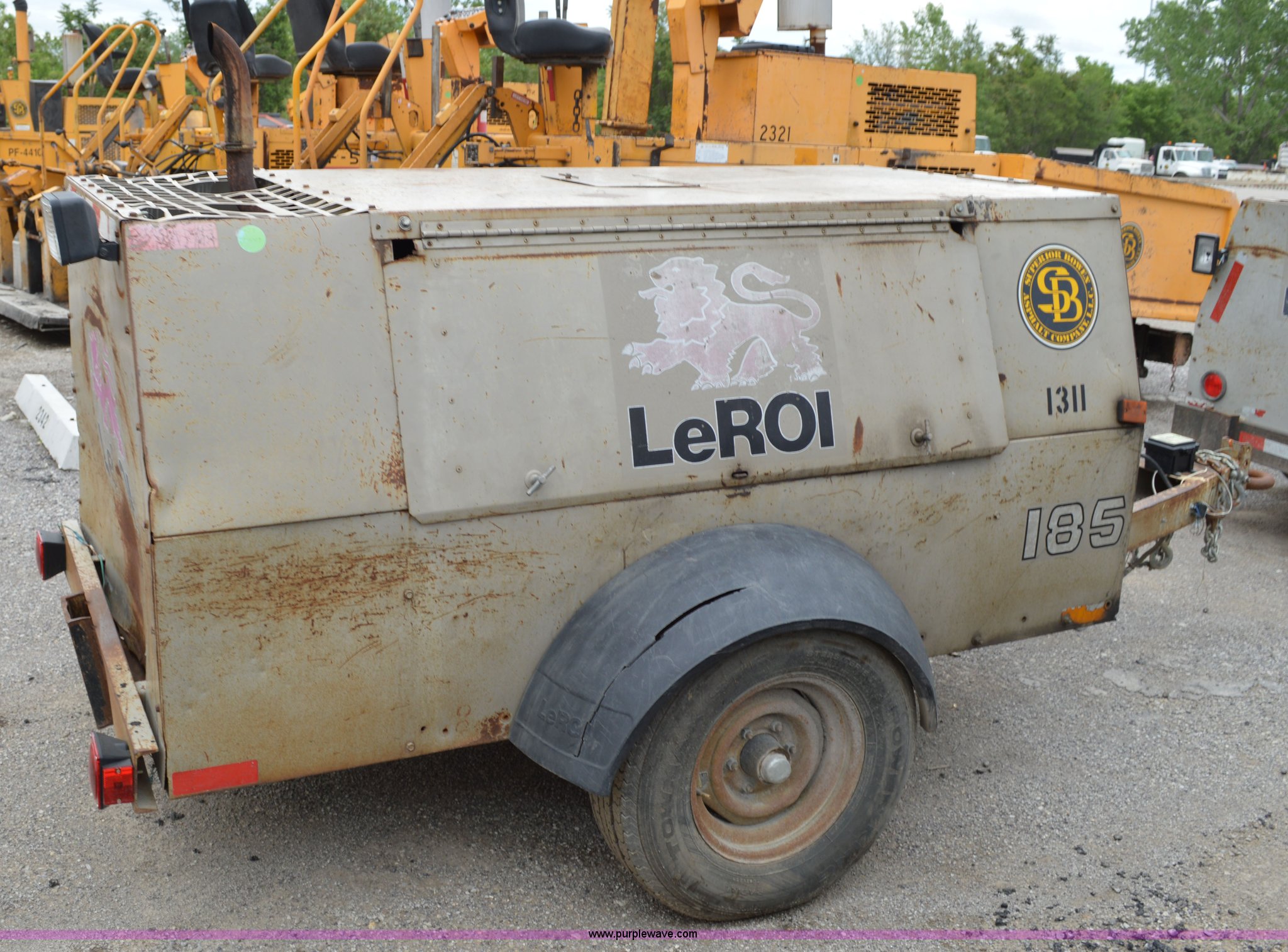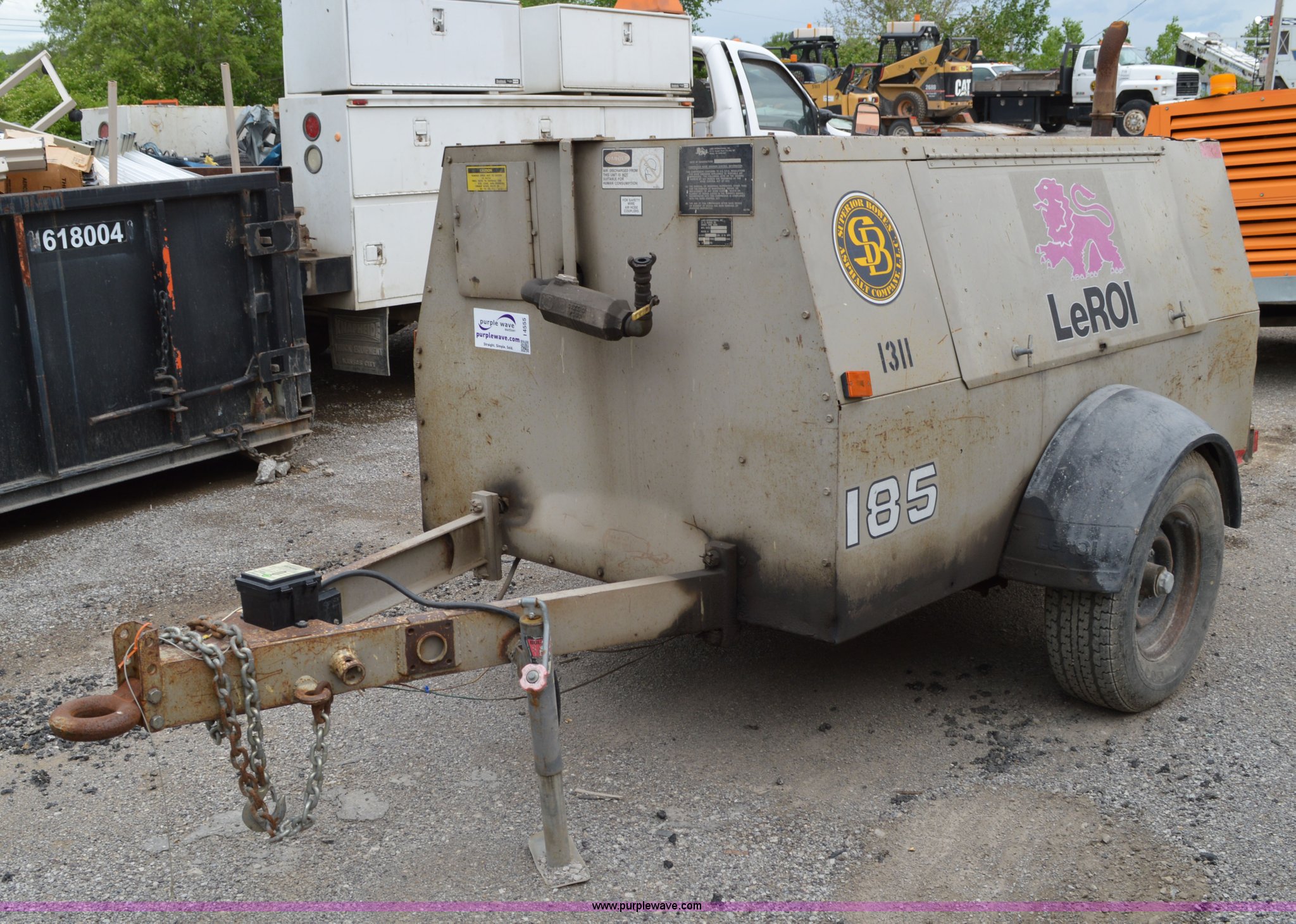 Leroi 185 air compressor. 4,325 hours on meter, John Deere four cylinder diesel engine Serial CD4039D170258, Jack stand, Pintle hitch, Unit# 1311. Superior Bowen Asphalt Company. 2501 Manchester Trafficway. Kansas City, MO 64129