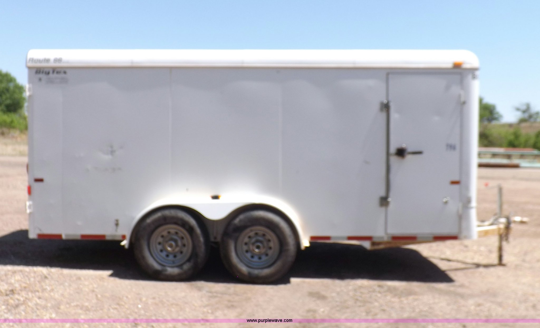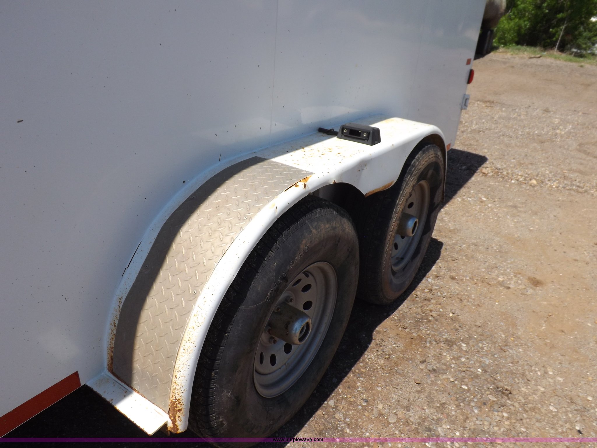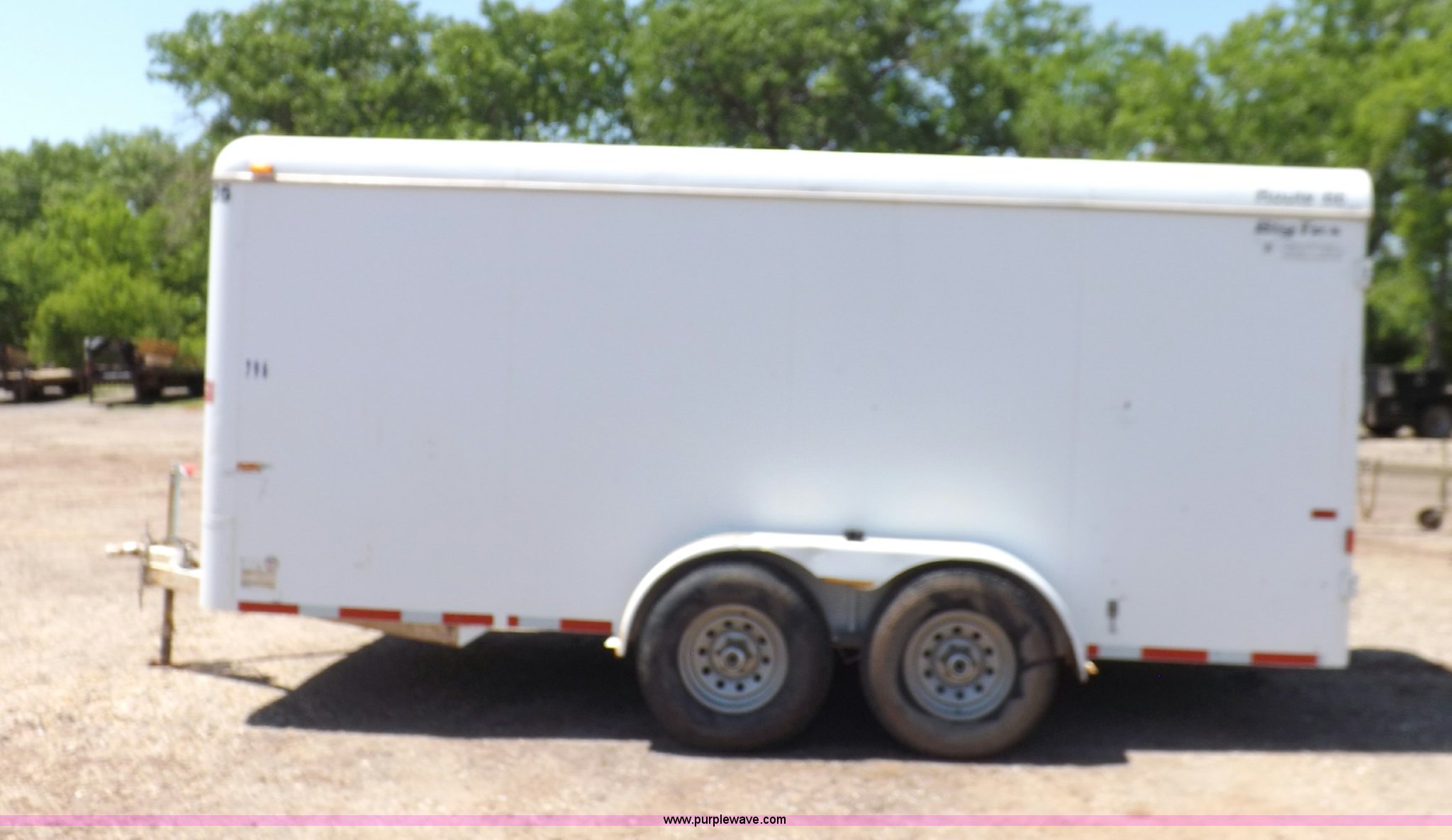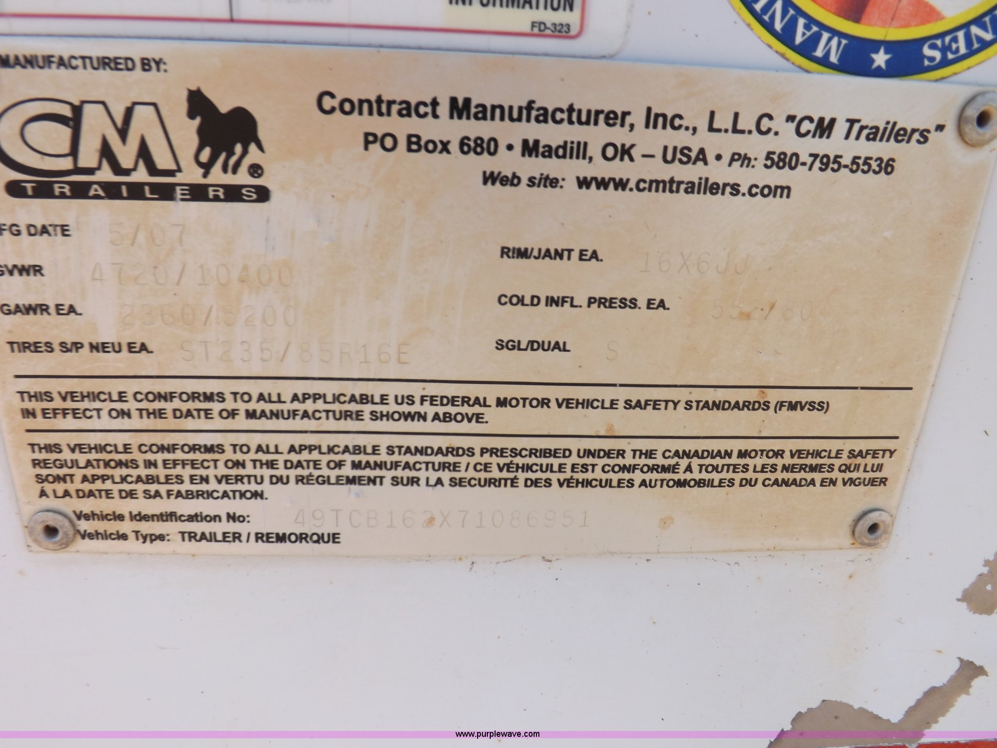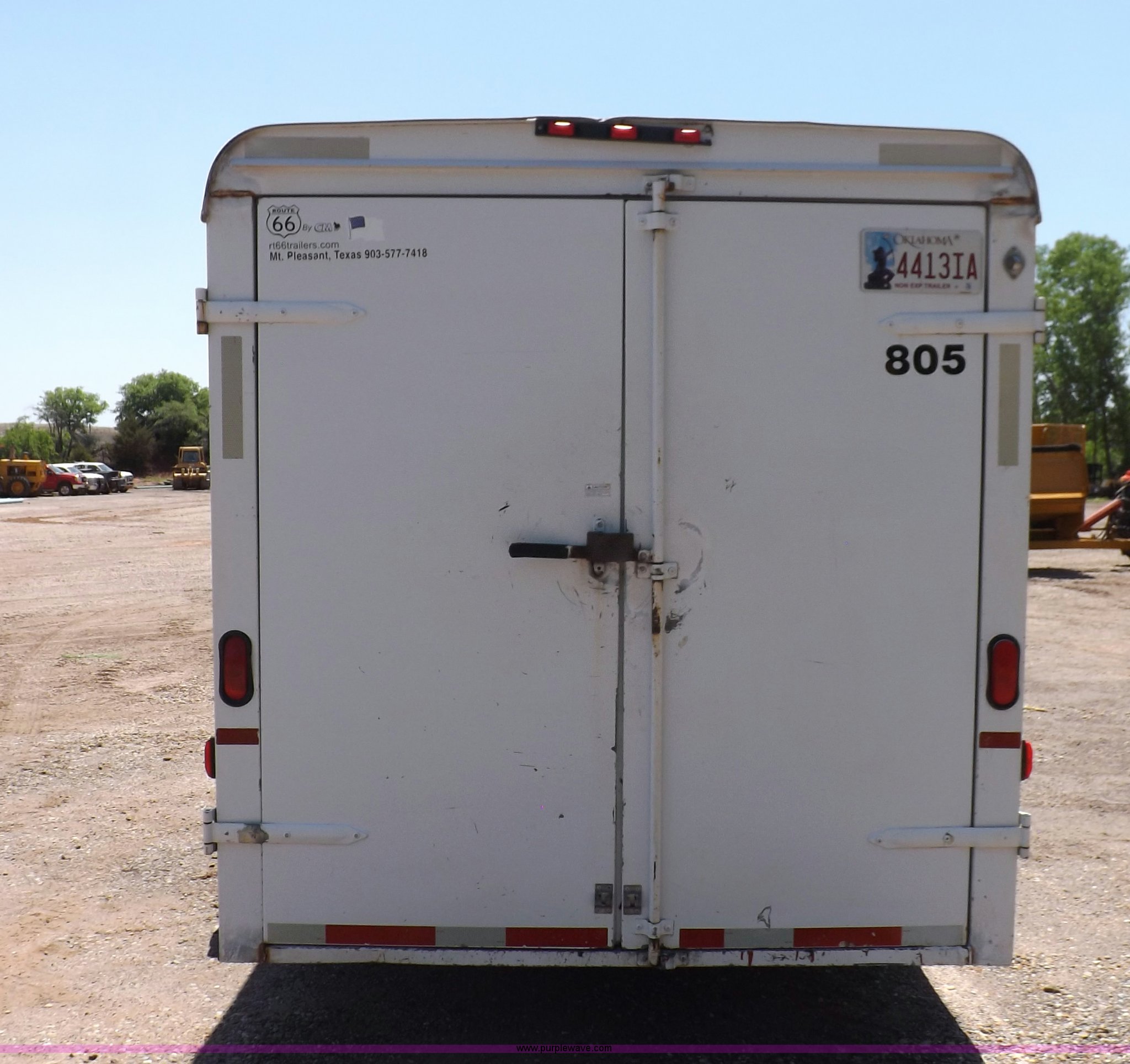 Purple Wave is selling a used Car or Utility Trailer in Oklahoma. This item is a 2007 CM enclosed trailer with the following: 16'4"L x 6'8"W x 6'8"H, 3'L tongue, Side entry door, Dual rear swing-out doors, Wood deck, Interior shelving, Bull dog jack stand, 2 5/16" ball hitch, Safety break-away system, Seven pin trailer wiring, 235/85R16 tires, GVWR 10,400 lbs, Sheet metal damaged, Lamp damaged