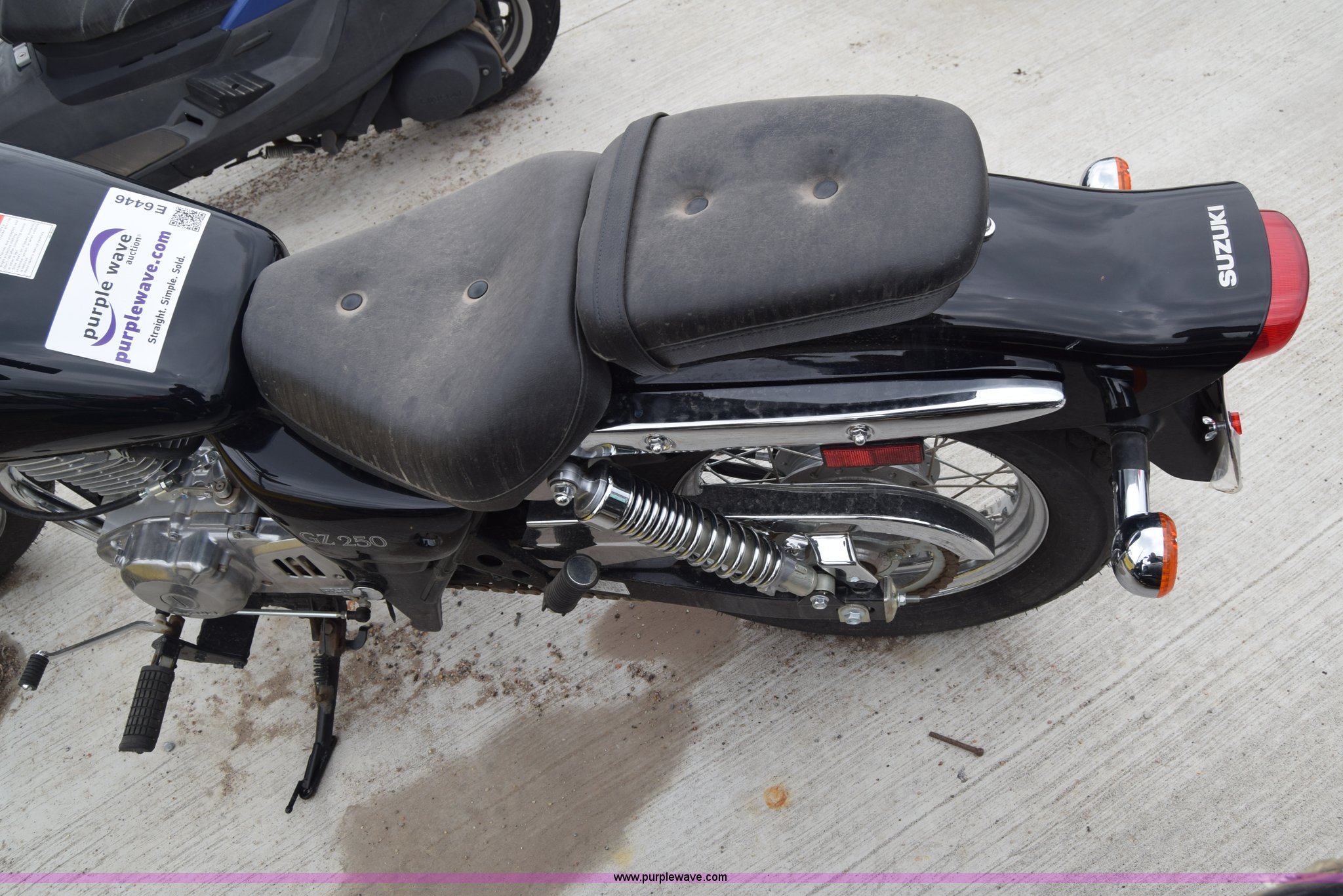 Purple Wave is selling a used Motorcycle in Kansas. This item is a 2009 Suzuki GZ250 motorcycle with the following: 29 miles on odometer, Actual mileage unknown, 249cc gas engine, Manual transmission, 110/90-16 front tire, 130/90-15 rear tire, Case# 11C028216
