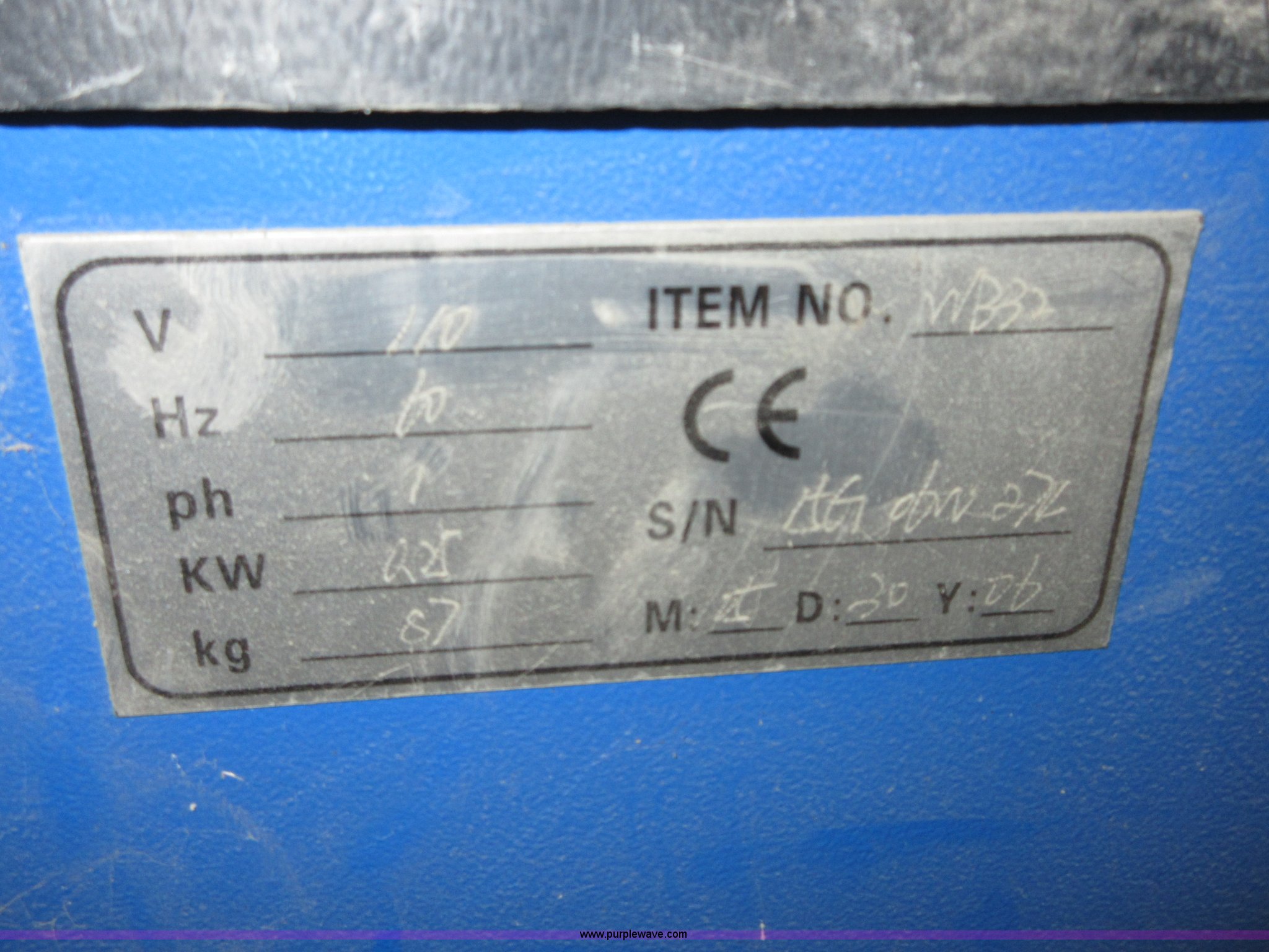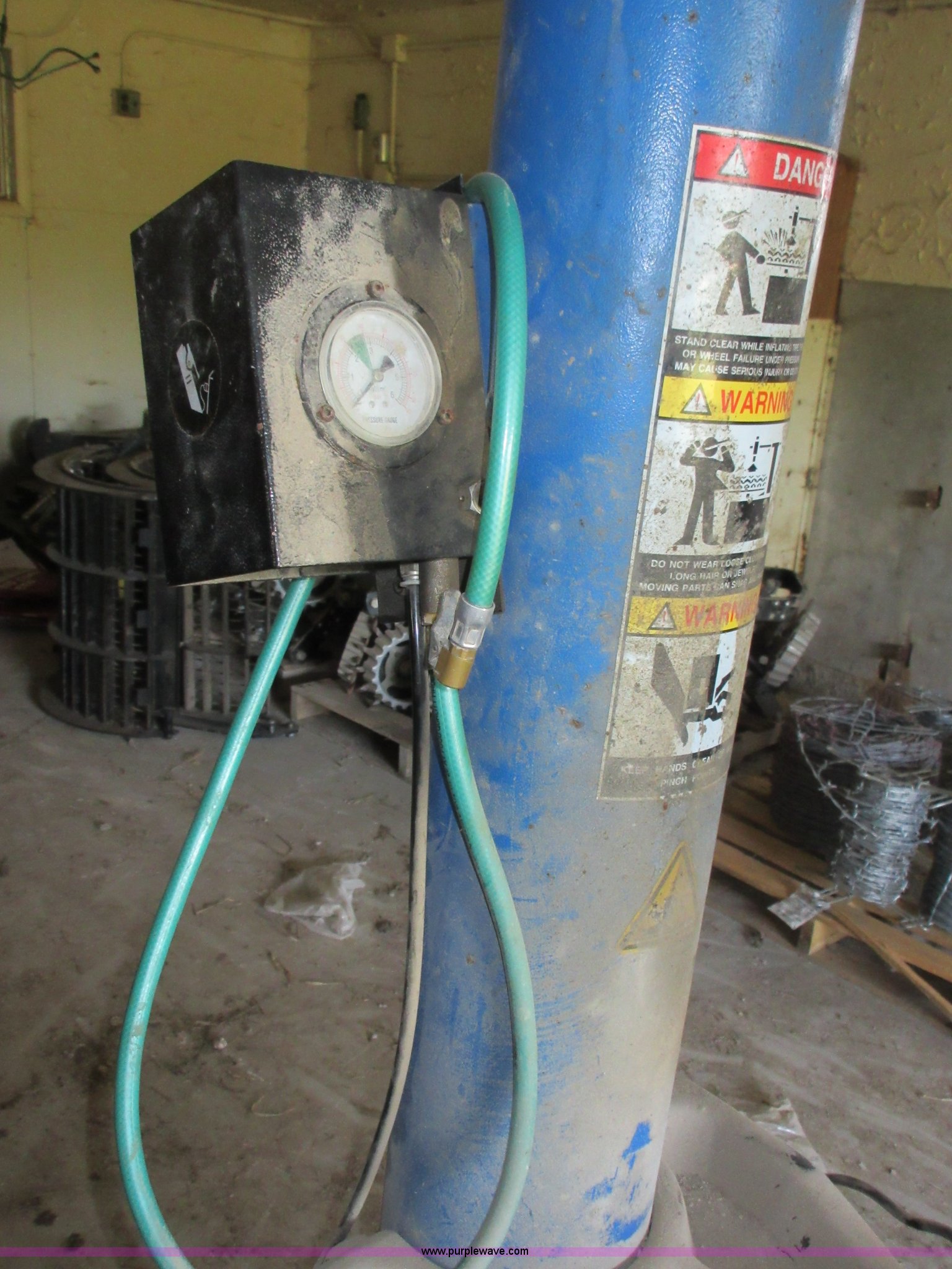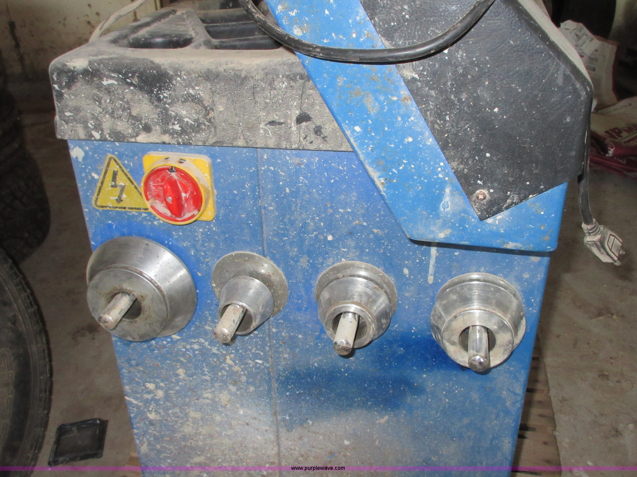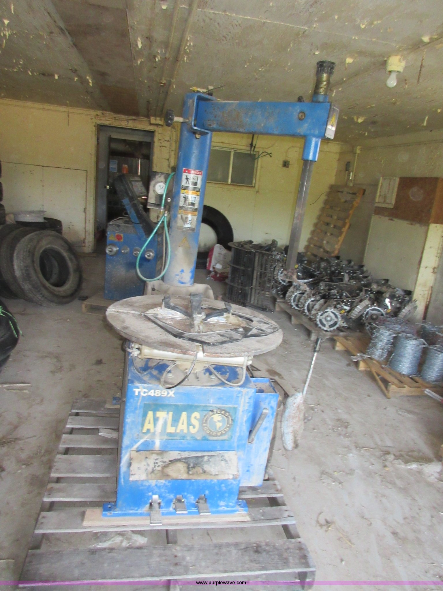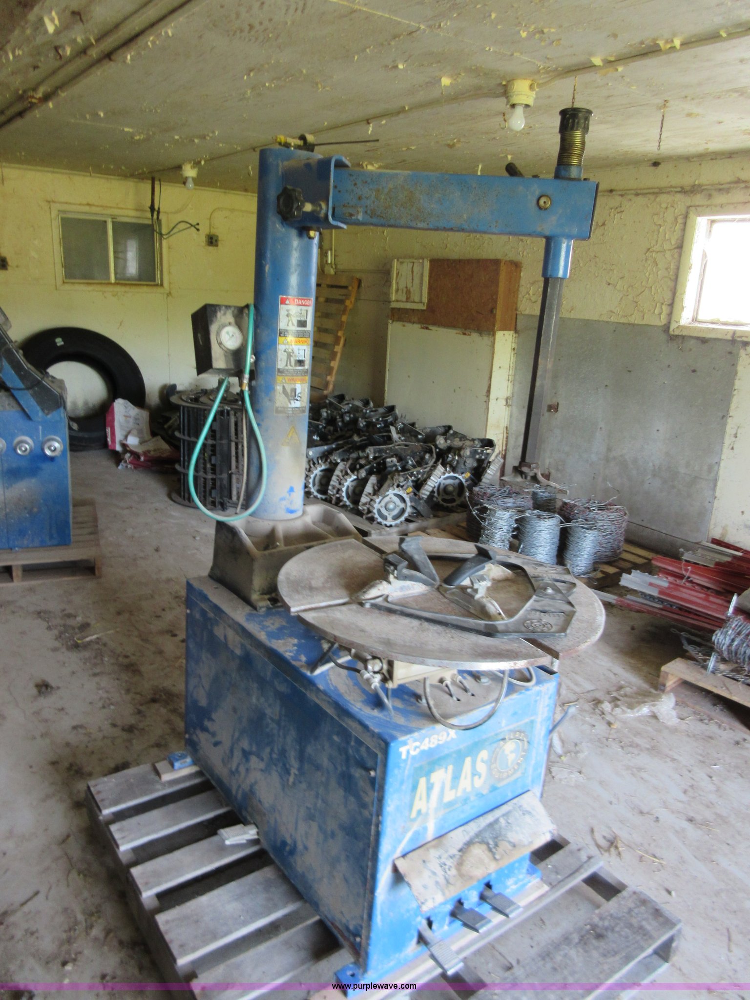 Purple Wave is selling a used Tools in Kansas. This item is a Atlas TC489X tire machine with the following: 110V, Air operated turn table, Bead breaker, Serial 82614W172, Atlas WB32 tire balancing machine, 110V, (4) wheel adapters, Belt broken