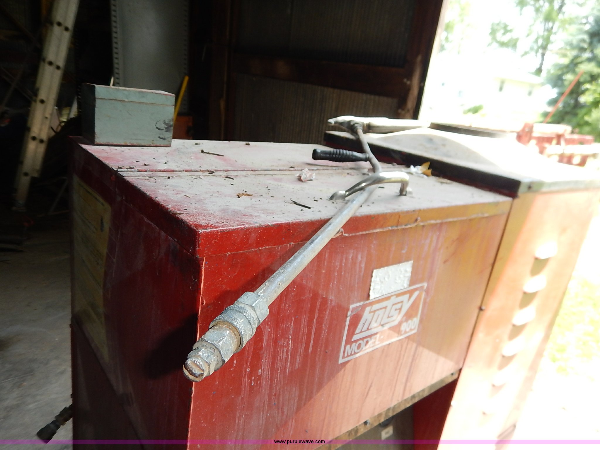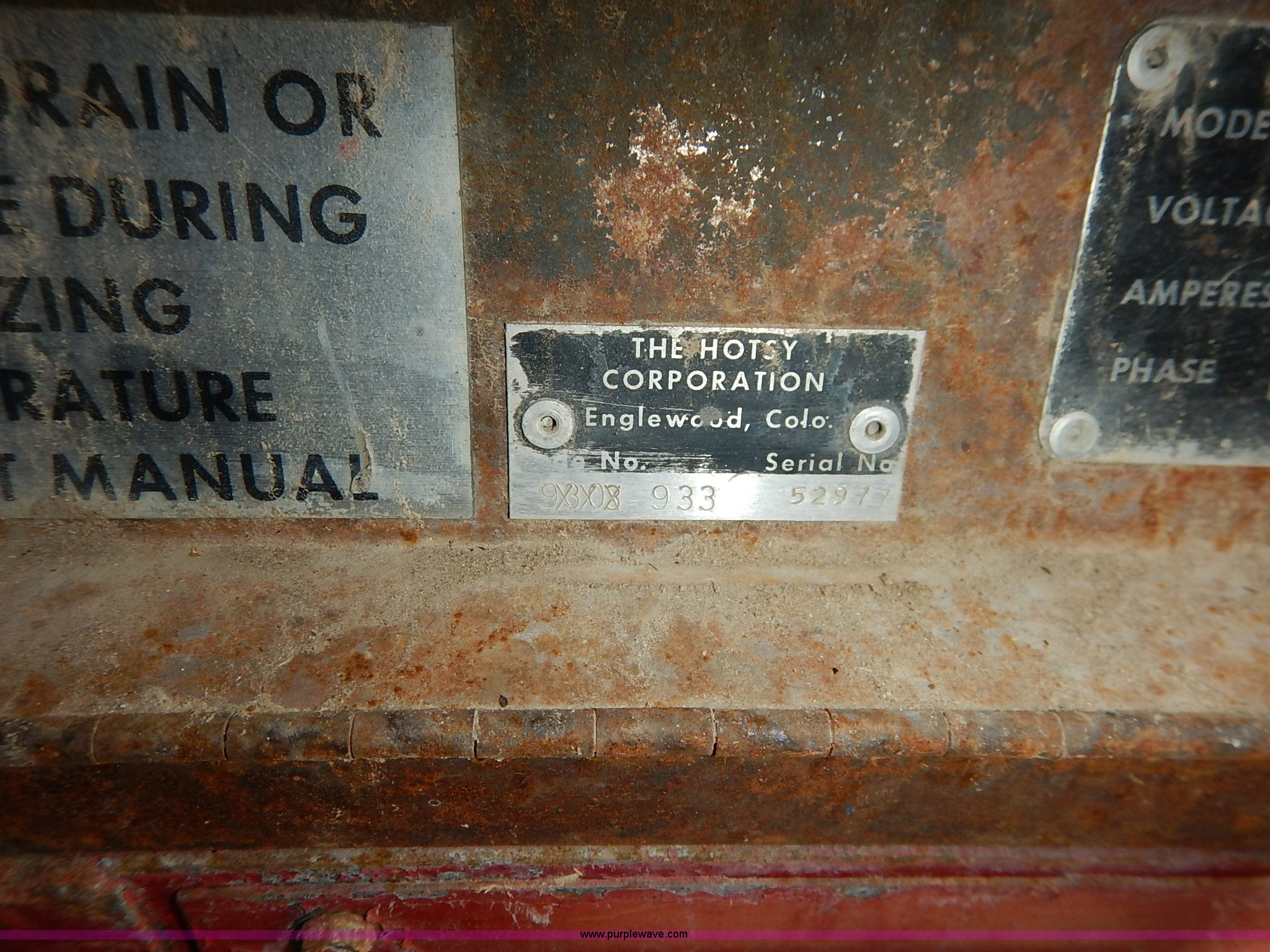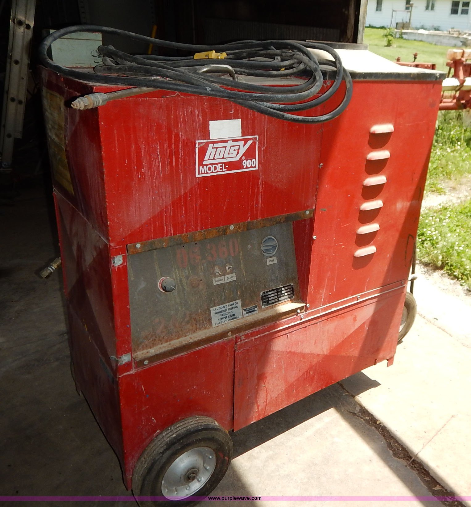 Purple Wave is selling a used Pressure Washer in Kansas. This item is a Hotsy 900 pressure washer with the following: Hose and wand, Quick attach water coupler, 440/220V, Three phase, 420,000 BTU input, Oil fired, Serial 52977