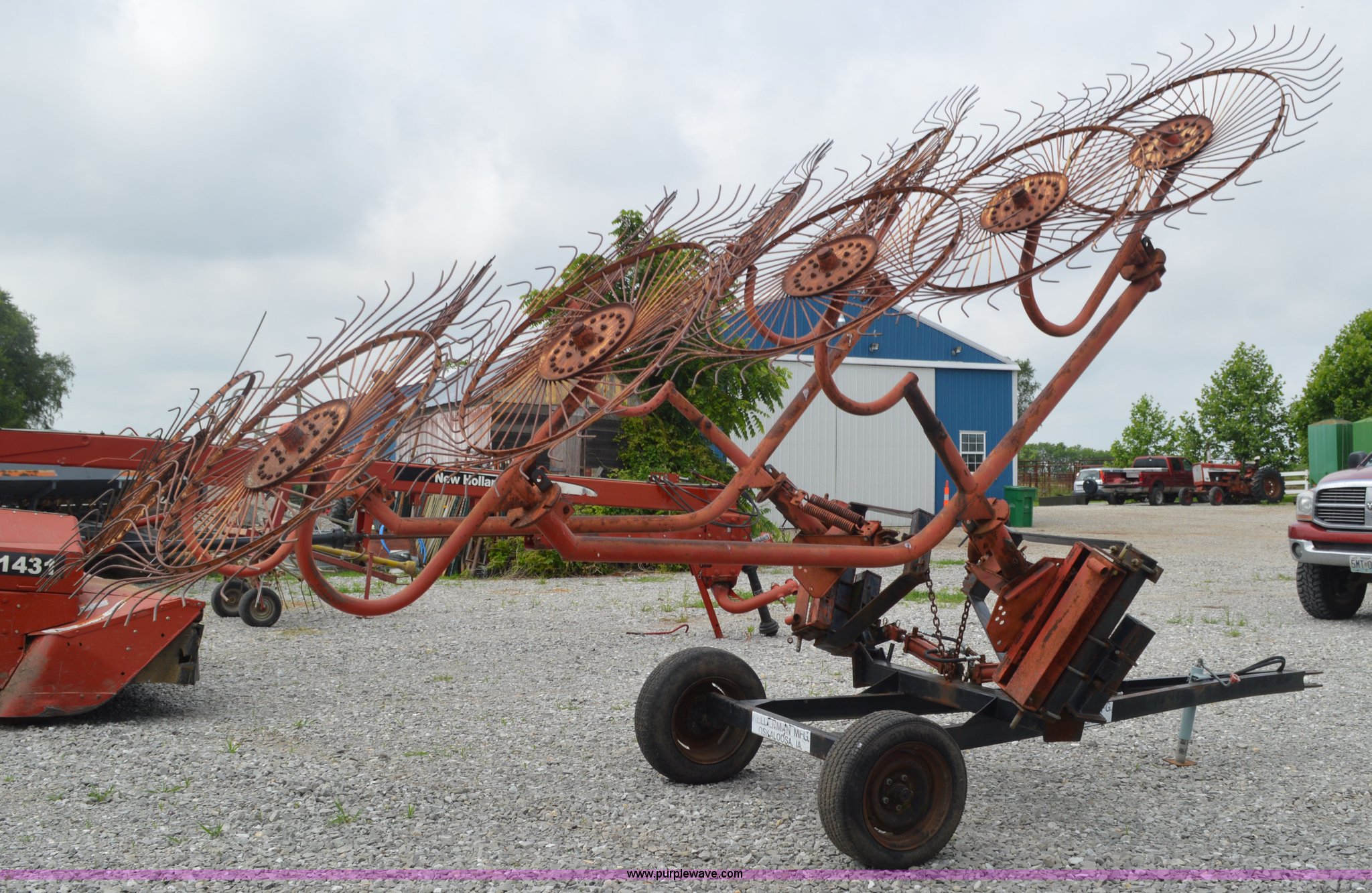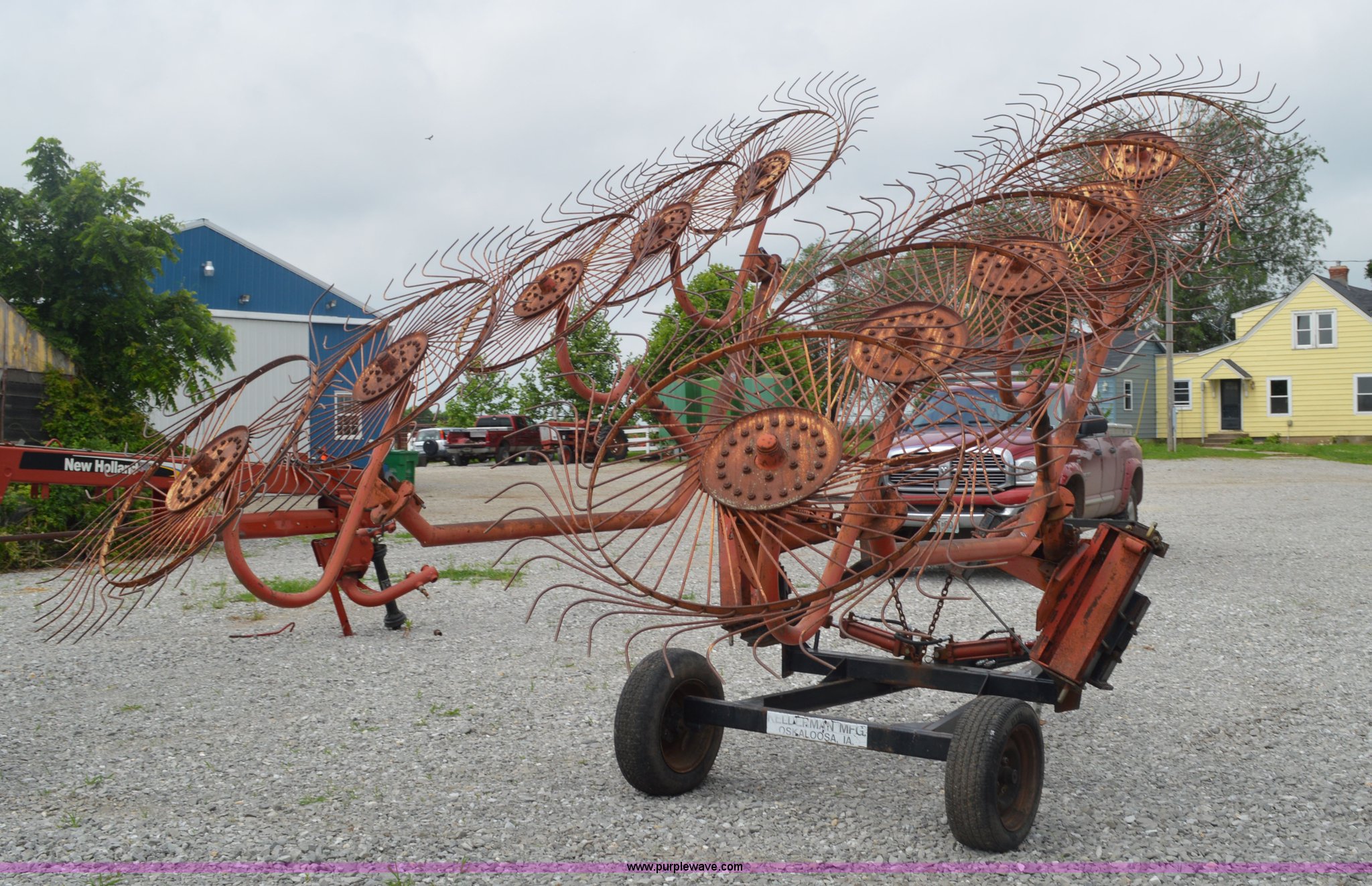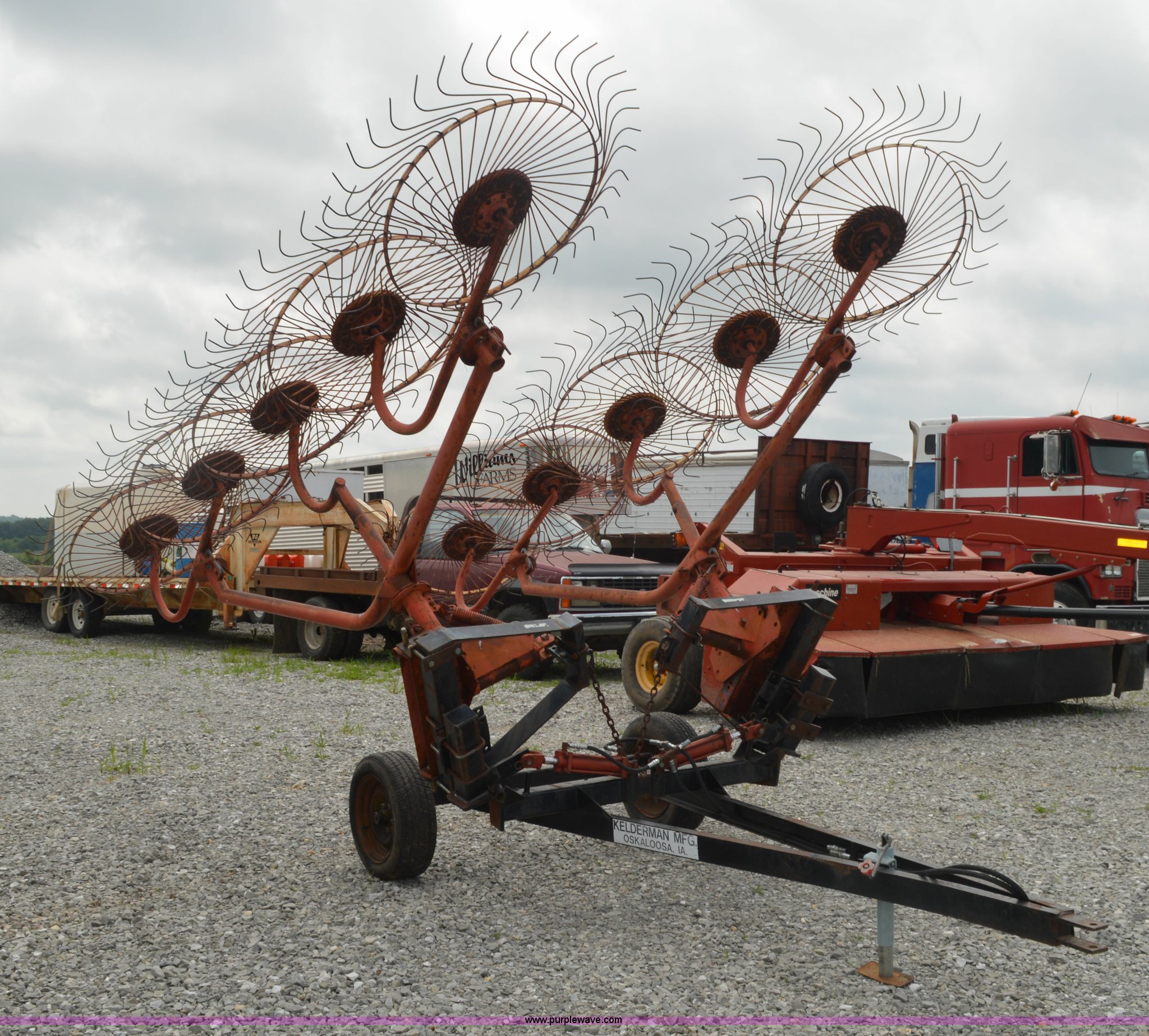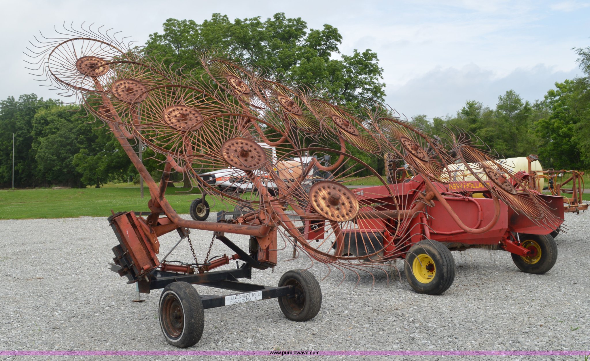 Purple Wave is selling a used Hay Rake in Missouri. This item is a Kelderman hay rake with the following: 10 wheels, Pin hitch, Manual jack, 185/60R14 tires, Serial KRCTT883