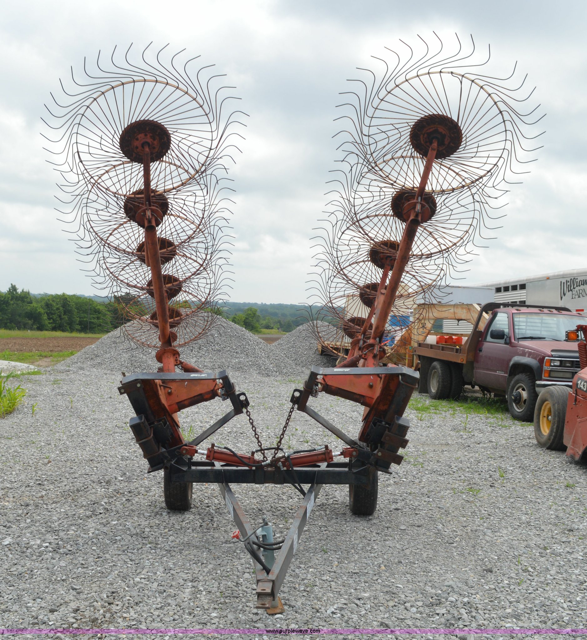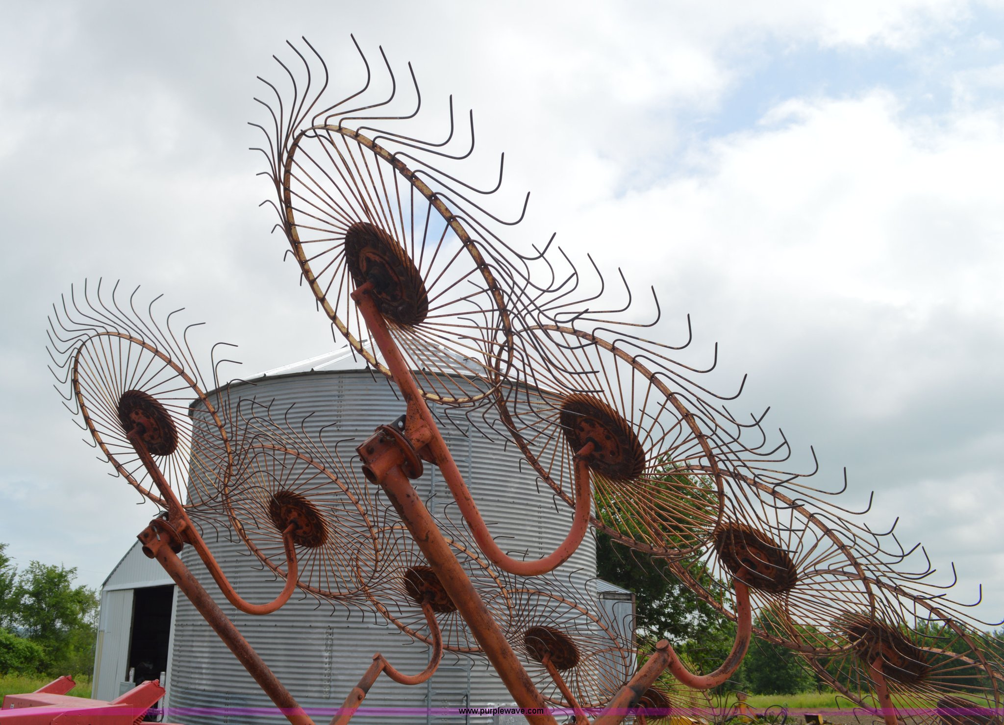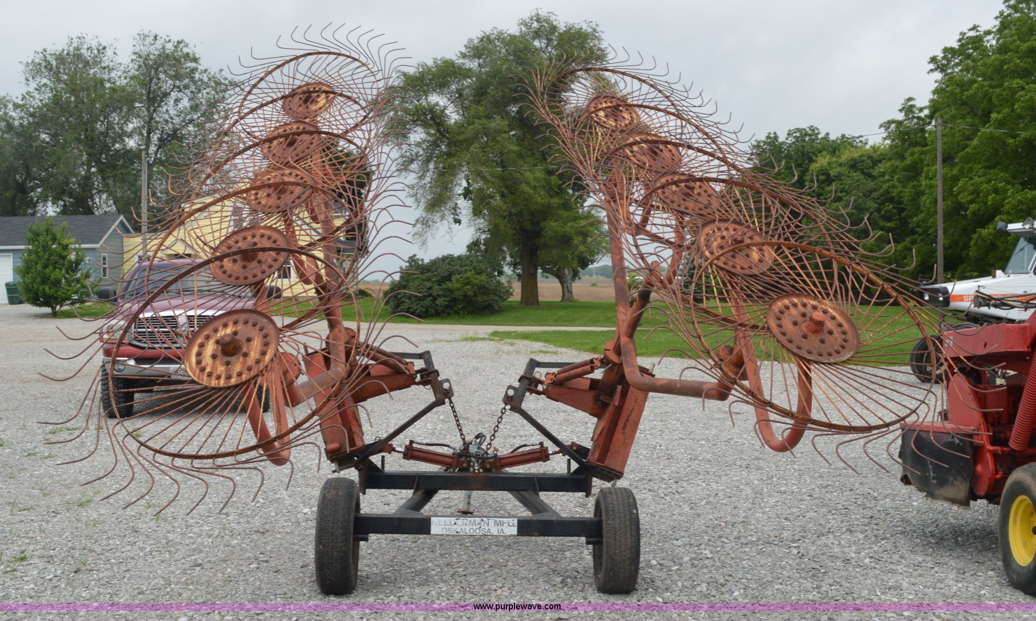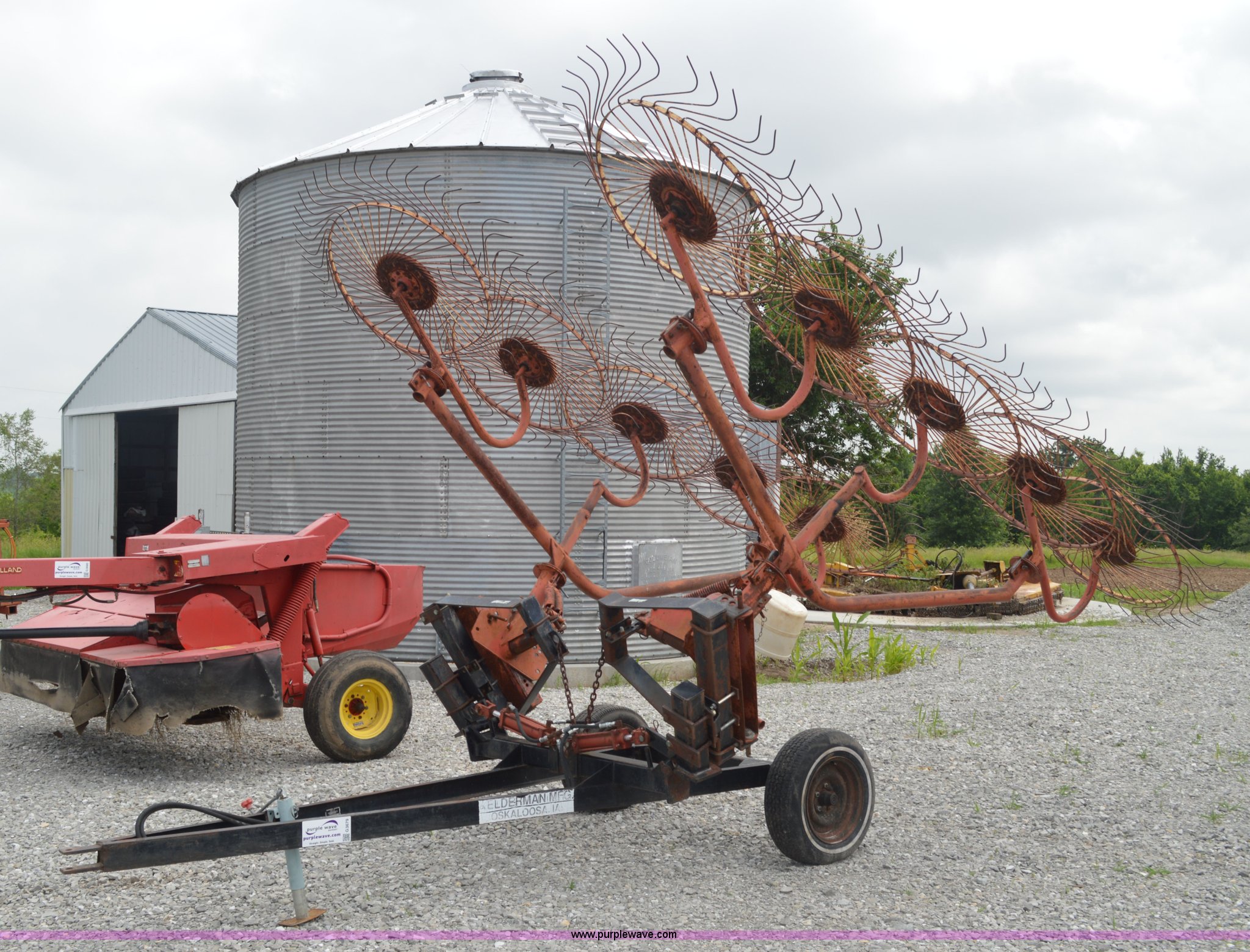 Purple Wave is selling a used Hay Rake in Missouri. This item is a Kelderman hay rake with the following: 10 wheels, Pin hitch, Manual jack, 185/60R14 tires, Serial KRCTT883
