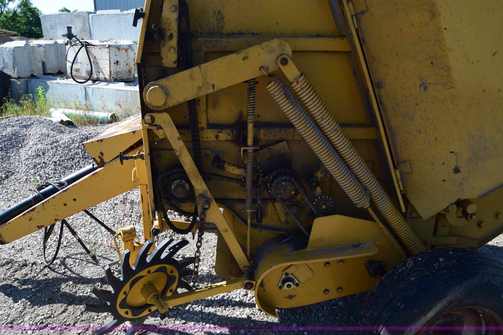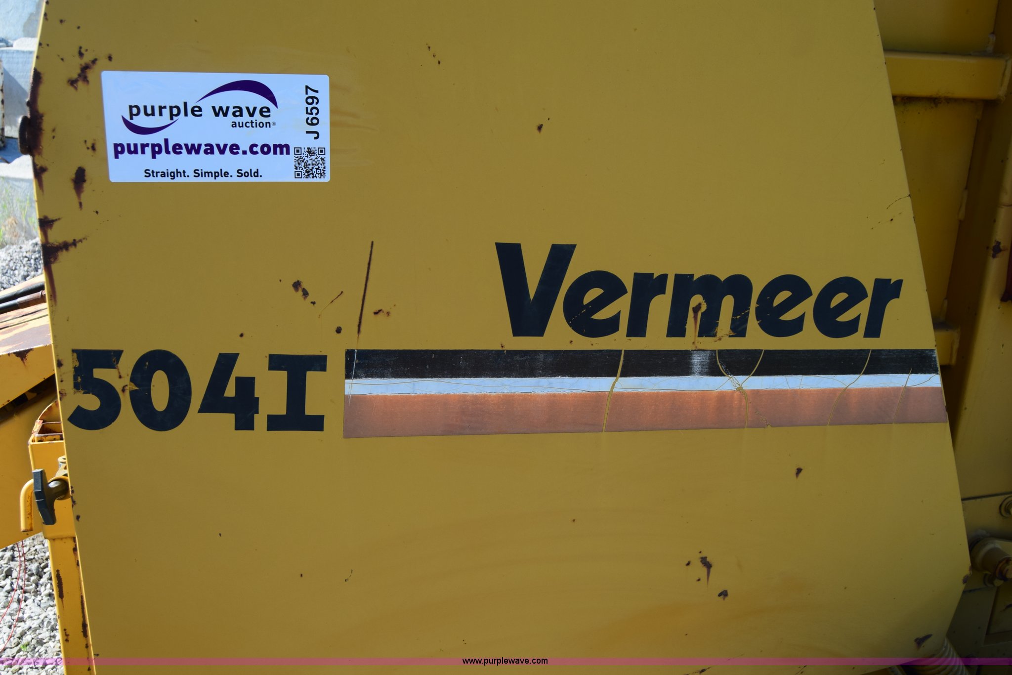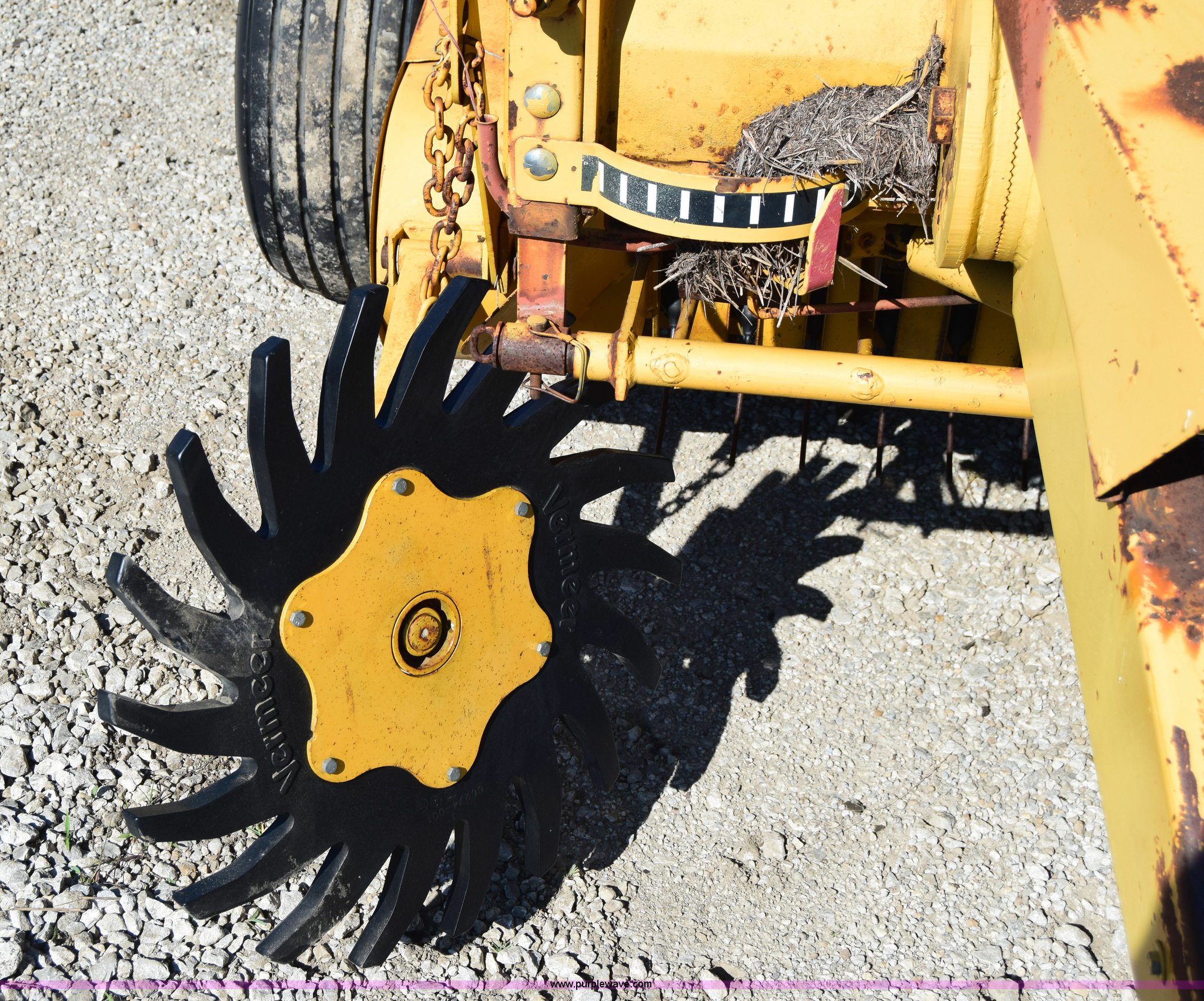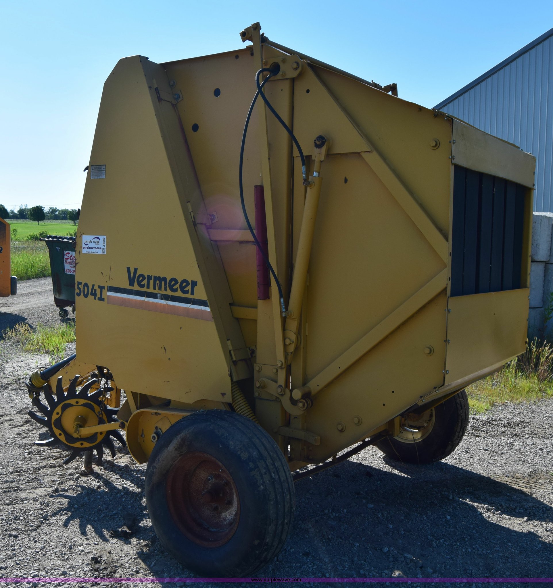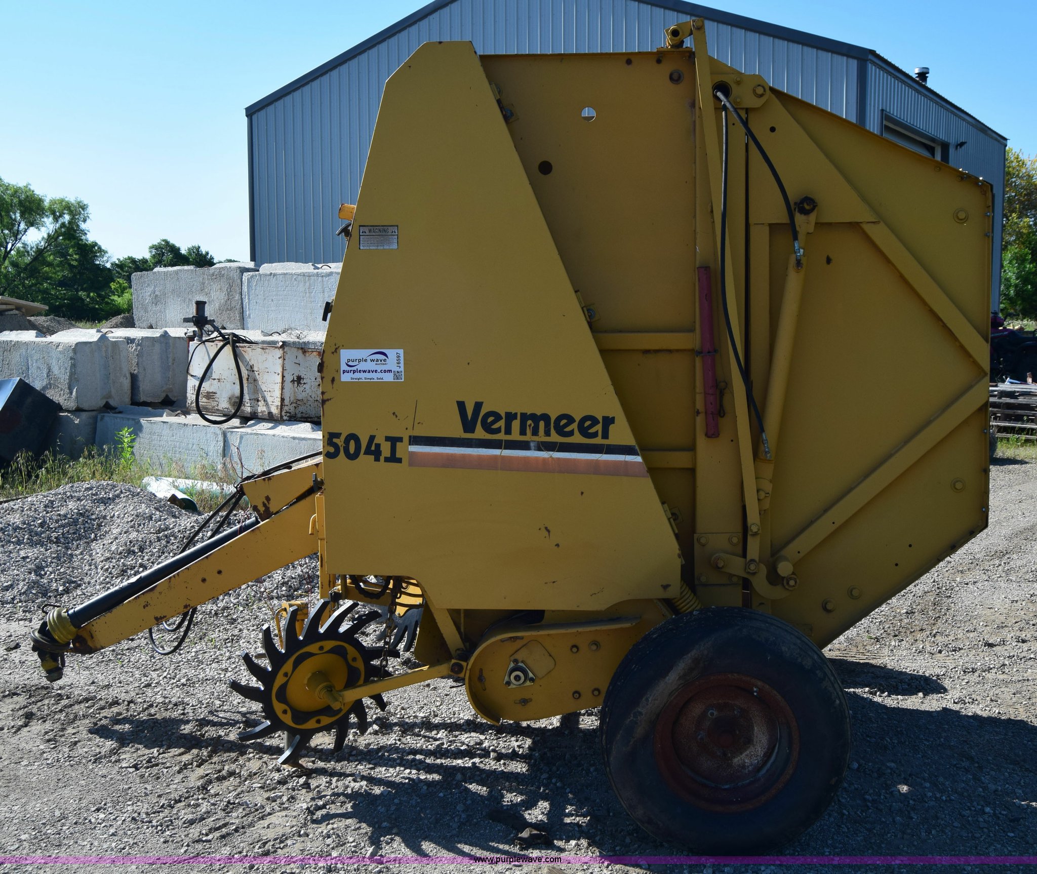 Purple Wave is selling a used Round Baler in Kansas. This item is a 1989 Vermeer 504I round baler with the following: 4'x5' bale capacity, Twine tie, 4'W pickup, 540 PTO, Pin hitch, 11L-15SL tires, Non-operational, one roller broken, Serial 1VRA111SXK1001256