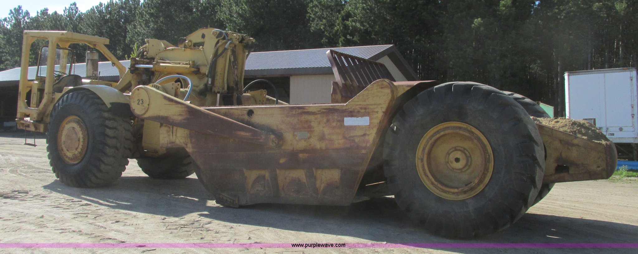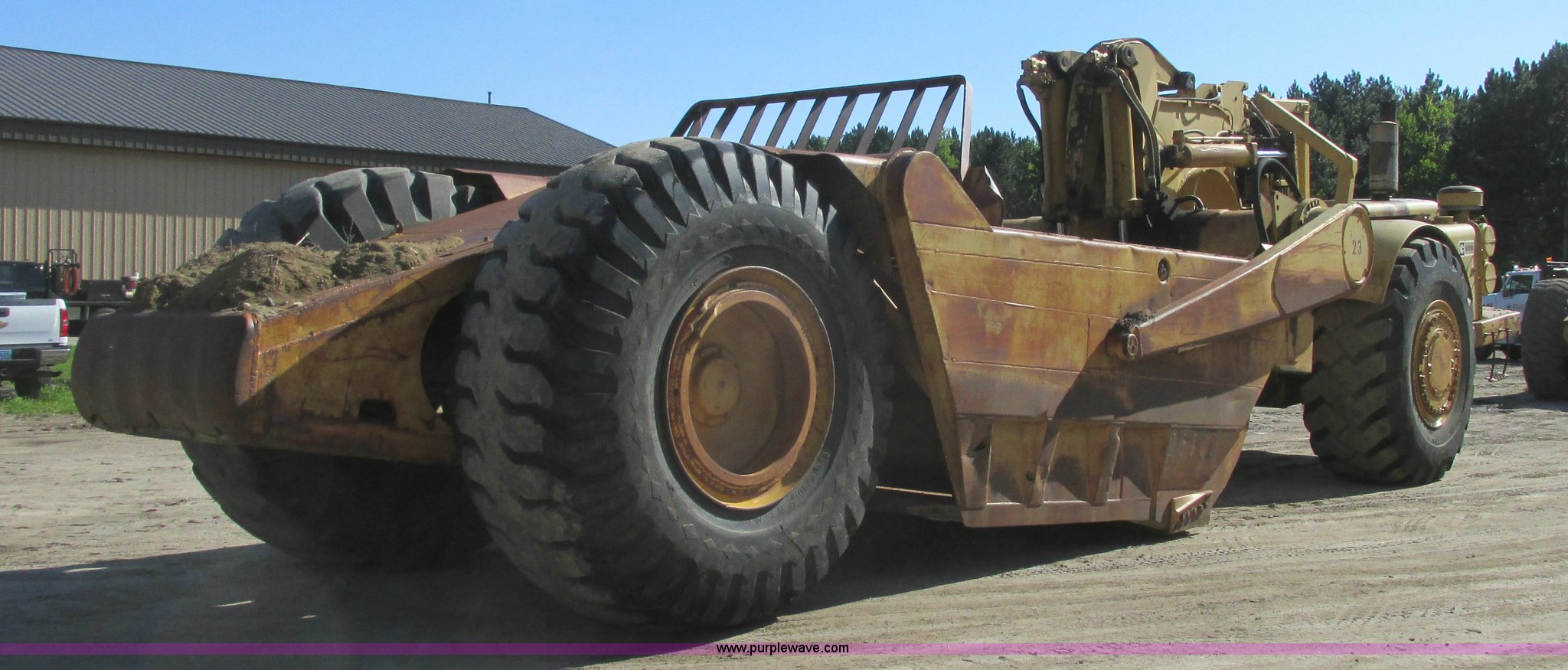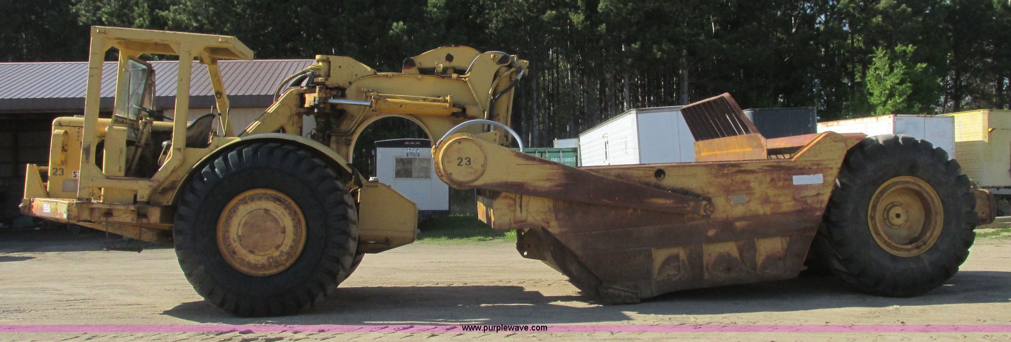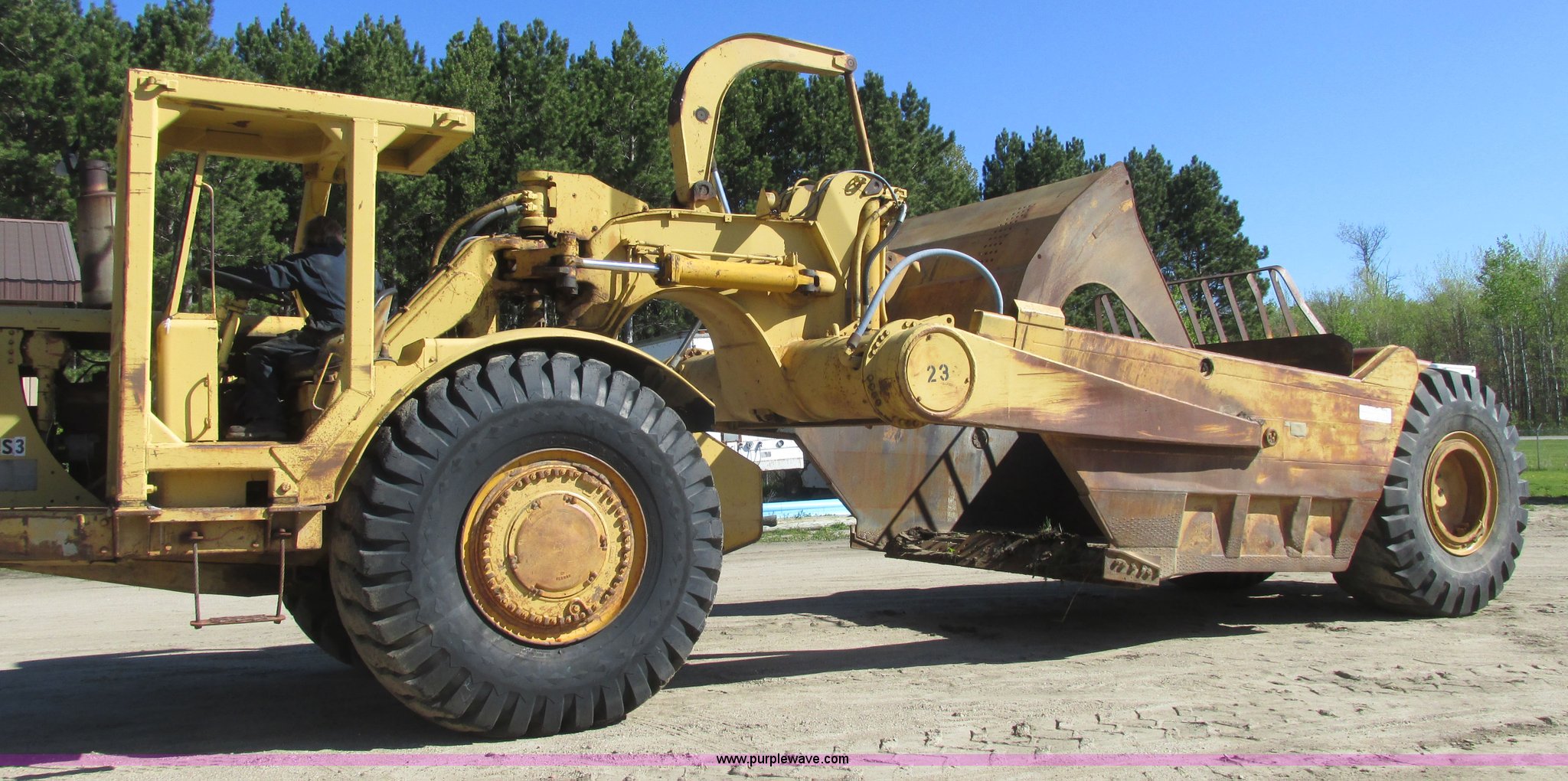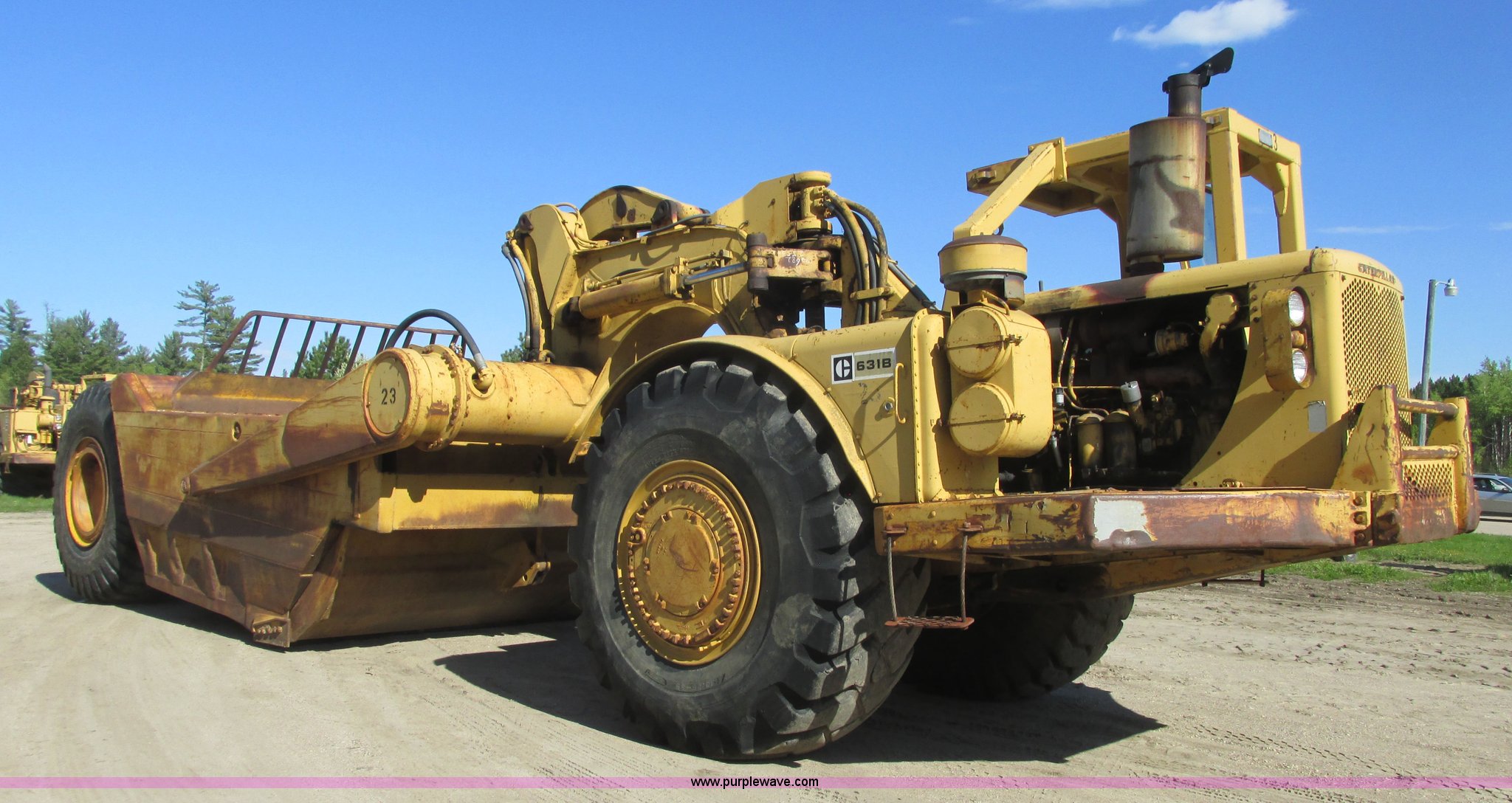 Purple Wave is selling a used Conventional Scraper in Minnesota. This item is a 1964 Caterpillar 631B conventional scraper with the following: Caterpillar six cylinder turbo diesel engine, Powershift transmission, 5F-1R gears, EROPS, Front work lights, 31 cu. yd. bowl capacity, Rear push block, Hydraulic lift, Lever scraper controls, Air brakes, Firestone 33.25-35-E3 front tires, Goodyear 33.25-35 rear tires, 76,300 lbs. base operating weight, Serial 13G1521, Unit# 23