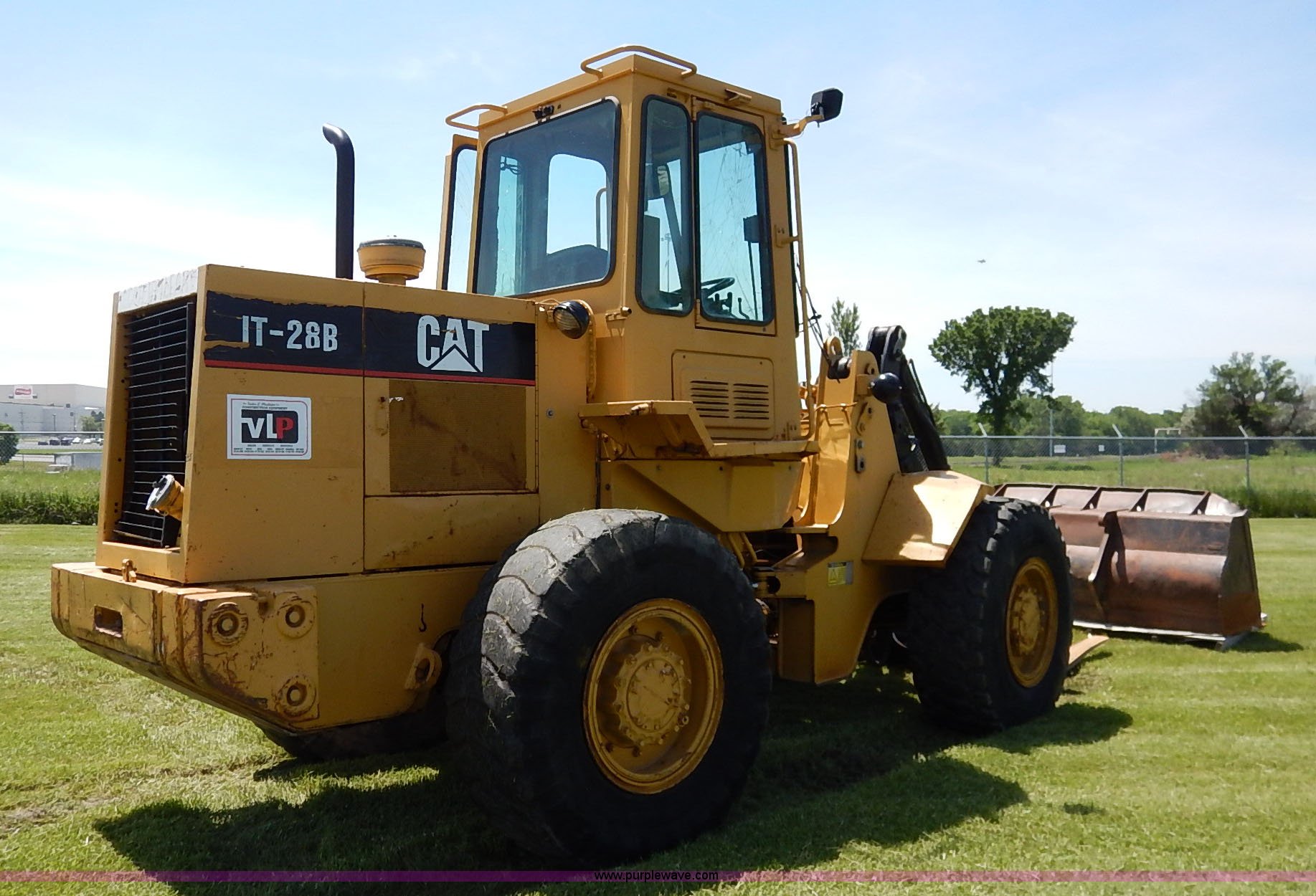 Purple Wave is selling a used Wheel Loader in Kansas. This item is a 1993 Caterpillar IT-28B wheel loader with the following: 19,502 hours on meter, Caterpillar four cylinder diesel engine, Hand steering controls, Enclosed cab, Heat, Tilt steering wheel, Wipers, Wipers need replaced, 64"W bucket, Model 20100047, Bolt-on cutting edge, Two lever bucket controls, Front and rear work lights, 48"L x 5"W x 2" thick forks, 17.5R25 tires, 22,456 lbs. base operating weight, Glass cracked, Seat damaged, Light bulbs need replaced, Serial 1HF02669, Unit# P08130