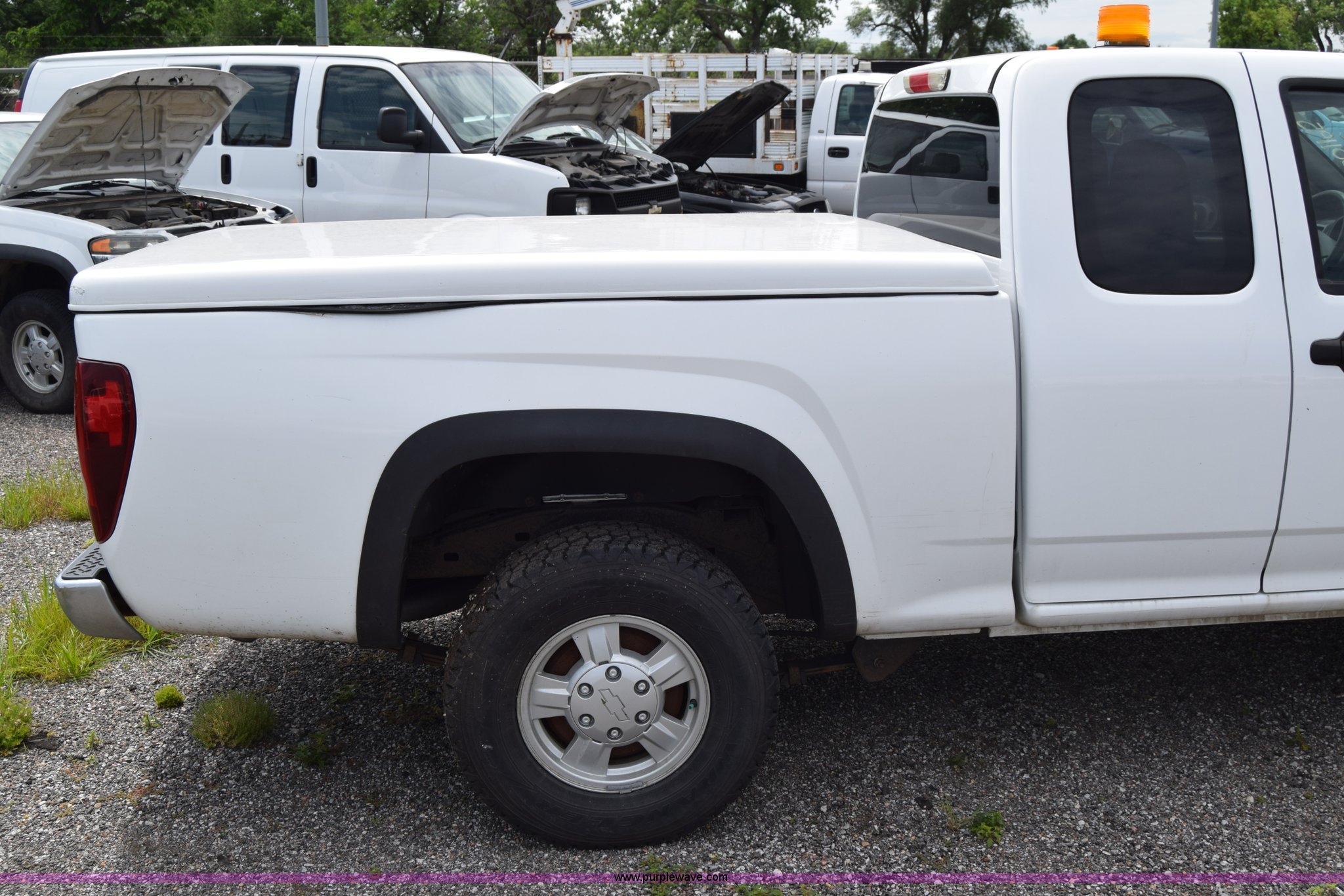 Purple Wave is selling a used Compact Pickup or Van in Kansas. This item is a 2006 Chevrolet Colorado Ext. Cab pickup truck with the following: 94,991 miles on odometer, 3.5L L5 DOHC 20V gas engine, Automatic transmission, Four wheel drive, AC and heat, Tilt, Cruise, AM/FM/CD, Power windows, locks, and mirrors, Cloth interior, Beacon light, Hard top bed cover, LT235/75R15 tires, Scratches and dents, Interior damaged, Unit# 001195
