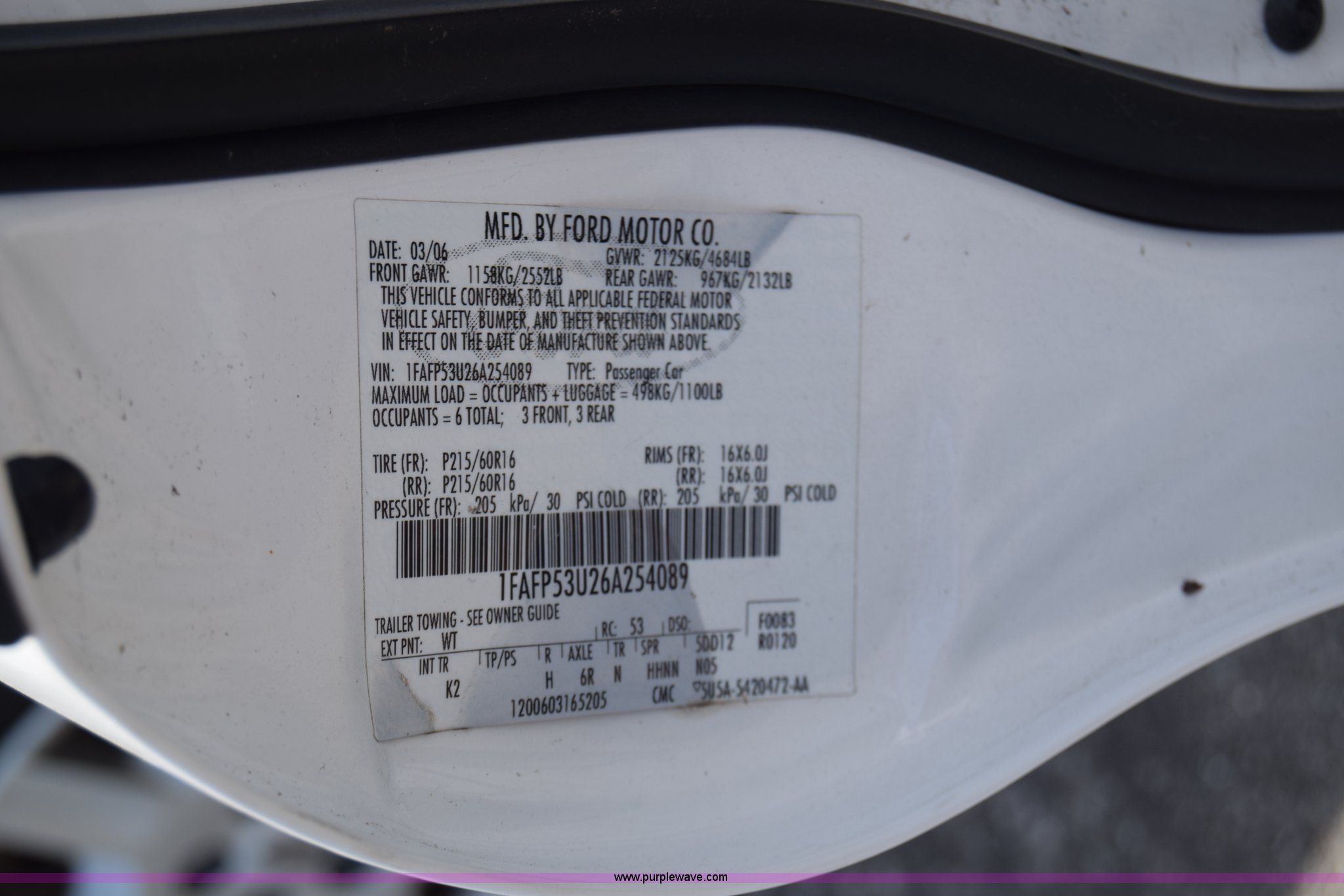 Purple Wave is selling a used Passenger Vehicle in Kansas. This item is a 2006 Ford Taurus SE with the following: 110,572 miles on odometer, 3.0L V6 OHV 12V gas engine, Automatic transmission, AC and heat, Tilt, Cruise, AM/FM/cassette, Power windows, locks, and mirrors, Cloth interior, 215/60R16 tires, Scratches, Dents, Unit# 001169