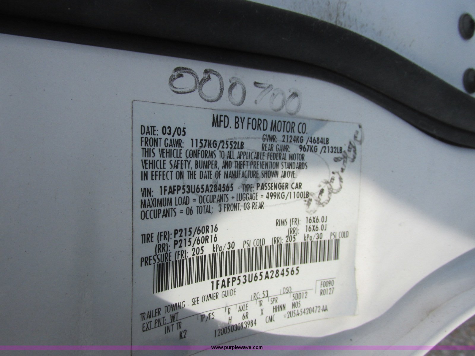 Purple Wave is selling a used Passenger Vehicle in Kansas. This item is a 2005 Ford Taurus SE with the following: 106,168 miles on odometer, 3.0L V6 OHV 12V gas engine, Automatic transmission, AC and heat, Tilt, Cruise, AM/FM/cassette, Power windows, locks, and mirrors, Cloth interior, 215/60R16 tires, Interior/exterior cosmetic damage, Hail damage, Port hole in trunk, Unit# 000700