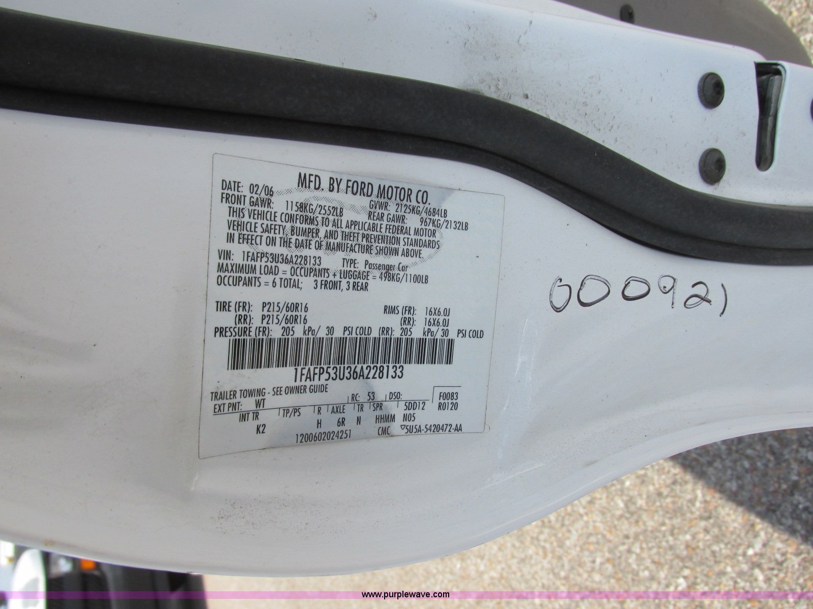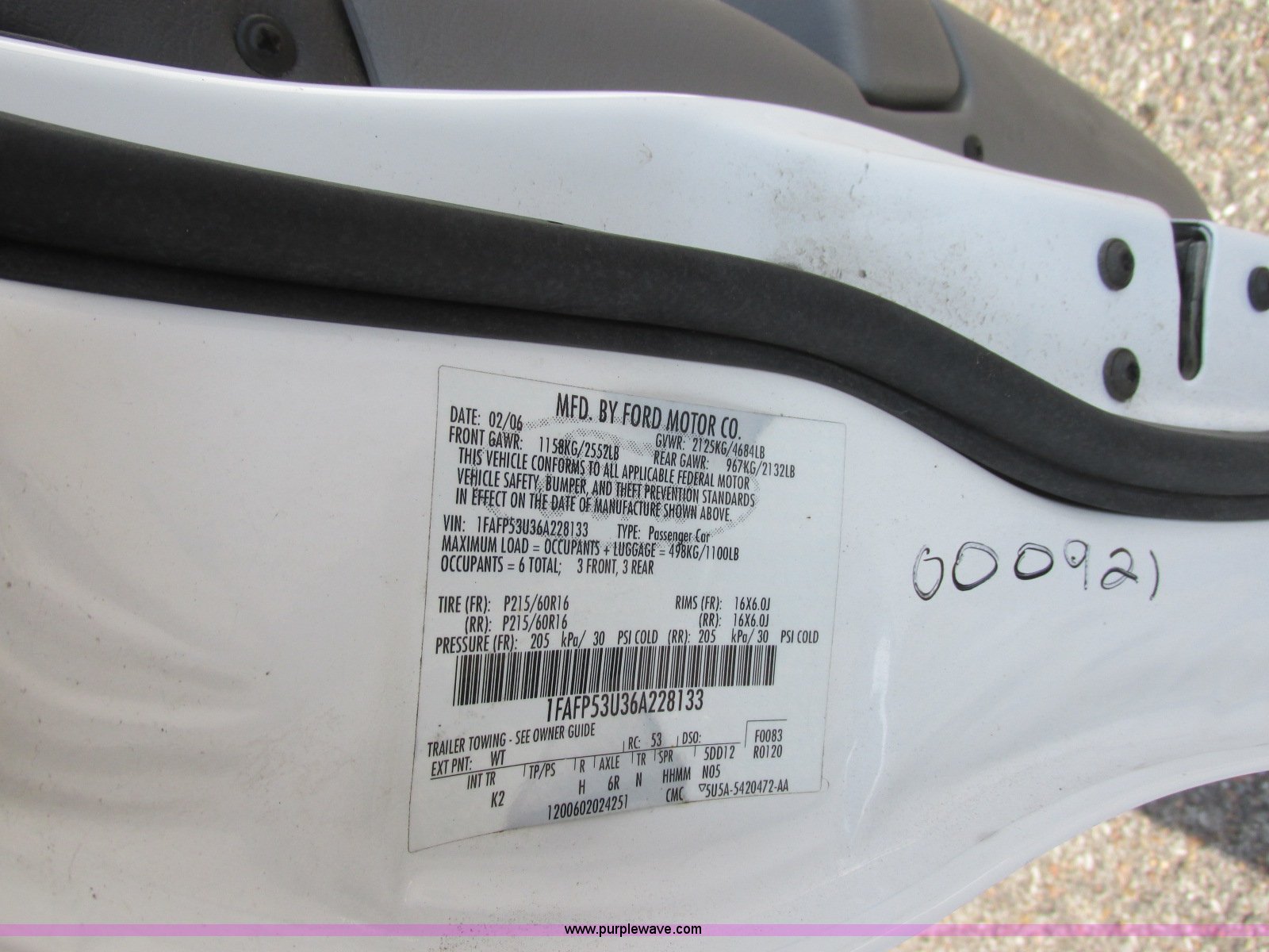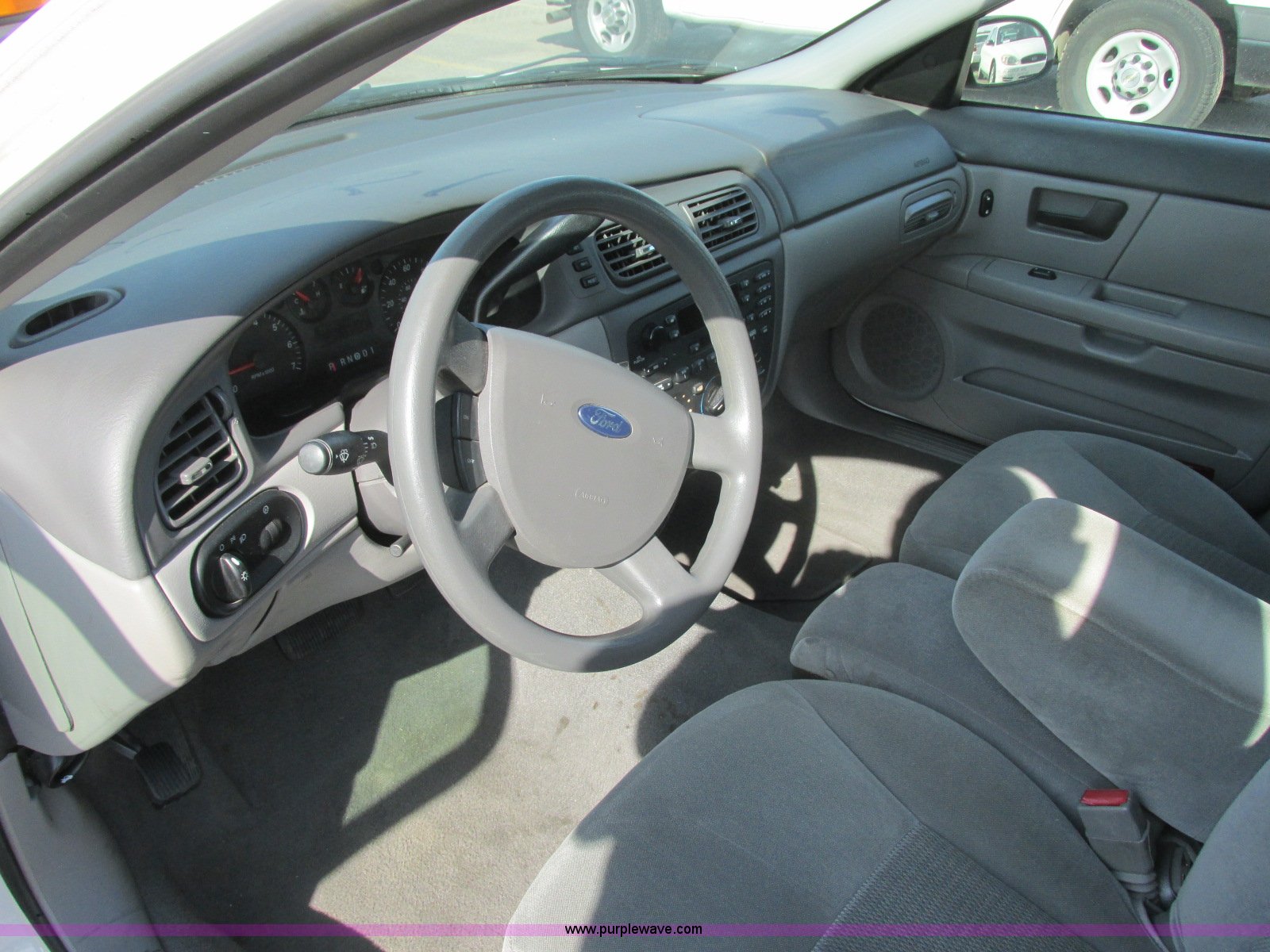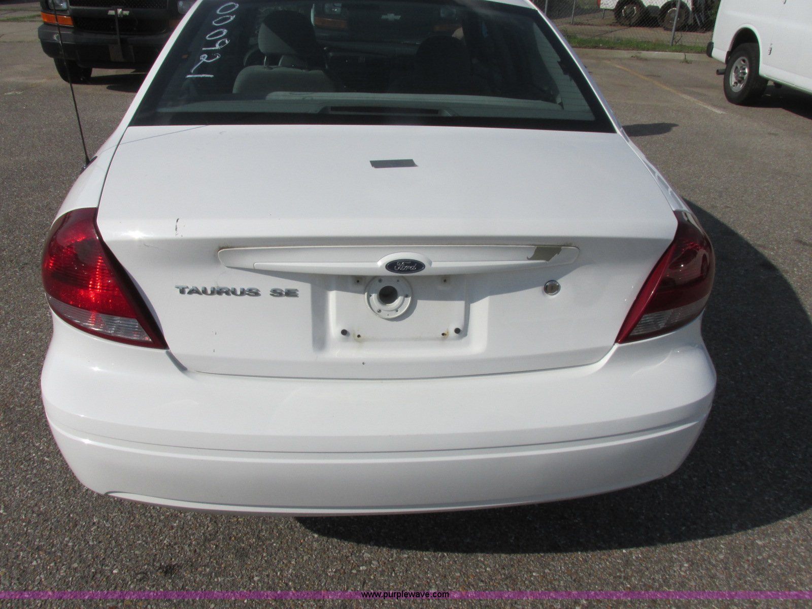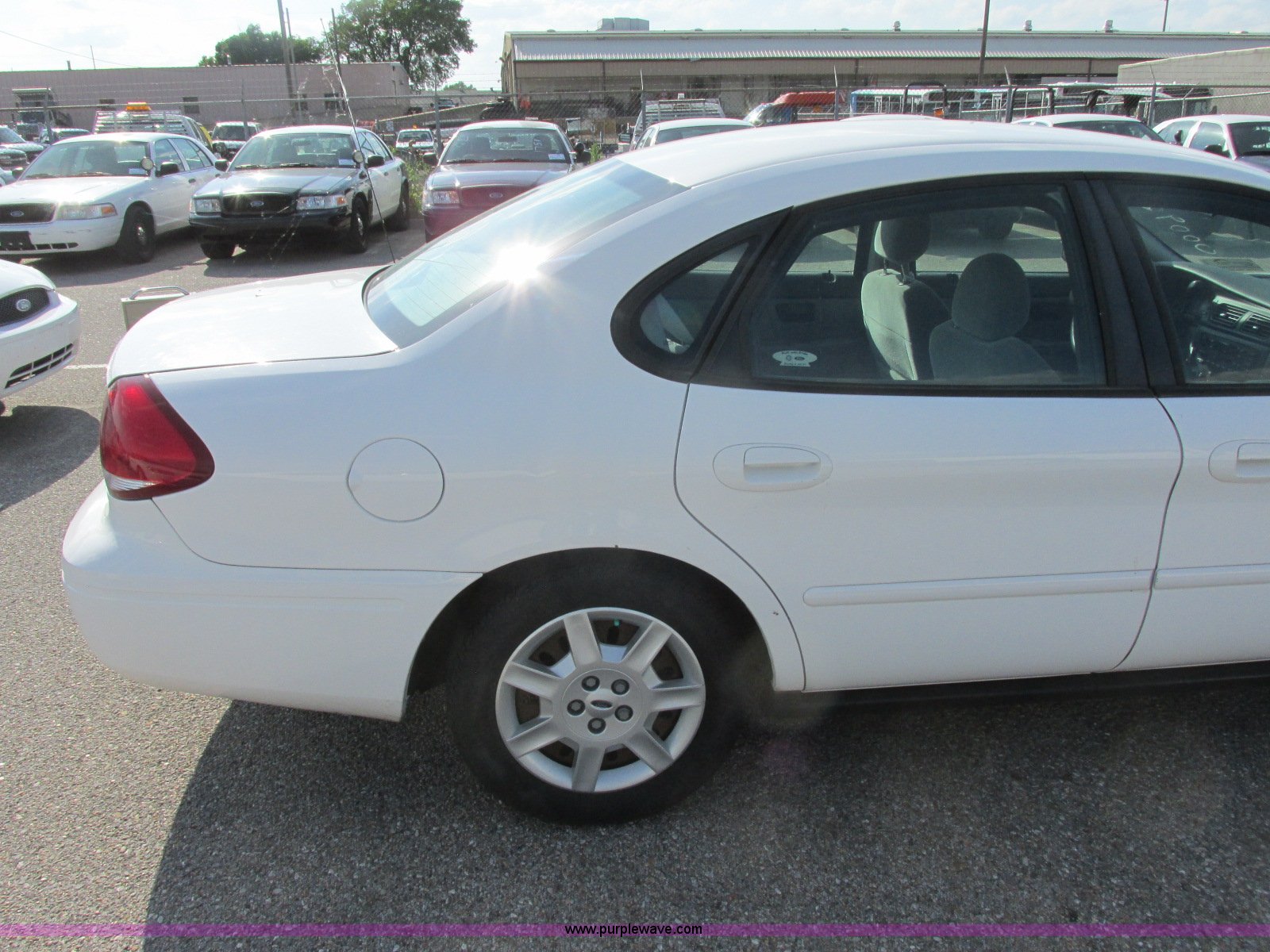 Purple Wave is selling a used Passenger Vehicle in Kansas. This item is a 2006 Ford Taurus SE with the following: 79,168 miles on odometer, 3.0L V6 OHV 12V gas engine, Automatic transmission, AC and heat, Tilt, Cruise, AM/FM/cassette, Power windows, locks, and mirrors, Cloth interior, 215/60R16 tires, Port hole in trunk, Paint chipped, Hail damage, Scratches, Dents, Unit# 000921
