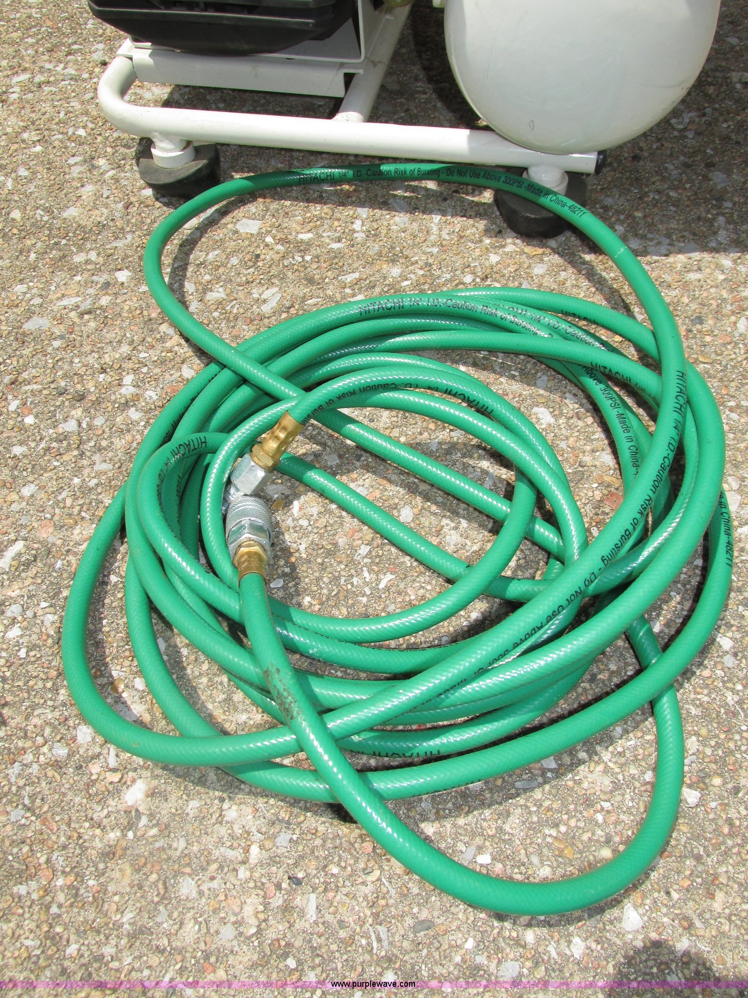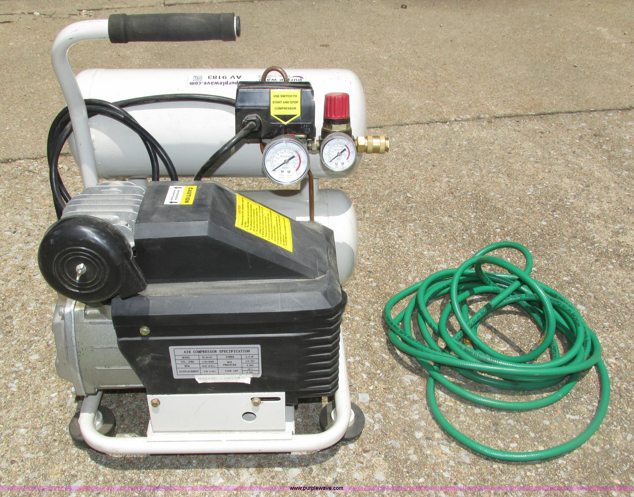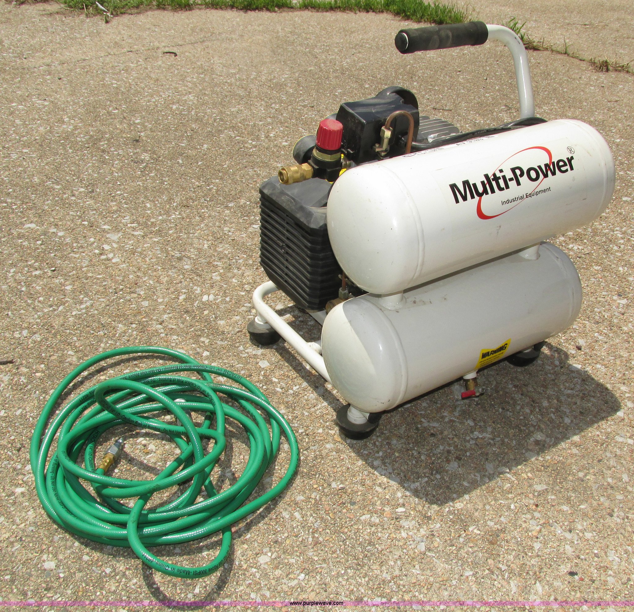 Purple Wave is selling a used Air Compressor in Nebraska. This item is a Multi-power air compressor with the following: Model TD.2516T, Series 120823001, Four gallon capacity twin tank, 110V, 2.5 HP, Tank and line pressure gauge, Hitachi 1/4" hose, Approx. 20'L, Three piece two gun HVLP paint kit, Stainless steel needle and nozzles, Aluminum paint cups
