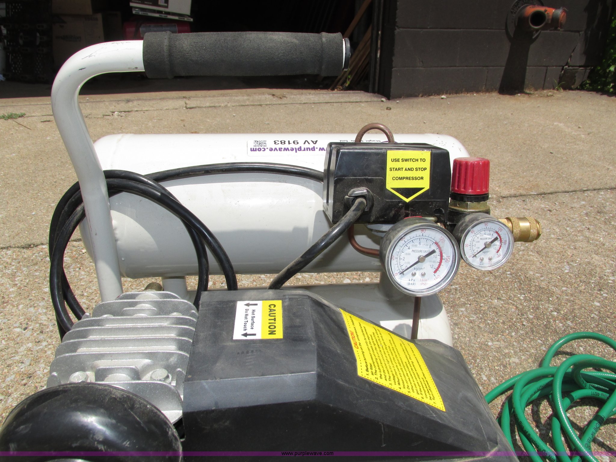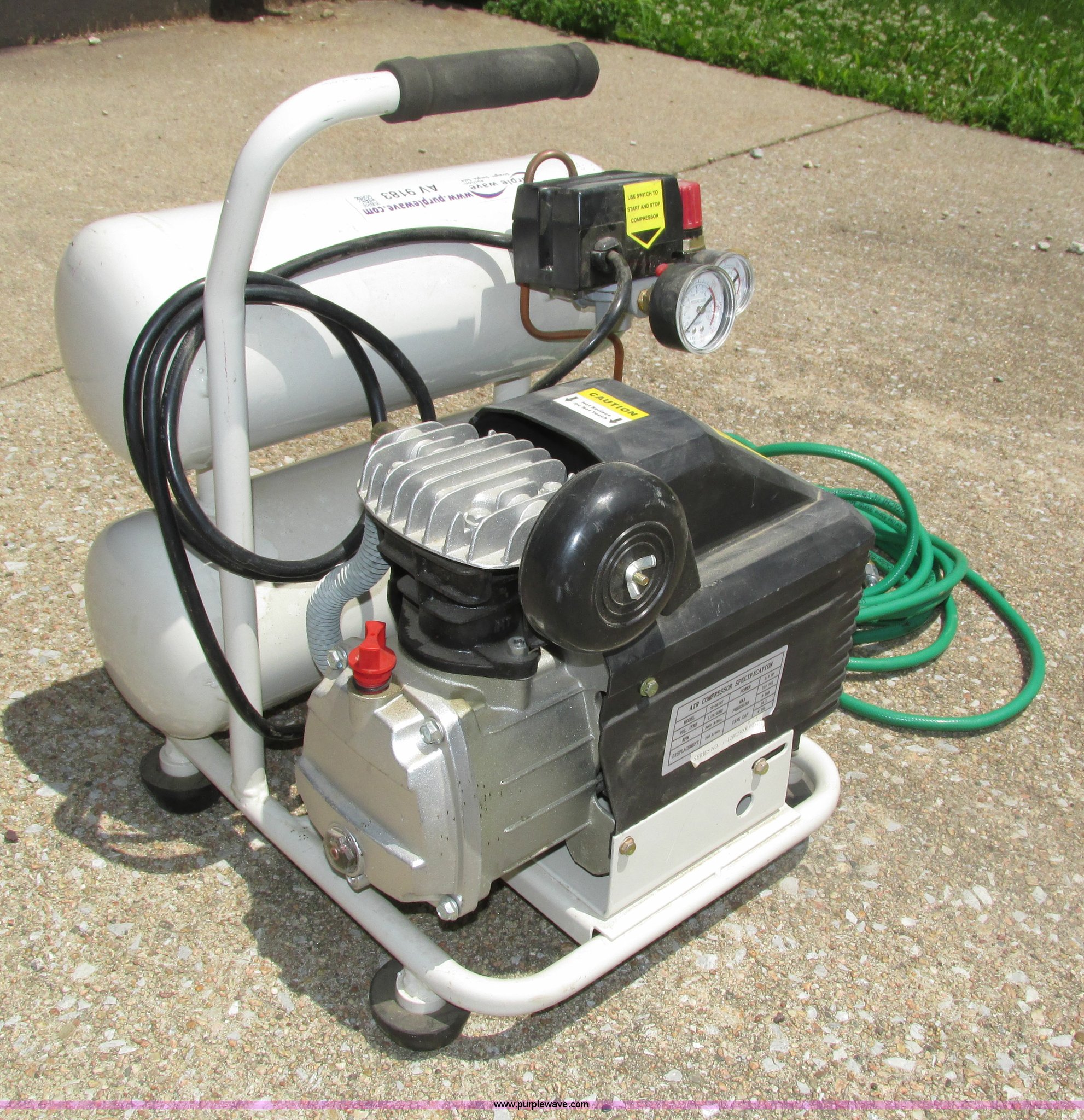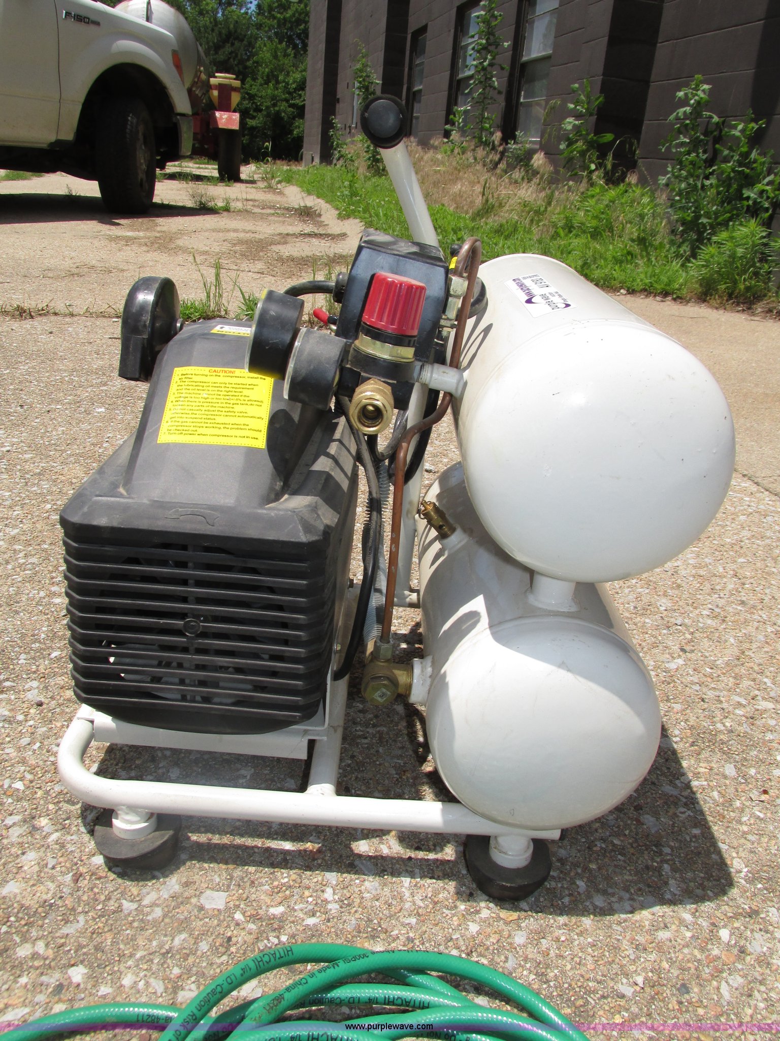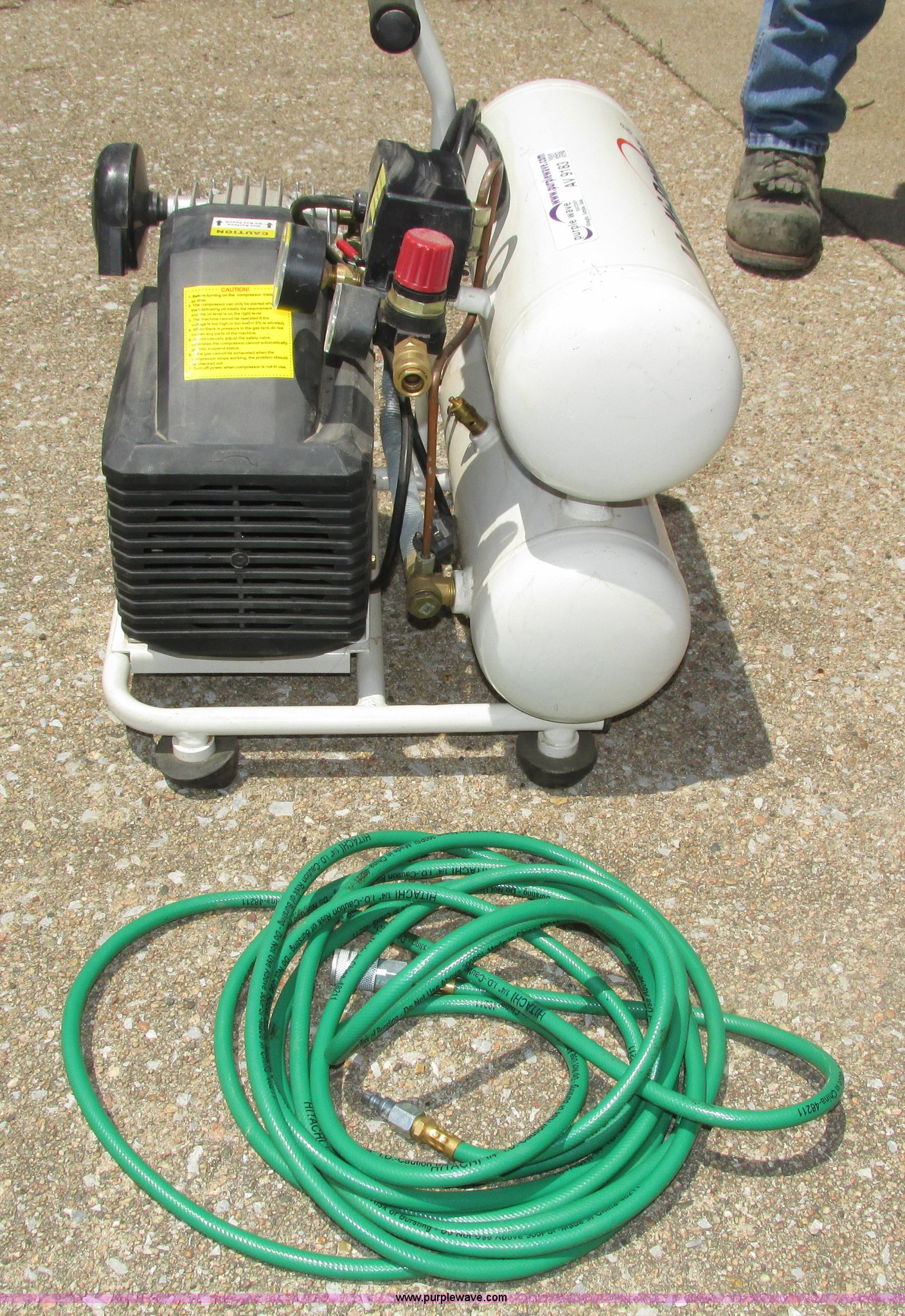 Purple Wave is selling a used Air Compressor in Nebraska. This item is a Multi-power air compressor with the following: Model TD.2516T, Series 120823001, Four gallon capacity twin tank, 110V, 2.5 HP, Tank and line pressure gauge, Hitachi 1/4" hose, Approx. 20'L, Three piece two gun HVLP paint kit, Stainless steel needle and nozzles, Aluminum paint cups