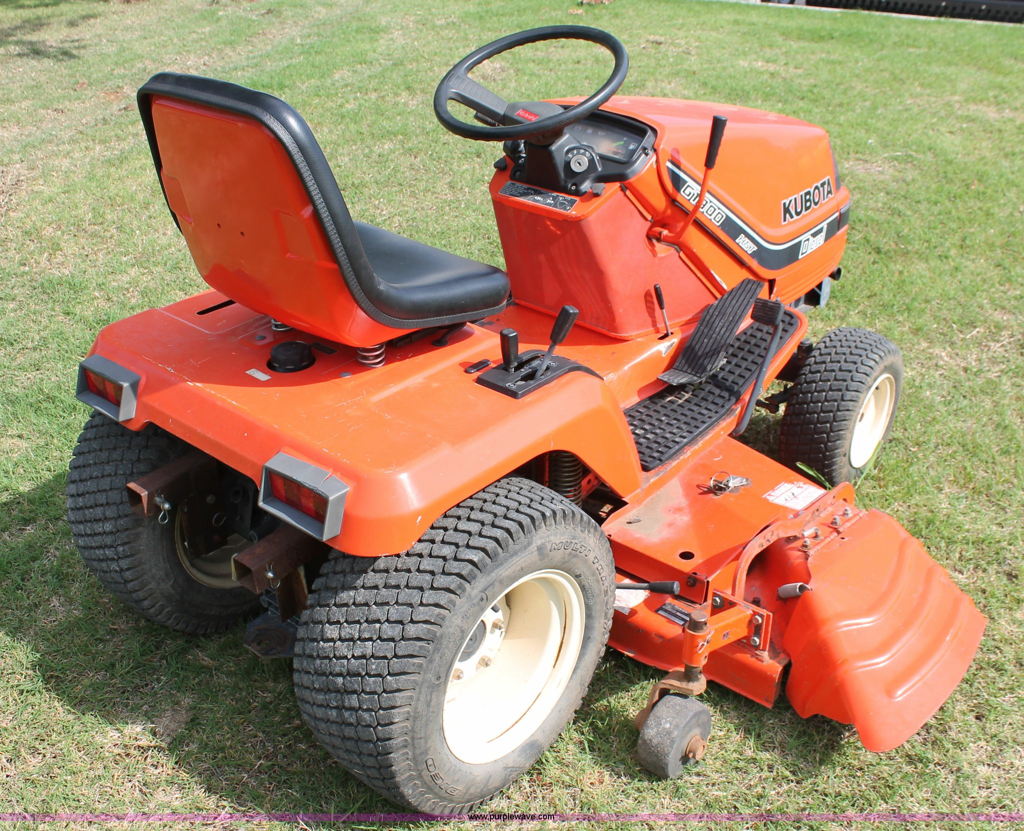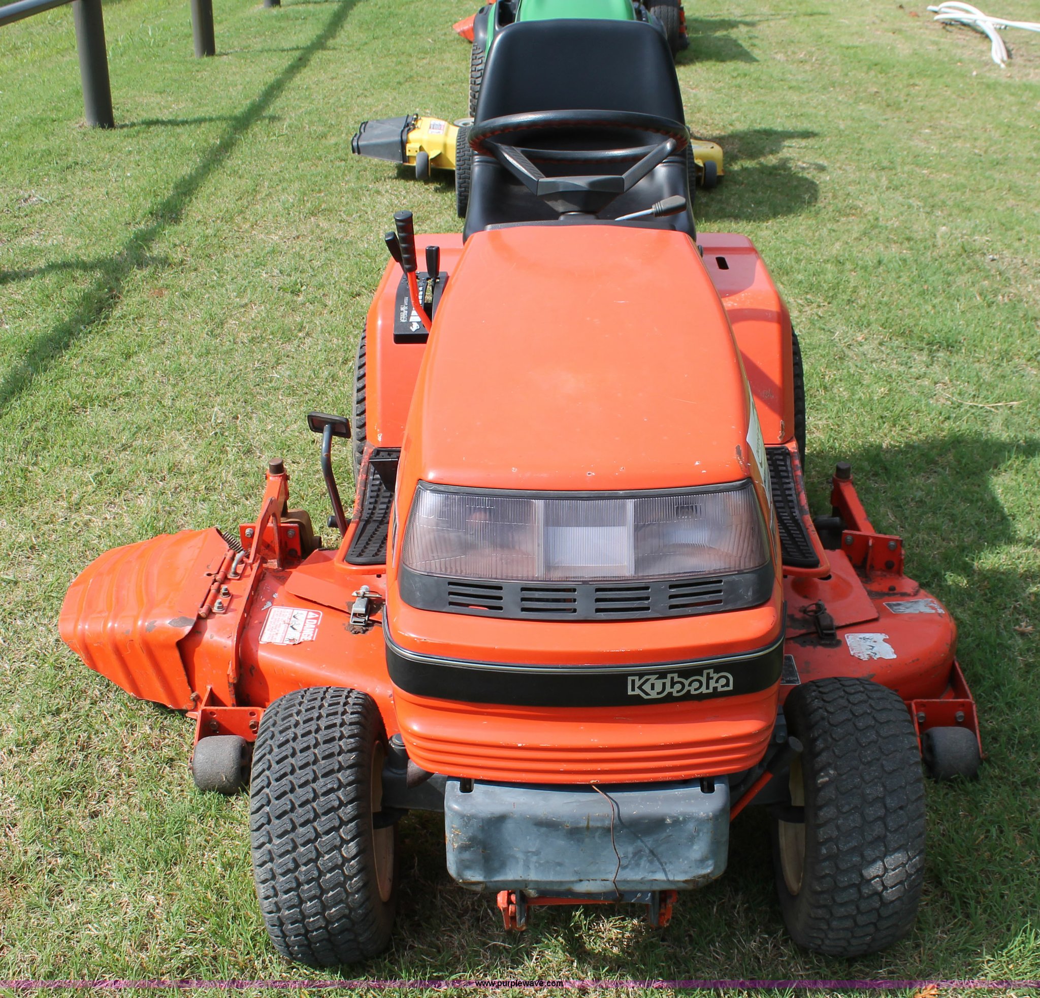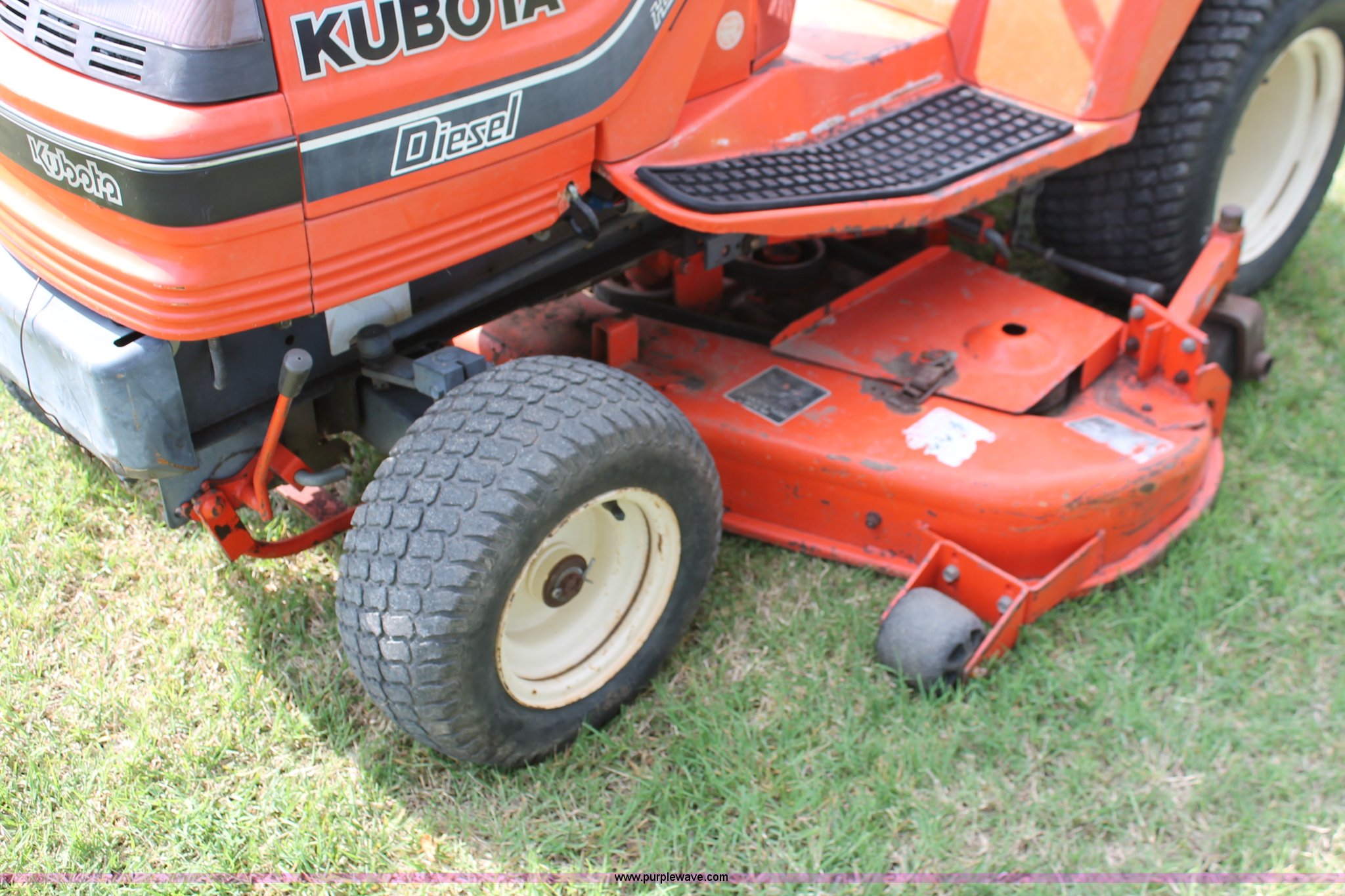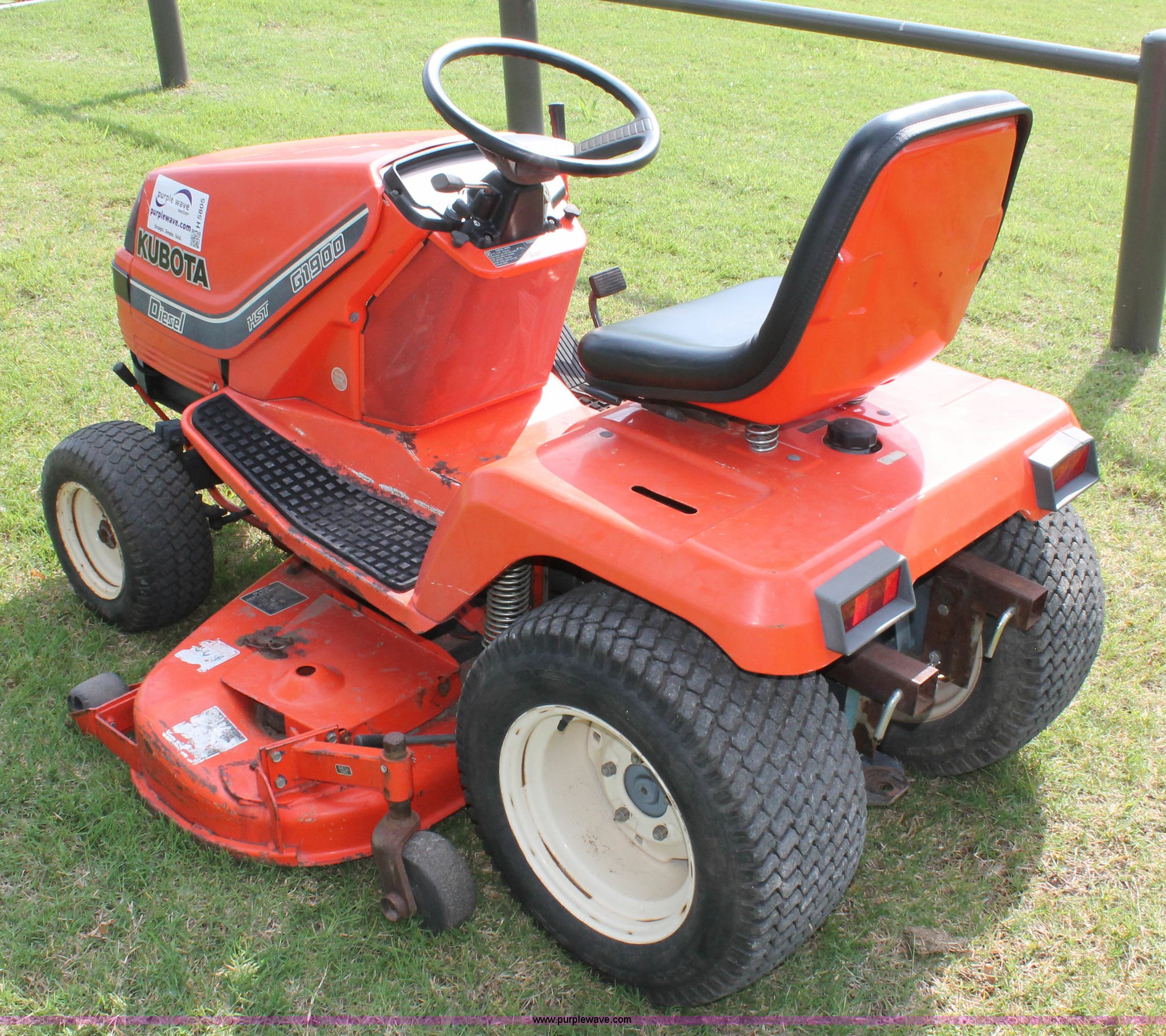 Purple Wave is selling a used Lawn Mower in Oklahoma. This item is a Kubota G1900 lawn mower with the following: 1,074 hours on meter, 54" cut, Kubota D722-E 719cc three cylinder diesel engine, Serial 775455, Hydrostatic transmission, Kubota RC54-G20 deck, Serial 37154, Pin hitch, 16x6.50-8 NHS front tires, 13x10.50-12 rear tires, Serial 20010