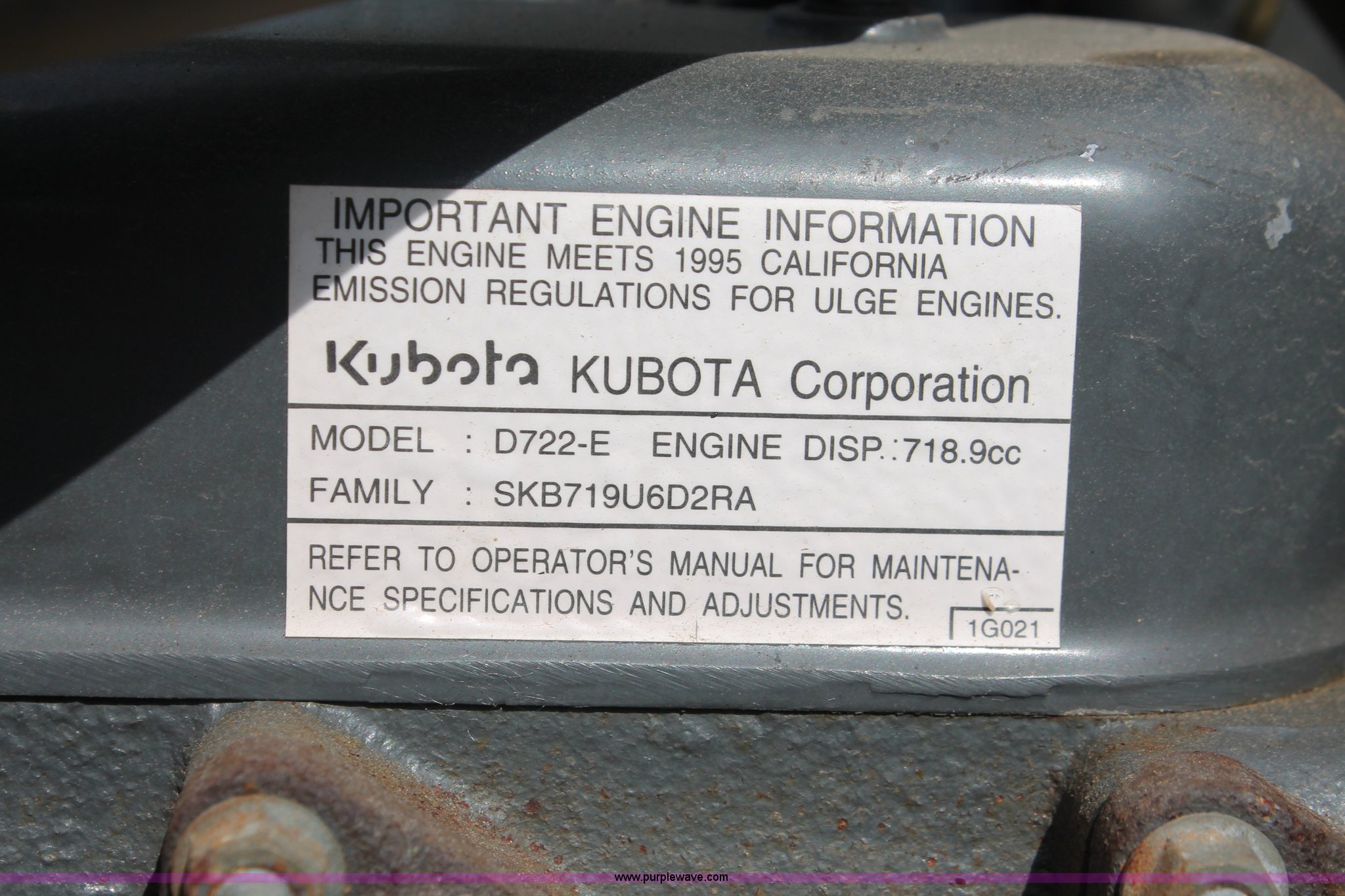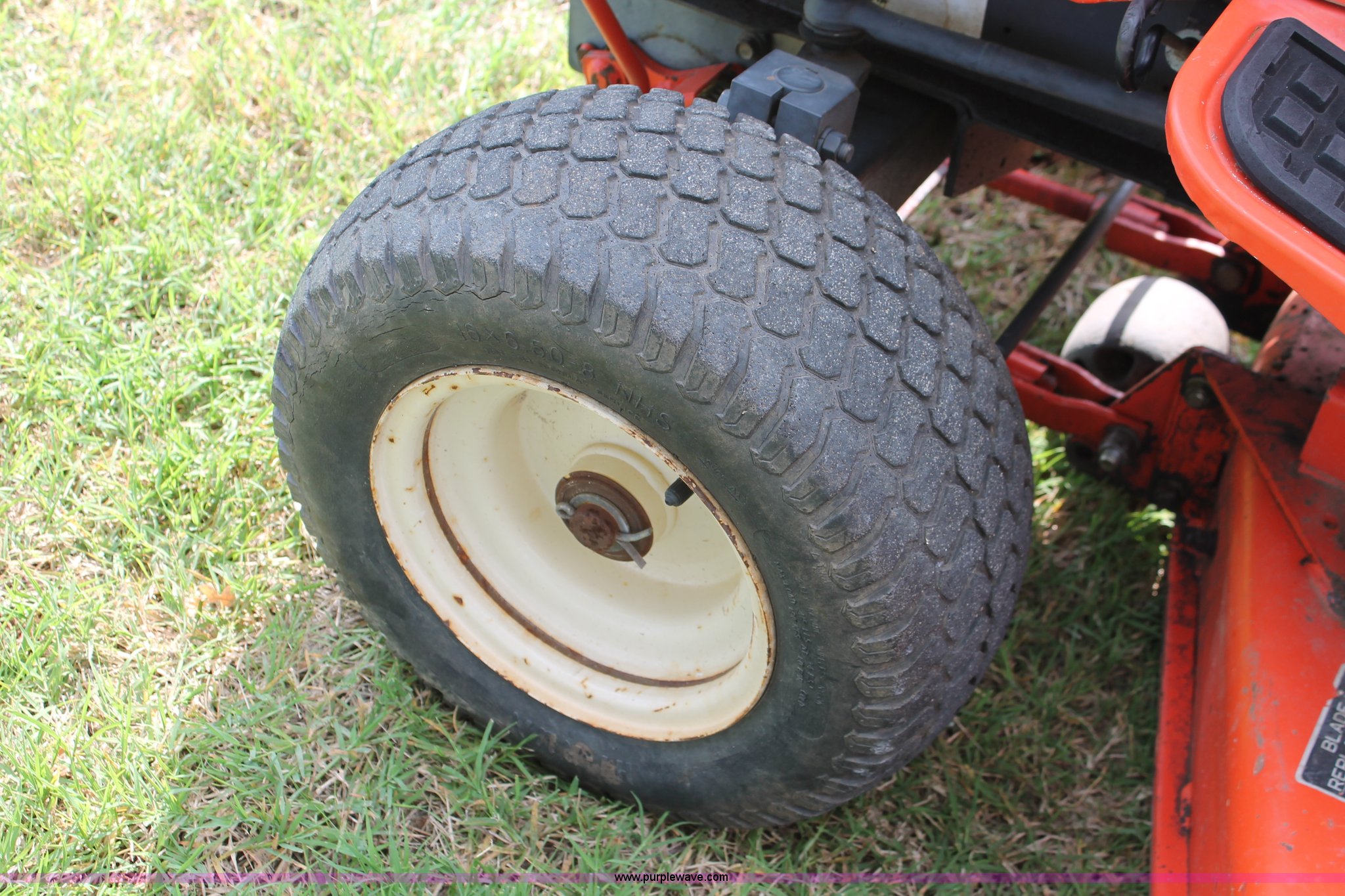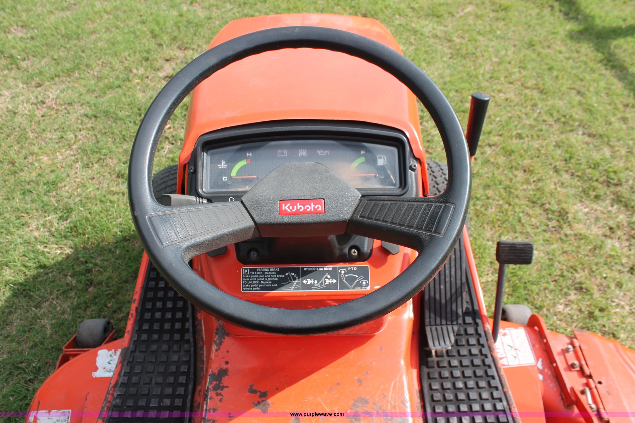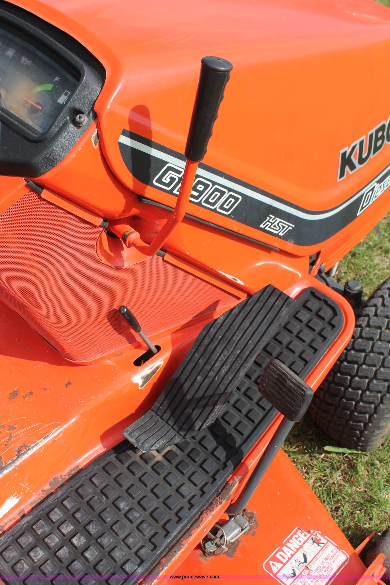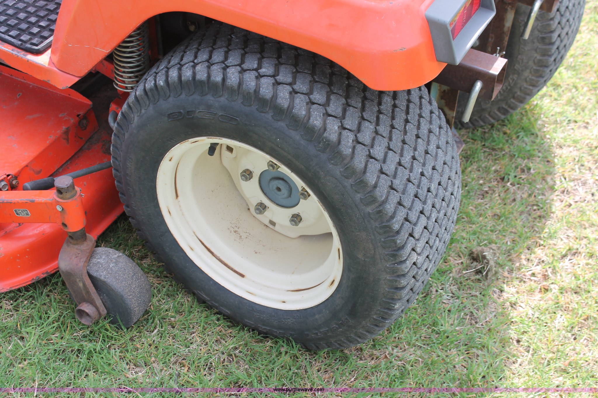 Purple Wave is selling a used Lawn Mower in Oklahoma. This item is a Kubota G1900 lawn mower with the following: 1,074 hours on meter, 54" cut, Kubota D722-E 719cc three cylinder diesel engine, Serial 775455, Hydrostatic transmission, Kubota RC54-G20 deck, Serial 37154, Pin hitch, 16x6.50-8 NHS front tires, 13x10.50-12 rear tires, Serial 20010