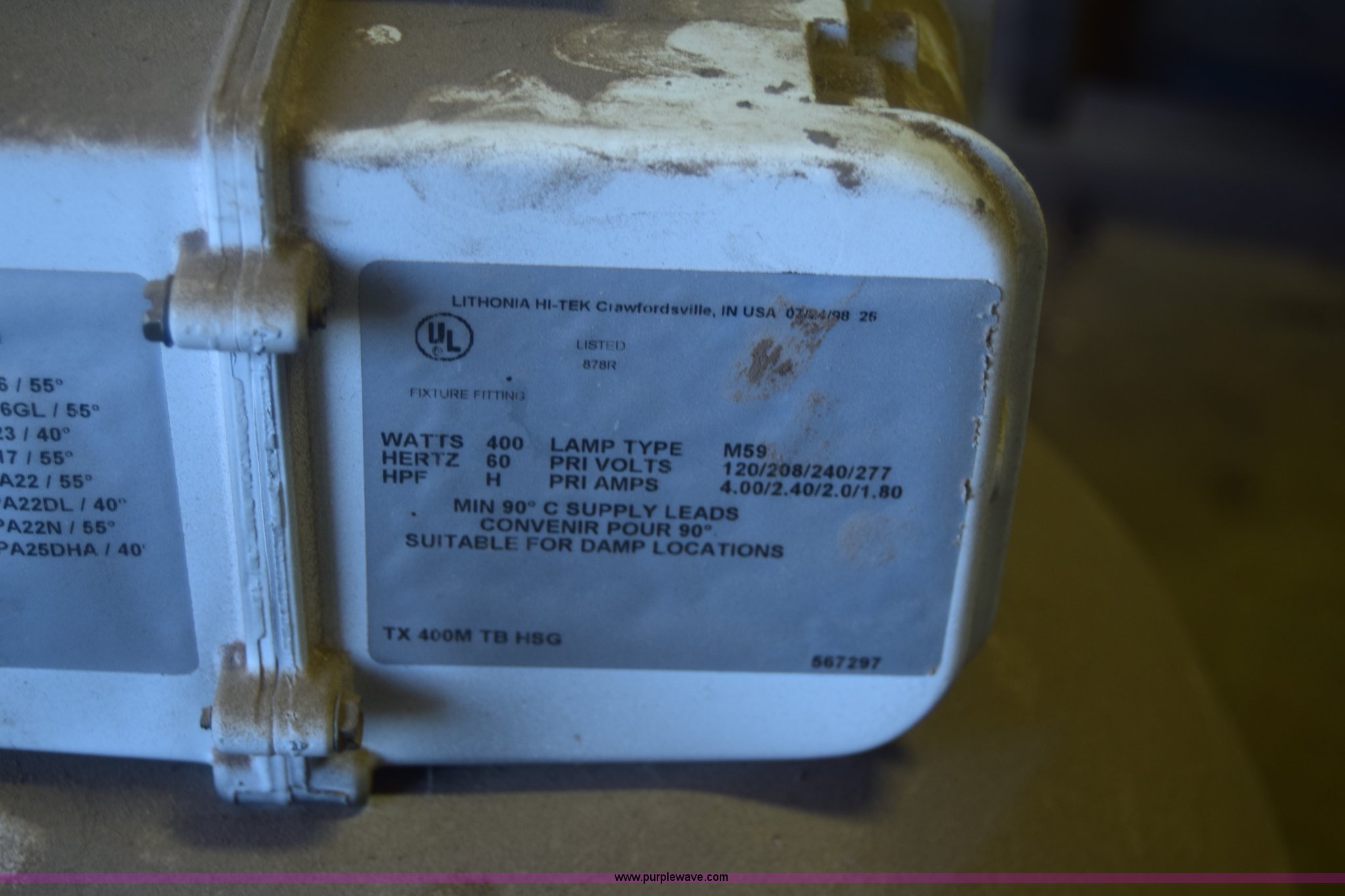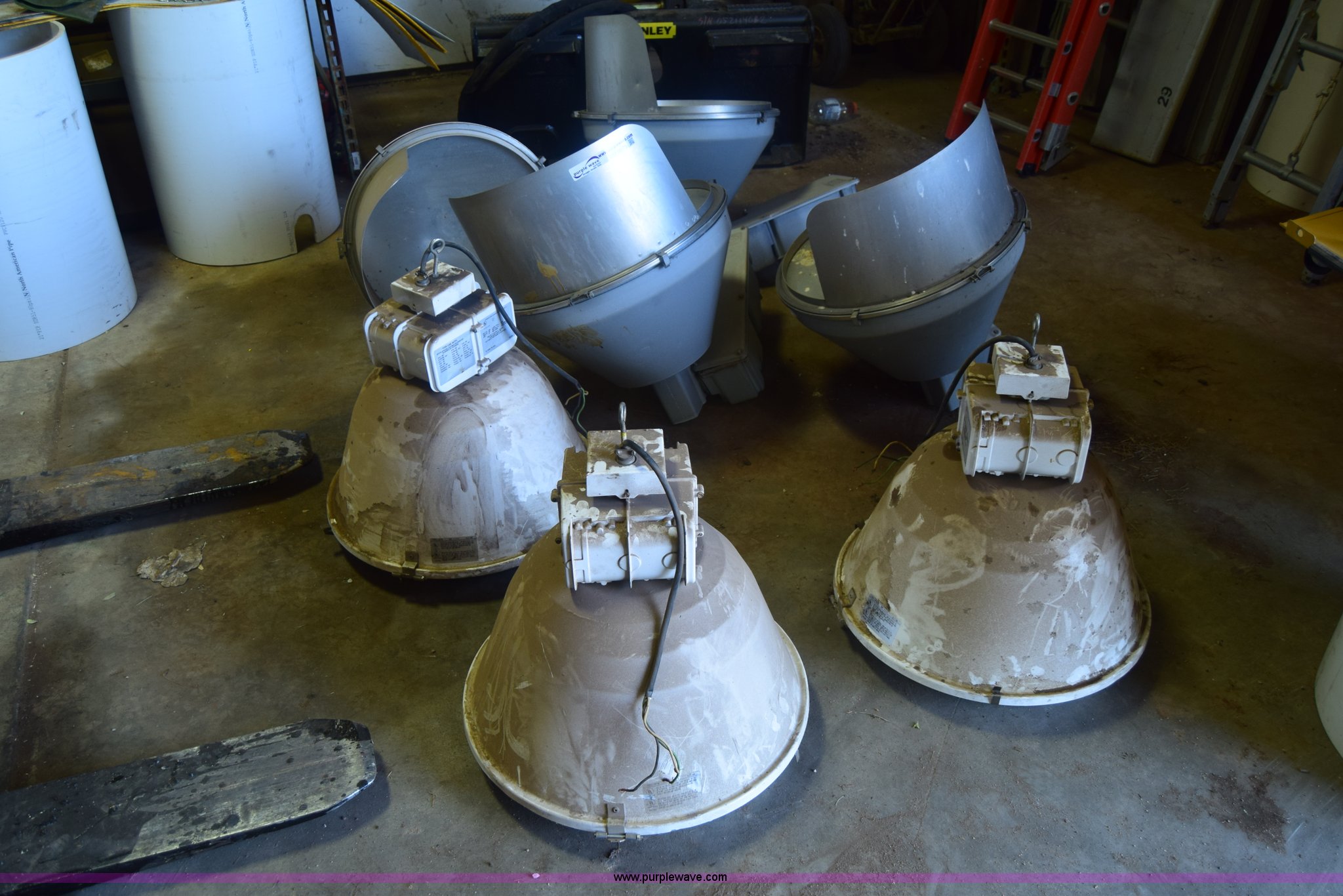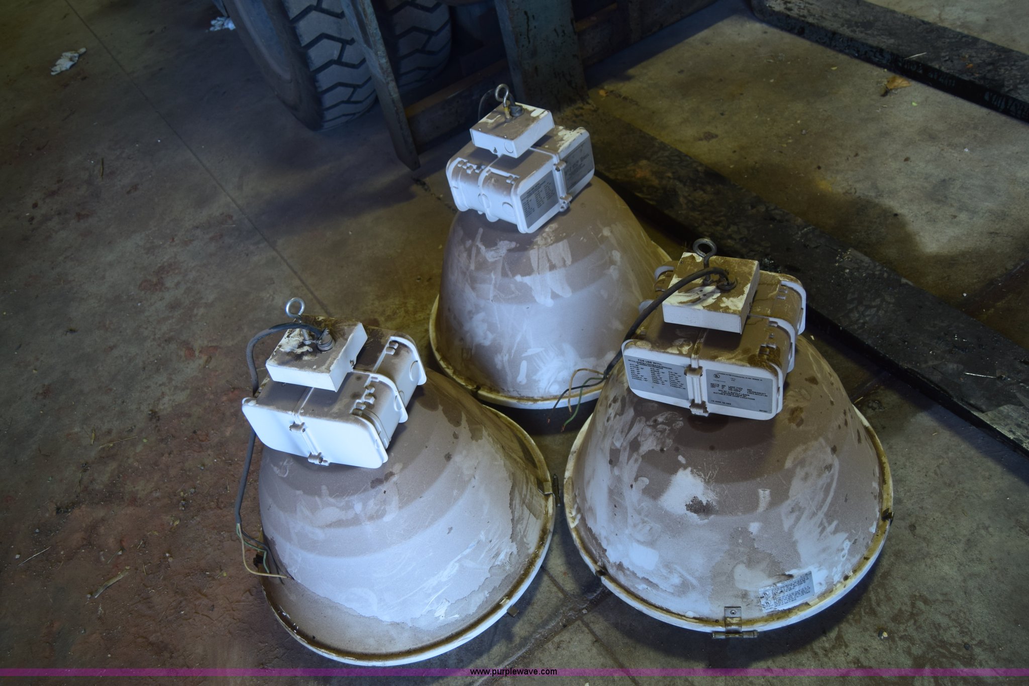 Purple Wave is selling a used Building Materials in Kansas. This item is a Assorted lights with the following: (3) Lithonia HiTek shop lights, 400 watts, (4) Hubbell lights, 600 watts, (3) additional bulbs included