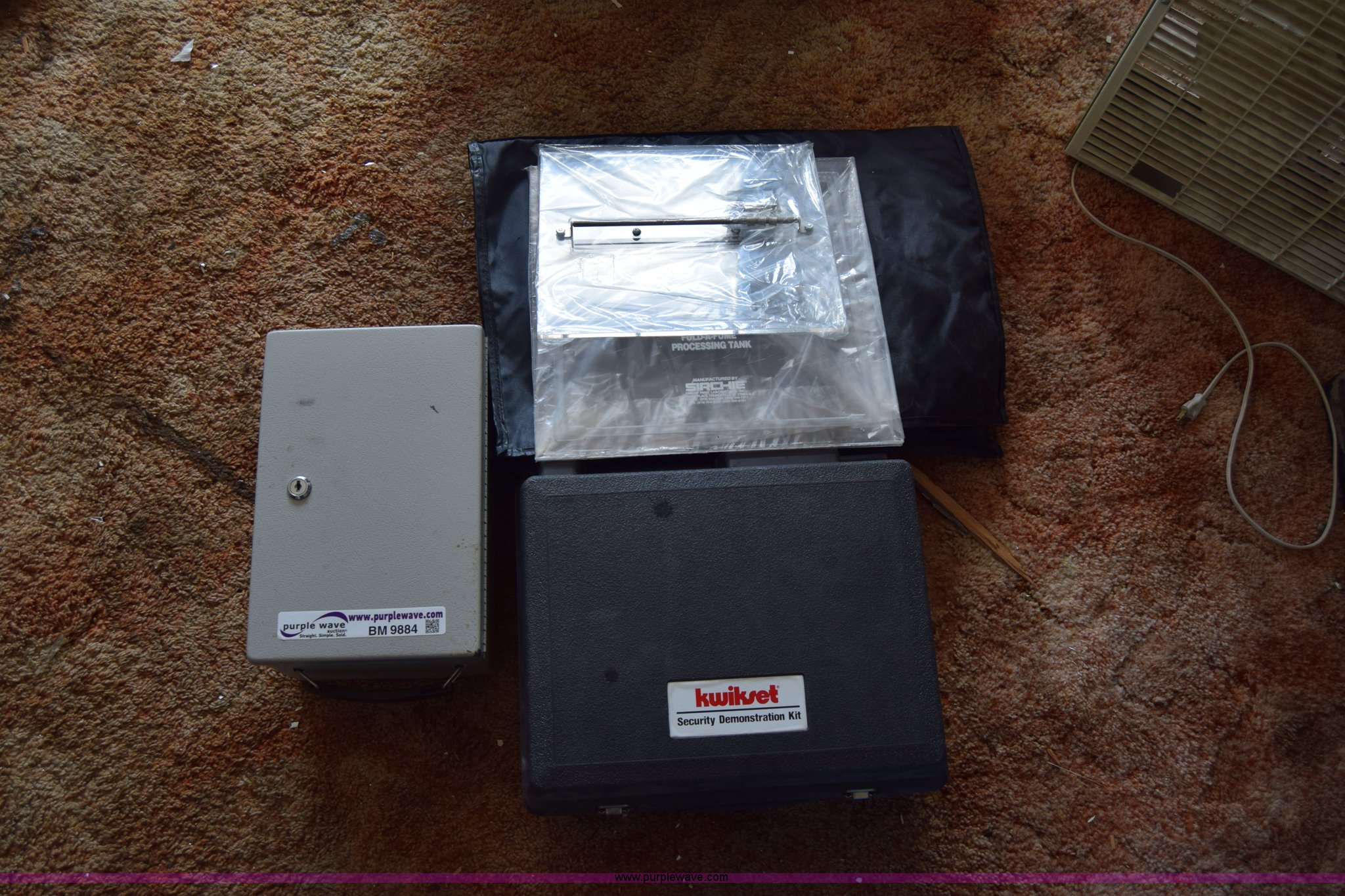 Purple Wave is selling a used Tools in Kansas. This item is a Assorted items with the following: Kwikset security demonstration kit, Lock box, Finger print processing kit