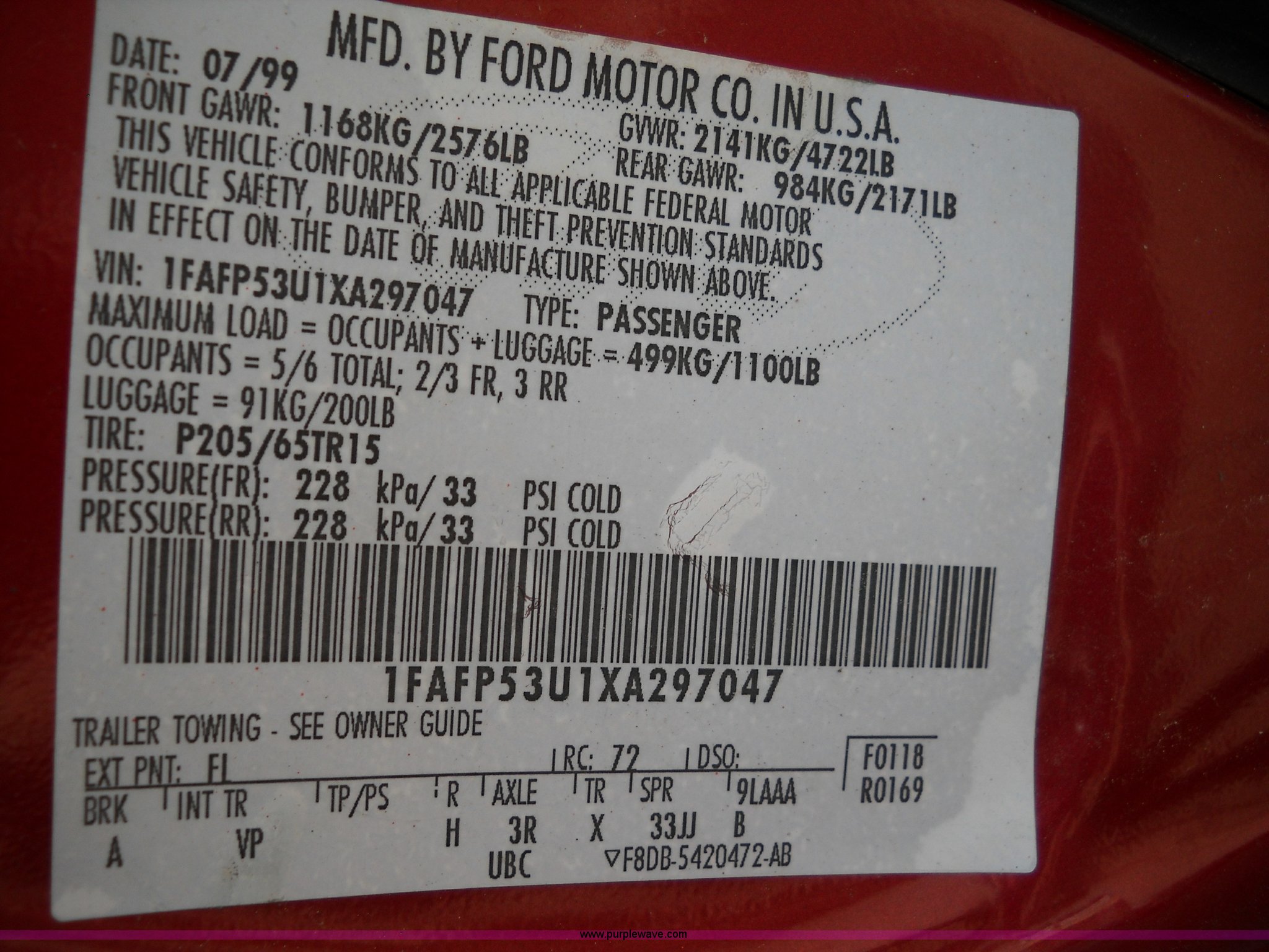 1999 Ford Taurus SE. 81,716 actual miles, 3.0L V6 OHV 12V gas engine, Automatic transmission, AC and heat, Tilt, Cruise, AM/FM/cassette, Power windows, locks, mirrors, and seats, P205/65TR15 tires, Interior/exterior cosmetic damage, Dents, Paint chipped/faded, Tires weather cracked, Dash pulled up in front, Seat ripped Has been patched, Carpet stained, Unit# 350. Seller is a government entity who will be assigning and distributing the title. Please contact the seller for distribution questions. 1FAFP53U1XA297047. View equipment video. USD 501 Service Center. 125 SE 27th St. Topeka, KS 66614