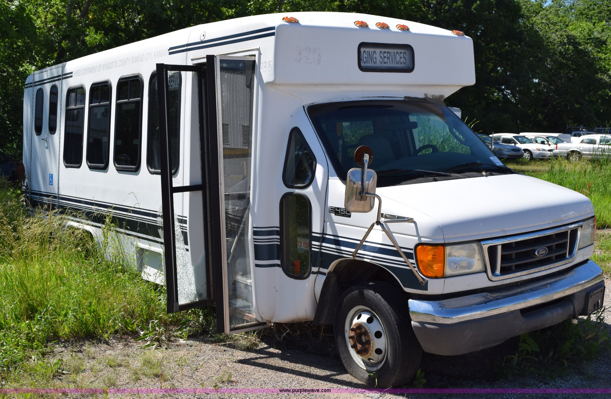 Purple Wave is selling a used Bus in Kansas. This item is a 2003 Ford Econoline E450 bus with the following: 234,017 miles on odometer, 7.3L V8 diesel engine, Automatic transmission, AC and heat, Tilt, Cruise, Manual windows and locks, Power seat, Vinyl interior, Block heater, 225/75R16 tires, Unknown operating condition, Diamond coach body, 16 pass with wheelchair lift, Electric doors, Unknown operating condition, Unit # 325