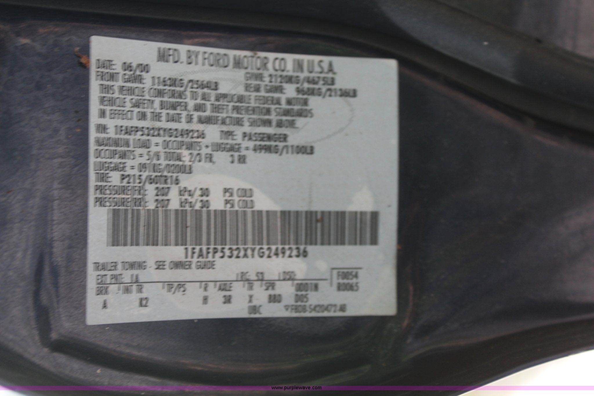 Purple Wave is selling a used Passenger Vehicle in Kansas. This item is a 2000 Ford Taurus with the following: 140,350 miles on odometer, 3.0L V6 OHV 12V FFV gas engine, Automatic transmission, AC and heat, Tilt, Cruise, AM/FM/cassette, Power windows, locks, mirrors, and seat, Cloth interior, 215/60R16 tires, Interior/exterior cosmetic damage, Hail damage, Engine knocks, will not stay running, Unit # 210