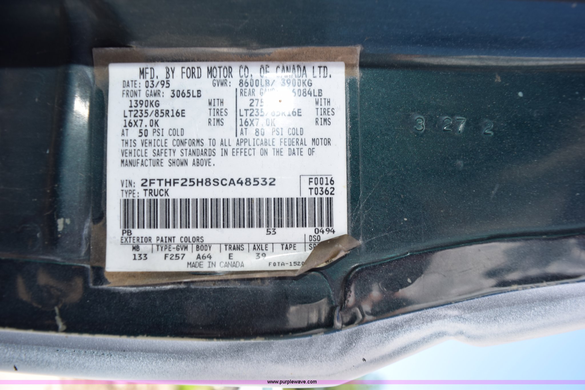 1995 Ford F250 pickup truck. 153,772 miles on odometer, V8 5.8L gas engine, Automatic transmission, Heat, Tilt, Cruise, AM/FM, Manual windows and locks, Vinyl interior, 235/85R16 tires, Interior/exterior cosmetic damage, Dents , Rust, Runs rough. 2FTHF25H8SCA48532. Unified Government of Wyandotte County. 5033 State Ave. Kansas City, KS 66102