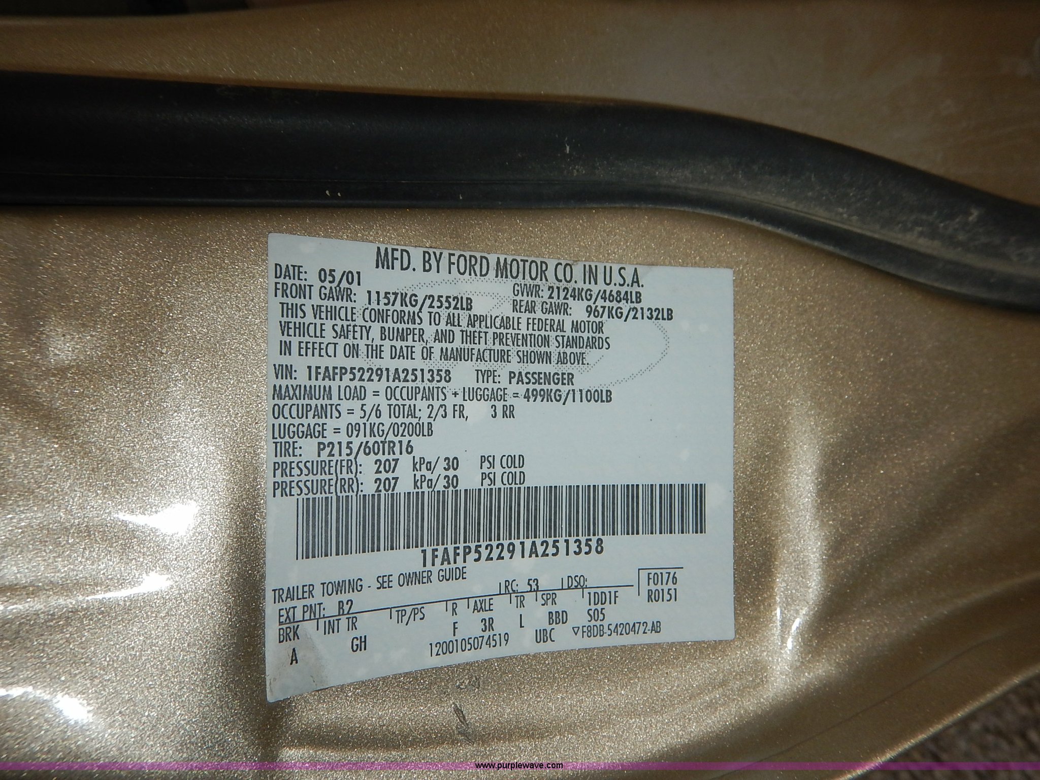 Purple Wave is selling a used Passenger Vehicle in Kansas. This item is a 2001 Ford Taurus LX with the following: 118,382 miles on odometer, 3.0L V6 OHV 12V FFV gas engine, Automatic transmission, AC and heat, Tilt, Cruise, AM/FM, Power windows, locks, and mirrors, Cloth interior, 215/60R16 tires, Rust, Dead battery, One spark plug wire missing, Decals will be removed prior to auction, Unit# 19
