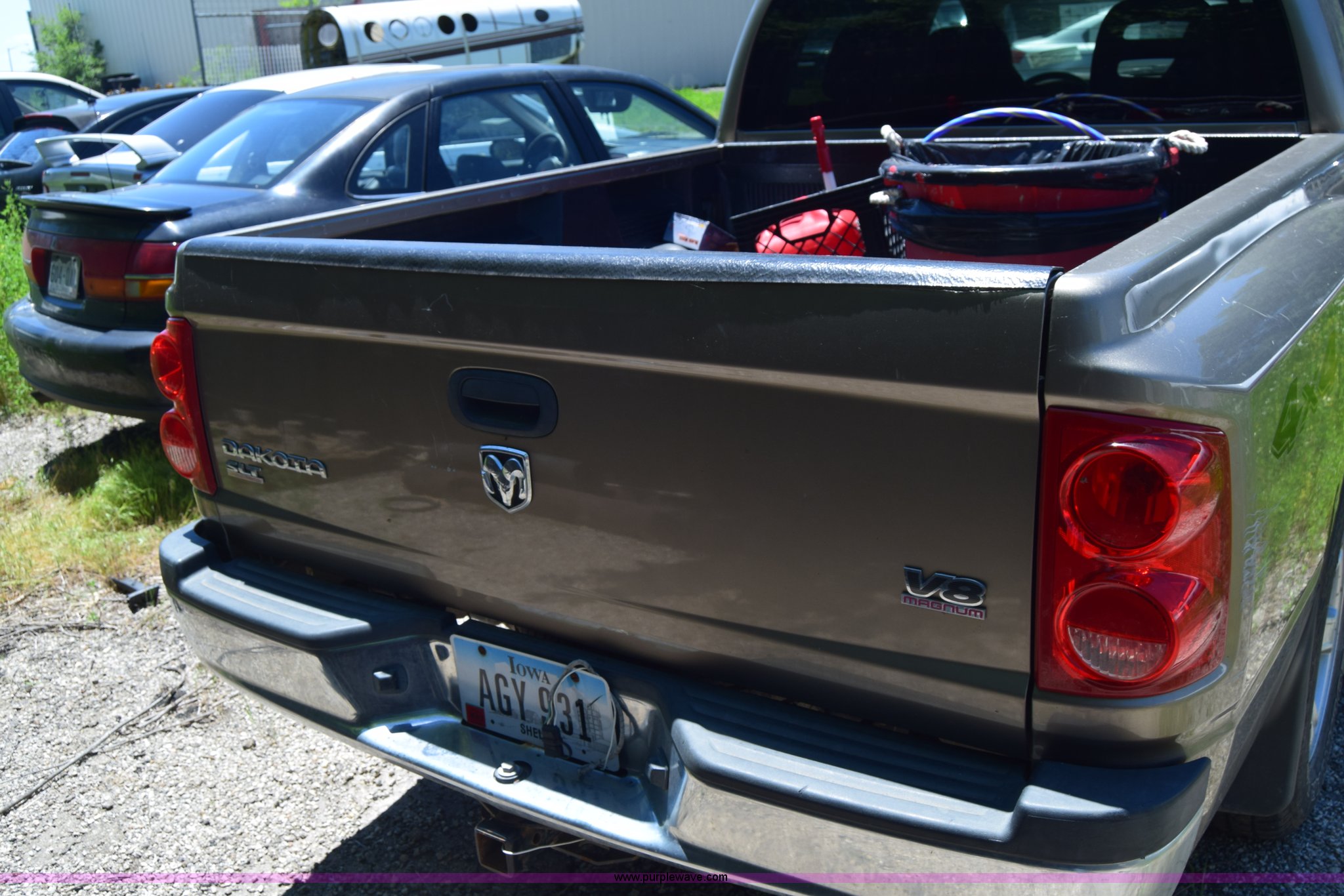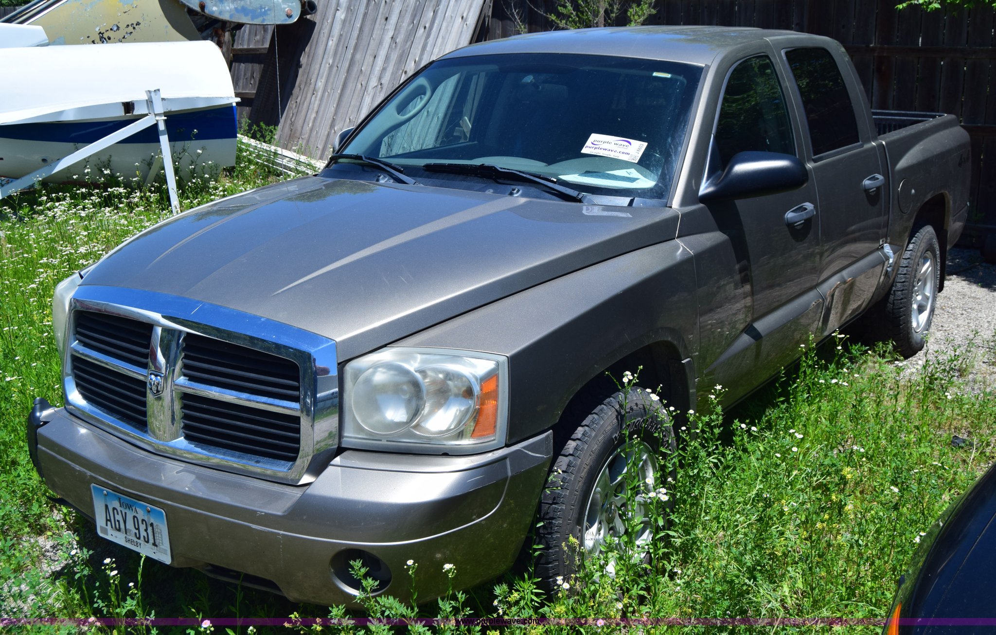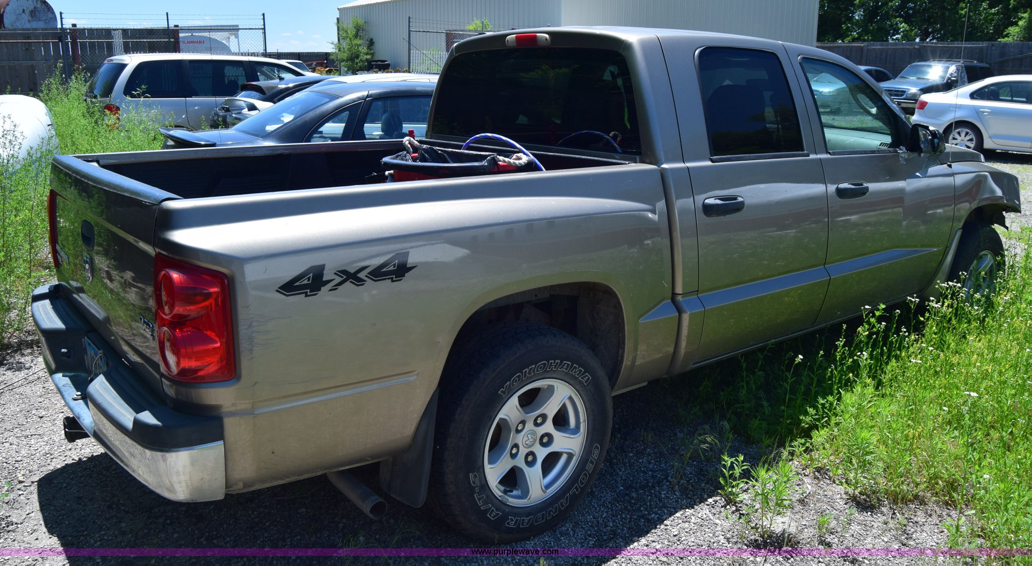 Purple Wave is selling a used Compact Pickup or Van in Kansas. This item is a 2006 Dodge Dakota SLT Quad Cab pickup truck with the following: Unknown miles on odometer, 4.7L V8 SOHC 16V gas engine, Automatic transmission, Four wheel drive, AC and heat, Tilt, Cruise, AM/FM/CD, Power windows and locks, Cloth interior, Bed liner, Receiver hitch, 245/70R16 tires, Interior/exterior cosmetic damage, Dents, Scratches, Rust, Mirror damaged, Front bumper damage, Right fender damage, Battery dead, Contents included, Unknown operating condition