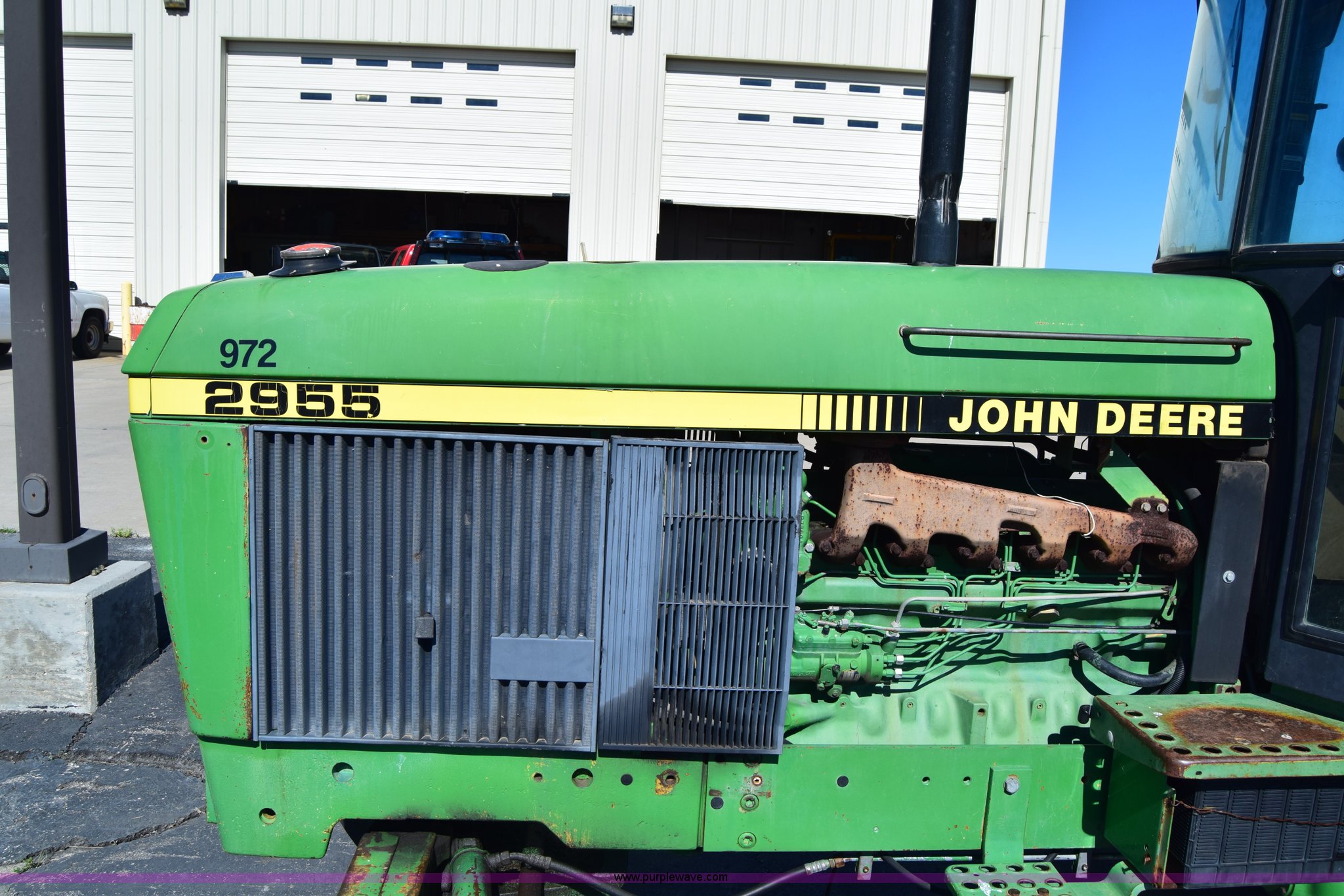 Purple Wave is selling a used Tractor in Kansas. This item is a 1990 John Deere 2955 tractor with the following: 3,734 hours on meter, John Deere 6359DL-009 six cylinder diesel engine, 97 HP, Serial CD6359D894313, Powershift transmission, 16F-8R gears, Enclosed cab, Serial CGS6037126794, AC and heat, Non-operational AC, Suspension seat, Three point, Draw bar, 540 PTO, (3) rear hydraulic remote sets, 102" wheelbase, 10.00-16 front tires, 16.9-38 rear tires, 10,845 lbs. base operating weight, Hydraulic pump up front is leaking, Electrical issue with fuse box, Problems starting, Serial XL02955T712292