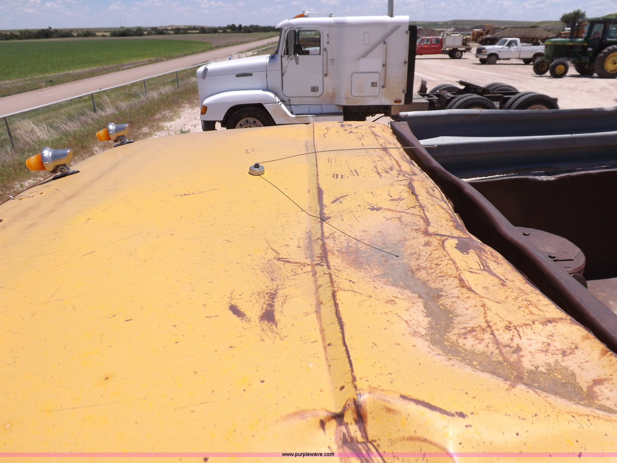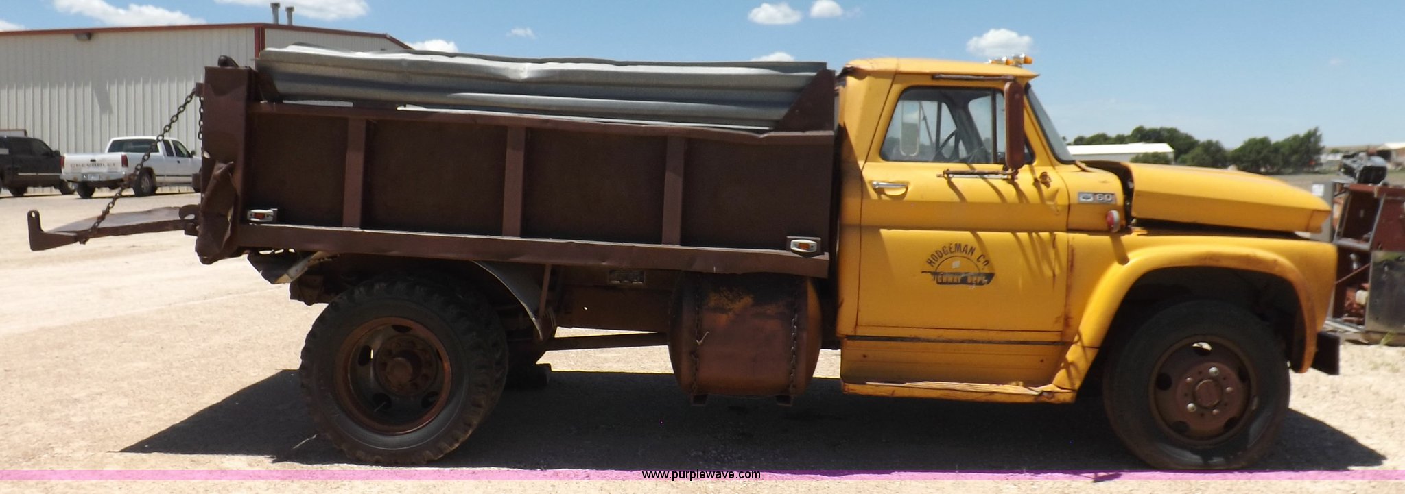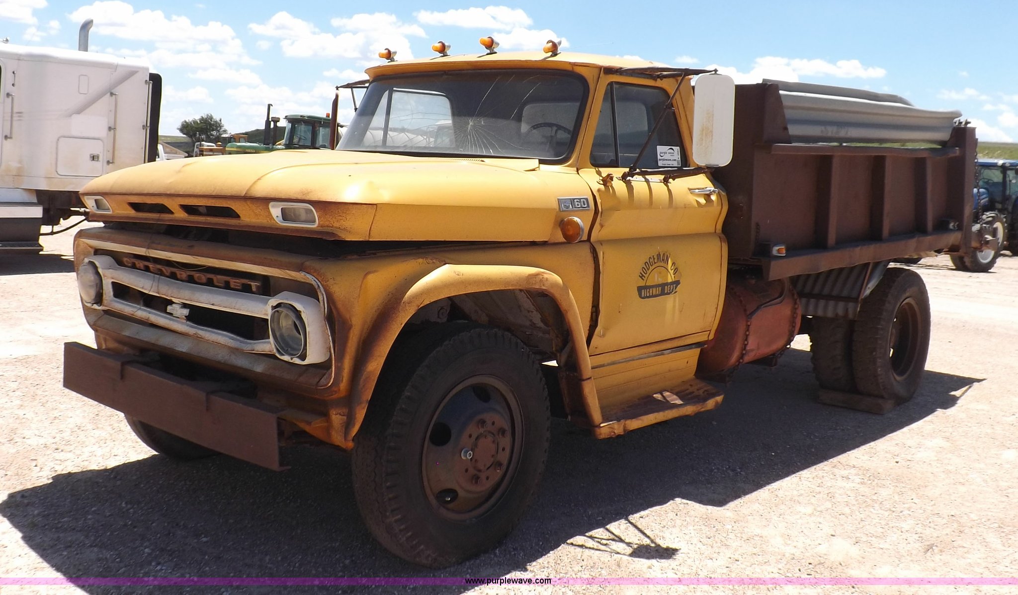 1965 Chevrolet C60 dump truck. 77,857 miles on odometer, Chevrolet six cylinder gas engine, Four speed manual transmission, Two speed rear end, PTO, 10'L x 7'W steel dump bed 34"H sides, Single ram hoist, Manual end gate, Dual fuel tanks, Spring suspension, Hydraulic brakes, 156" wheelbase, 8.250-20 tires, Interior/exterior cosmetic damage, Windshield broken, Right side door glass broken, Hood sprung, Dents, Rust, Non-operational unit, Must be towed or hauled. C6335J126317. Hodgeman County. 28561 SE L Rd. Jetmore, KS 67854