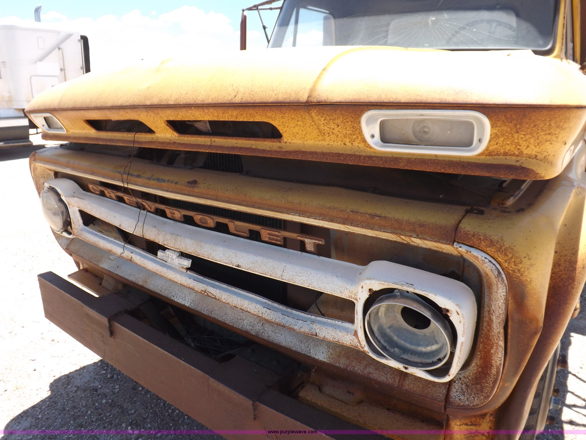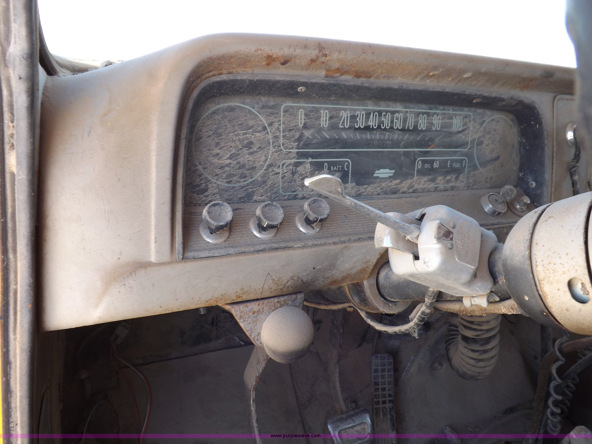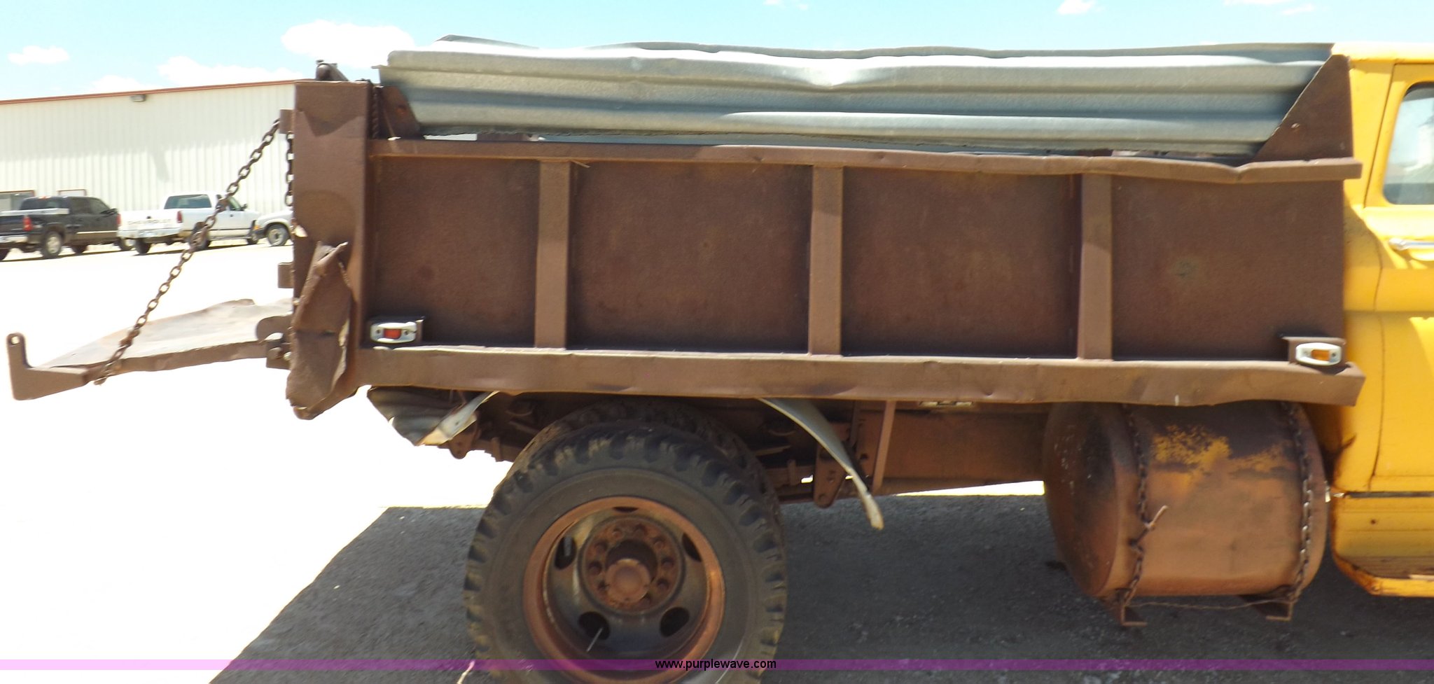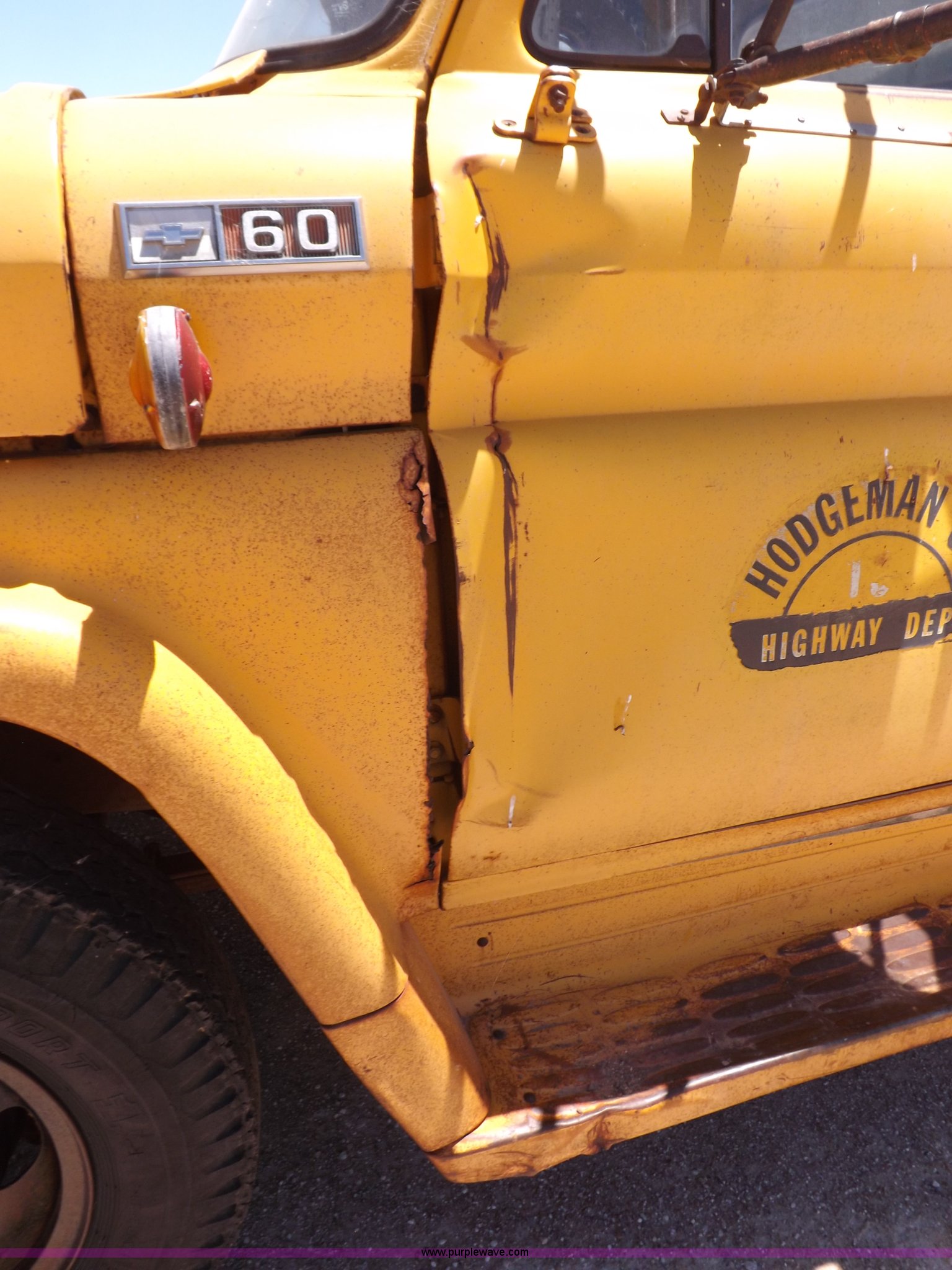 Purple Wave is selling a used Construction Dump Truck in Kansas. This item is a 1965 Chevrolet C60 dump truck with the following: 77,857 miles on odometer, Chevrolet six cylinder gas engine, Four speed manual transmission, Two speed rear end, PTO, 10'L x 7'W steel dump bed, 34"H sides, Single ram hoist, Manual end gate, Dual fuel tanks, Spring suspension, Hydraulic brakes, 156" wheelbase, 8.250-20 tires, Interior/exterior cosmetic damage, Windshield broken, Right side door glass broken, Hood sprung, Dents, Rust, Non-operational unit, Must be towed or hauled